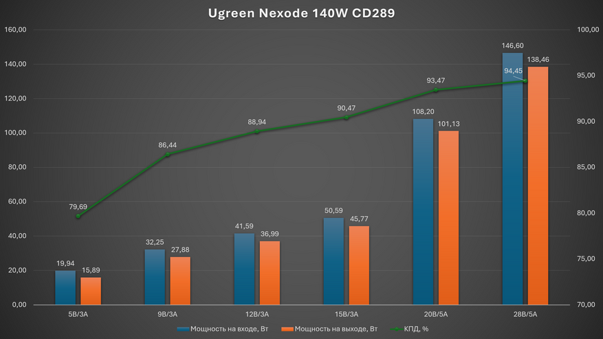 Эффективность зарядки Ugreen Nexode 140W CD289 на высоких мощностях действительно впечатляет — это хорошо видно по графику. На максимуме, при 28 В и 5 А (примерно 140 Вт), устройство показывает КПД 94,45%. При привычных для мощных зарядок 20 В и 5 А (около 101 Вт) эффективность всё ещё очень высокая — 93,47%. Для блока такого класса это отличный результат. Эффективность растёт довольно ровно: поднял напряжение и нагрузку — получил более высокий КПД. На максимальных режимах потери минимальные, и это заметно по всей кривой — она поднимается практически линейно. То есть зарядка раскрывается именно тогда, когда от неё требуют по-взрослому, и в тяжёлых режимах работает даже эффективнее, чем на средних.