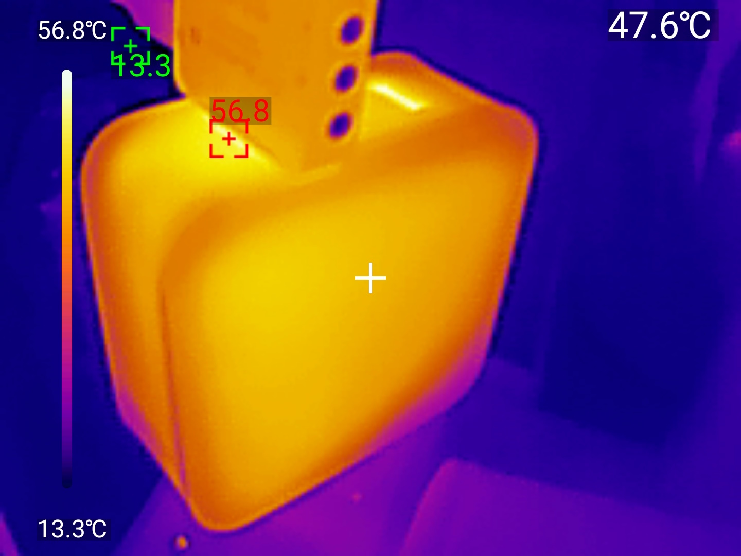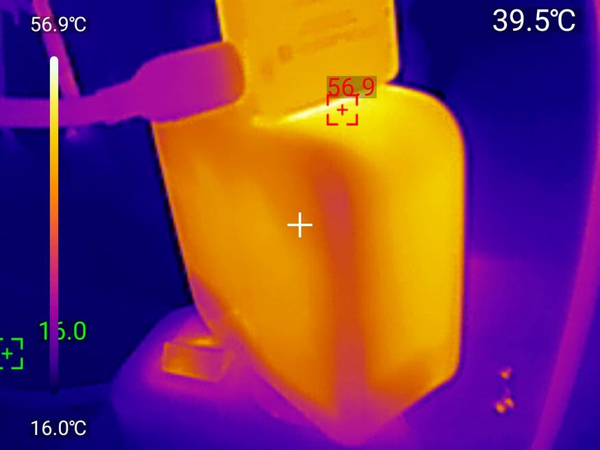 Во время теста на максимальной нагрузке зарядное устройство демонстрирует высокую стабильность выходных параметров на протяжении всего 30-минутного интервала, что свидетельствует об эффективной реализации протокола USB PD и качественной работе внутренних компонентов. Что касается нагрева, тепловые изображения фиксируют температуру корпуса до 48°C, что, хотя и является заметным нагревом, остается в пределах нормы для современных высокомощных GaN-зарядных устройств, работающих в режиме, близком к максимальной мощности (140 Вт), поскольку большая мощность неизбежно приводит к большим тепловым потерям при преобразовании, но такая температура не является критической и отражает ожидаемое выделение тепла при непрерывной полной нагрузке.