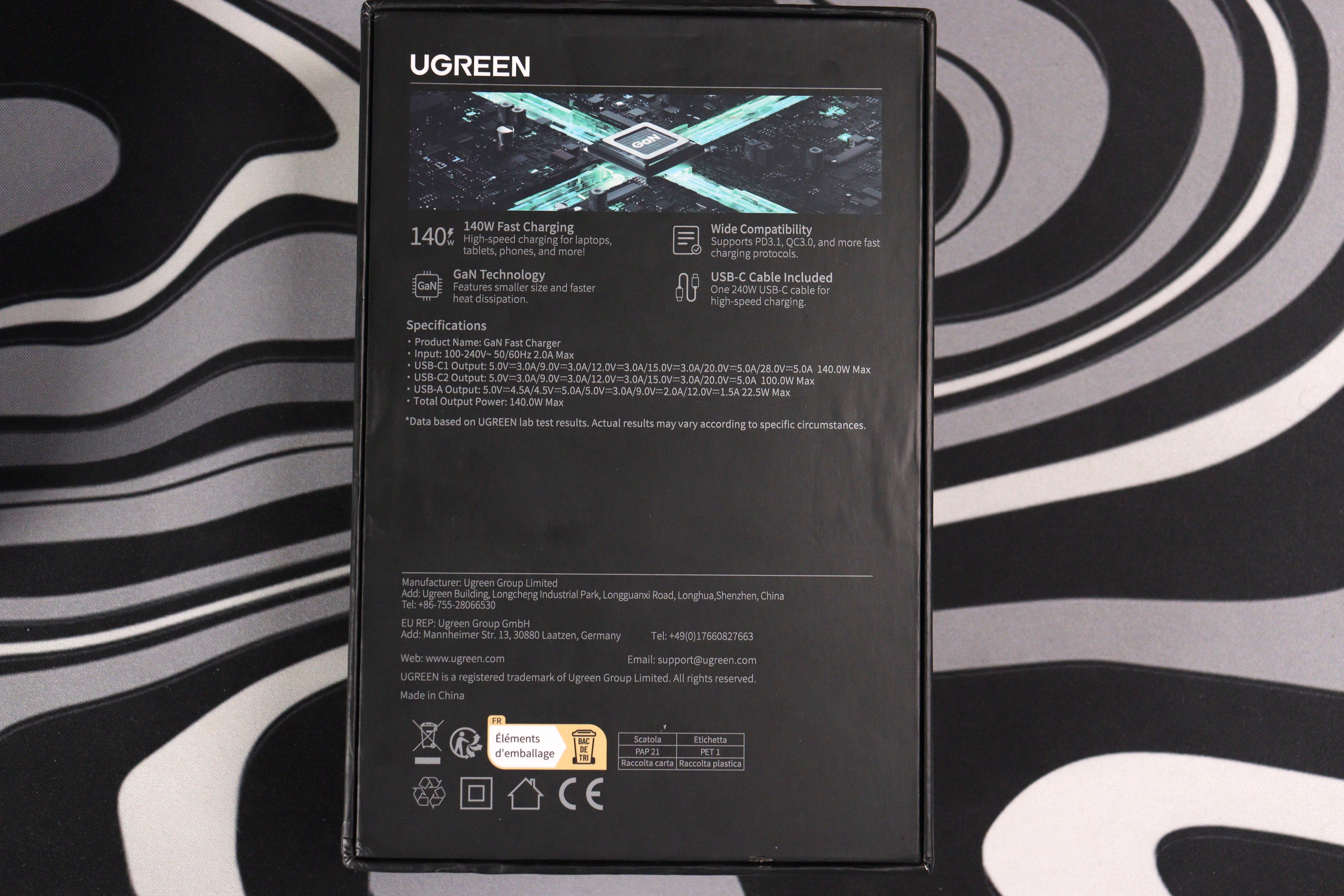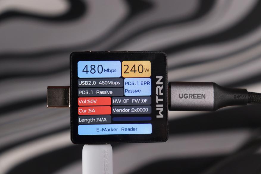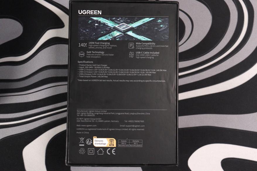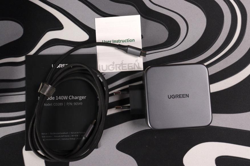 В коробке всё предельно минималистично. Само зарядное, USB-C кабель на 240 ватт длиной полтора метра и инструкция, которую никто не читает. Кабель приятно удивил — плотная оплётка, качественные коннекторы, не какая-то дешёвка. Судя по маркировке, он способен передавать все 240 ватт по стандарту USB PD 3.1 EPR, хотя само зарядное ограничено 140 ваттами.