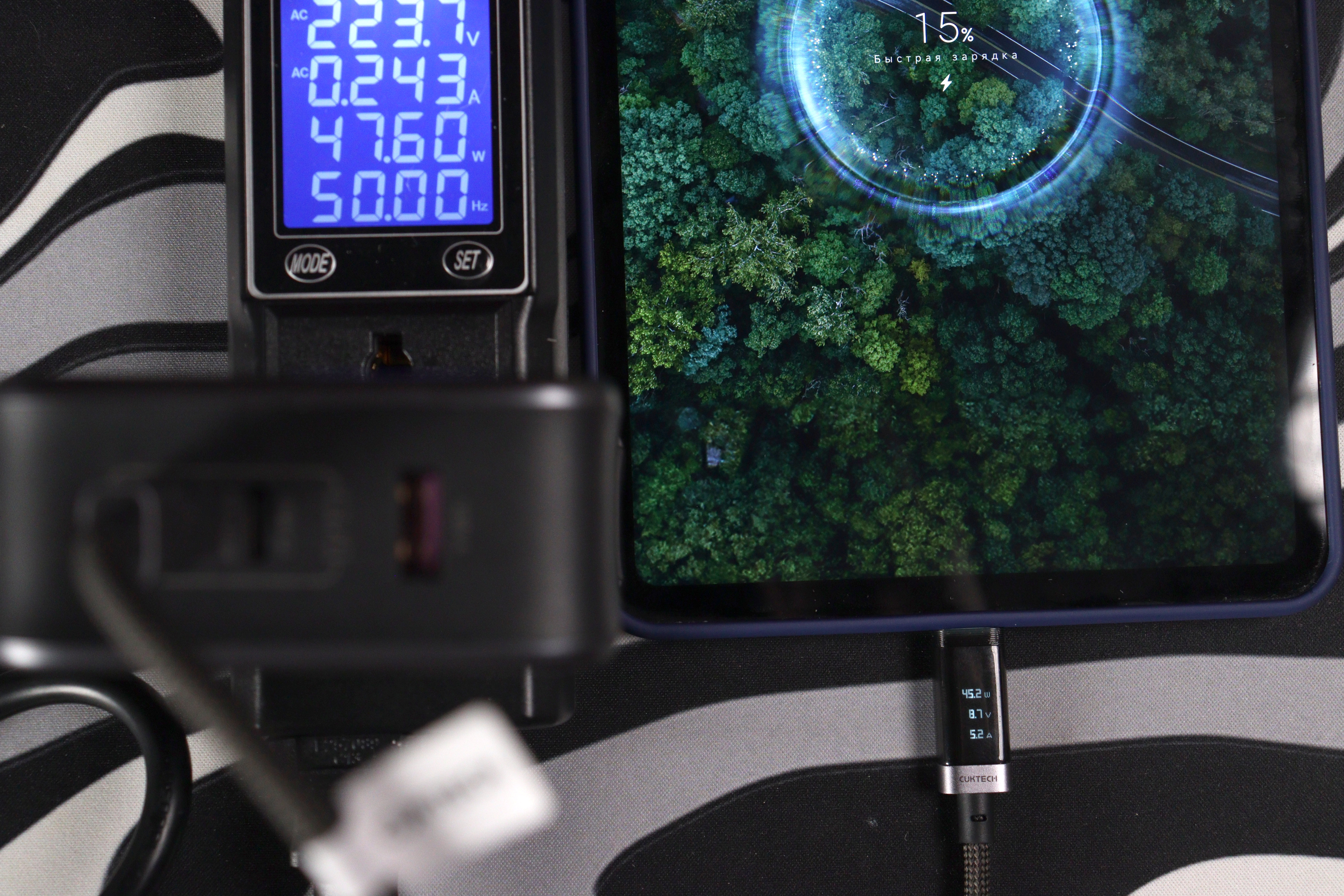В случае практического использования был выбран достаточно привередливое устройство — планшет от Xiaomi, способный быстро заряжаться либо по протоколу PD PPS, либо по фирменному от Mi. Дополнительно использовался кабель способный пропускать до 6А, чтобы не было ограничений на зарядке. Как видно из изображения ниже, планшет в обоих случаях ограничивается 5А (максимум на что способно данное зарядное устройство), что дает примерно 45Вт.
