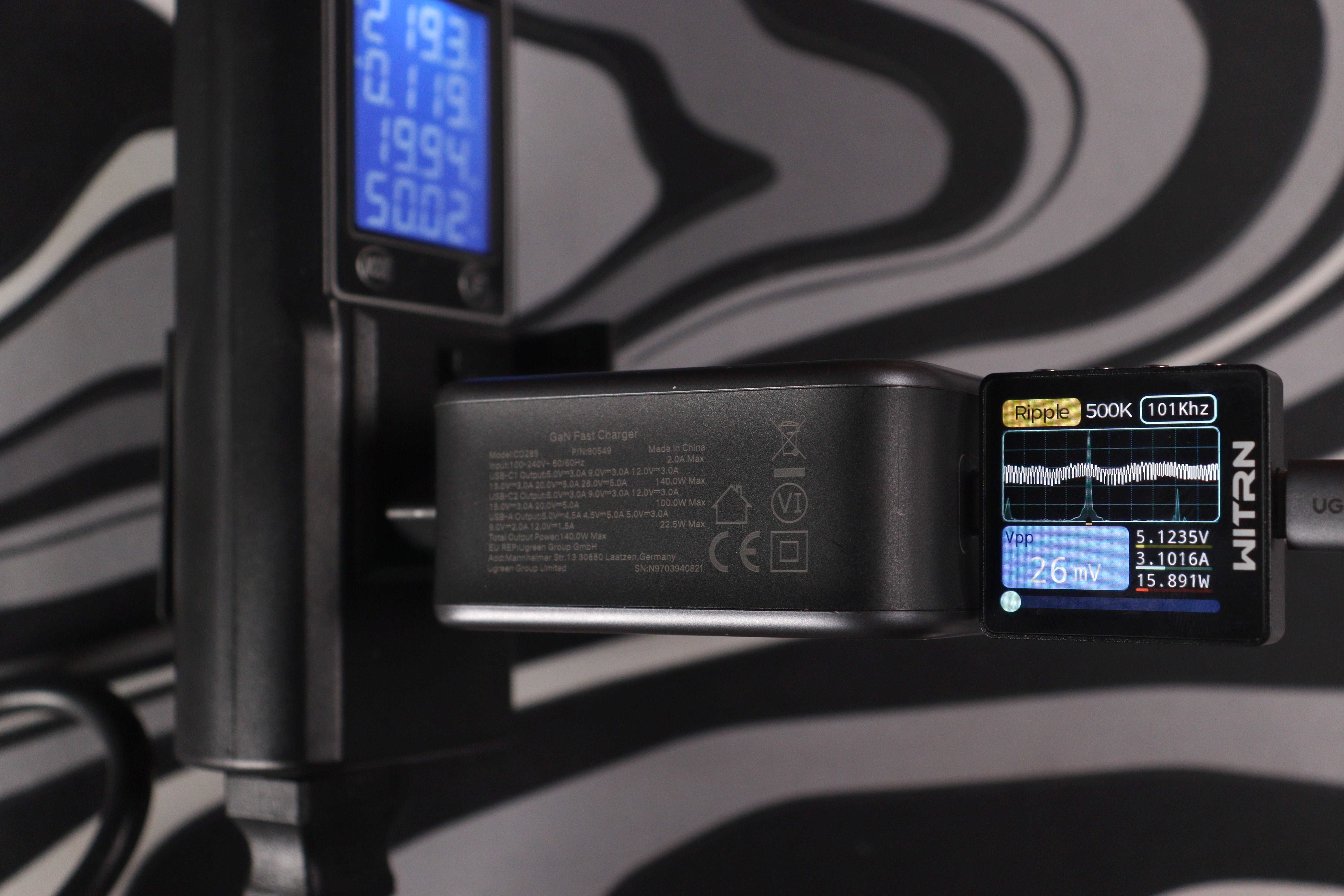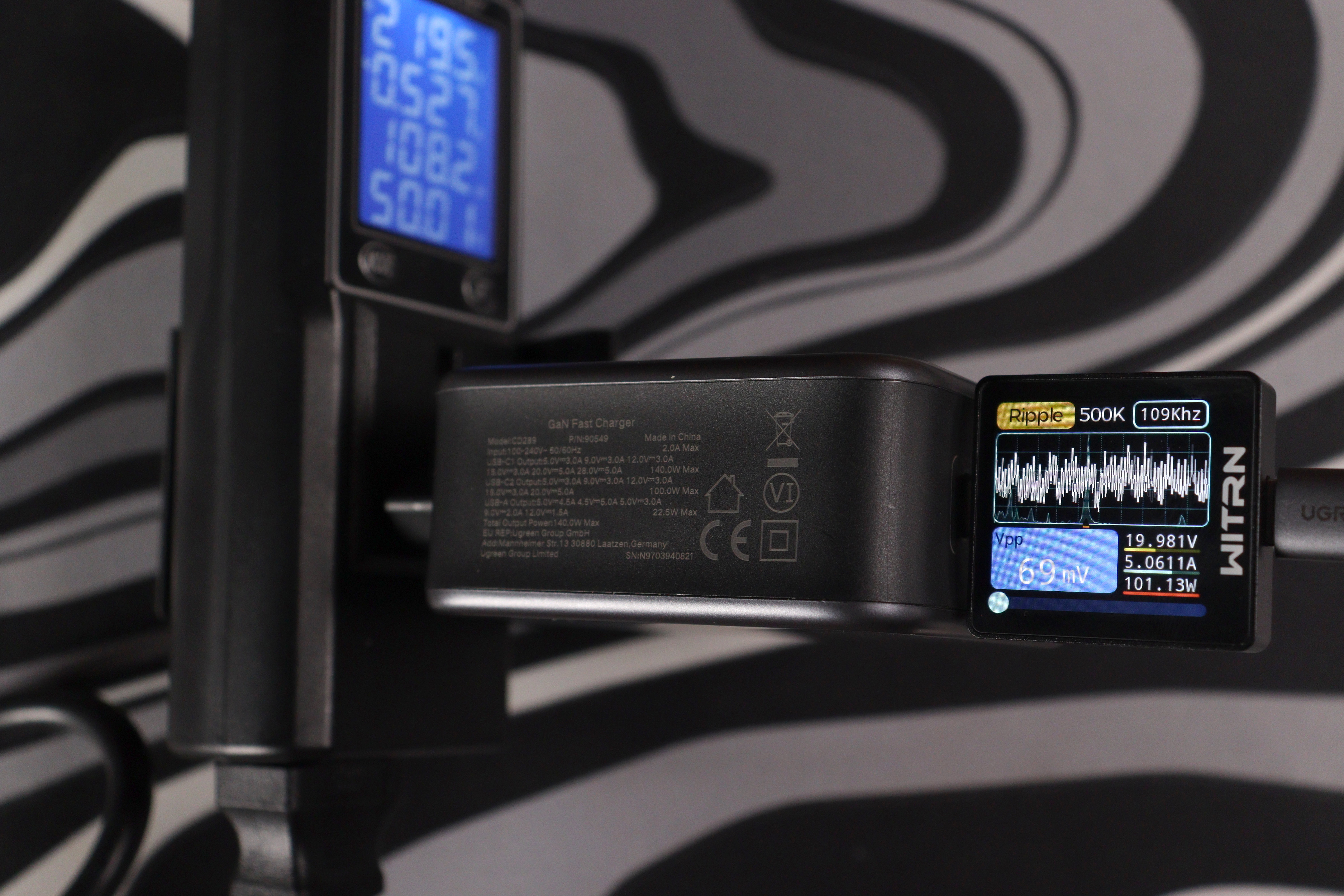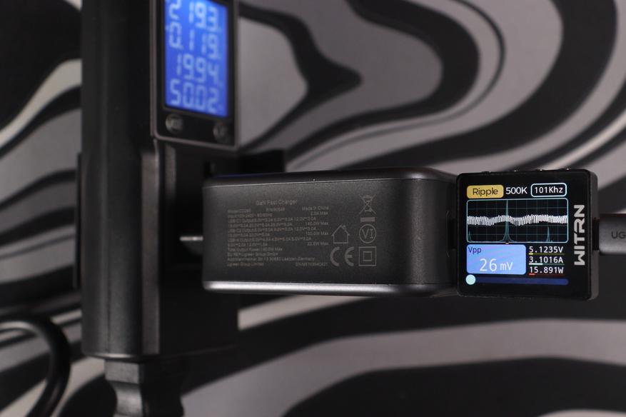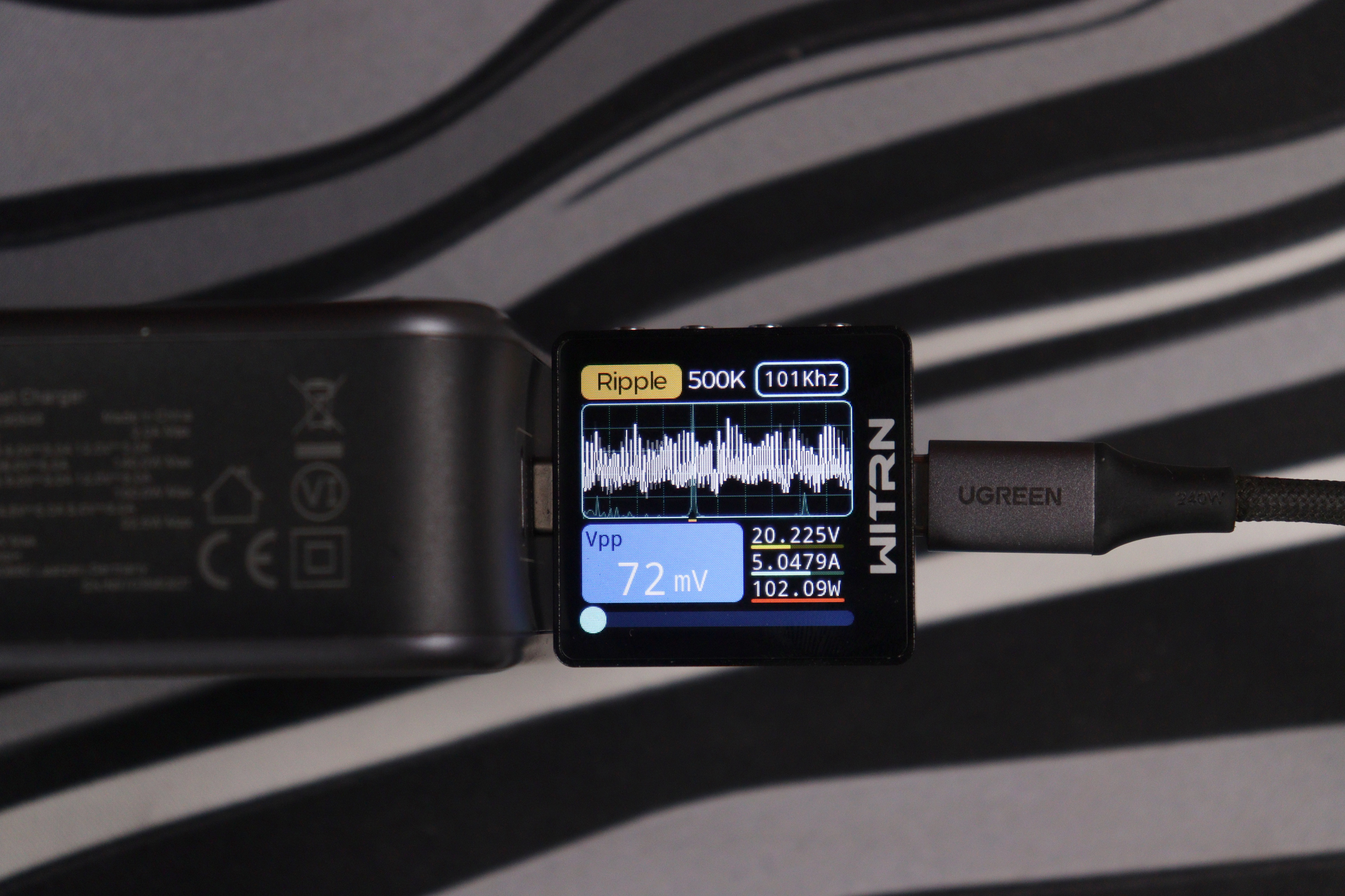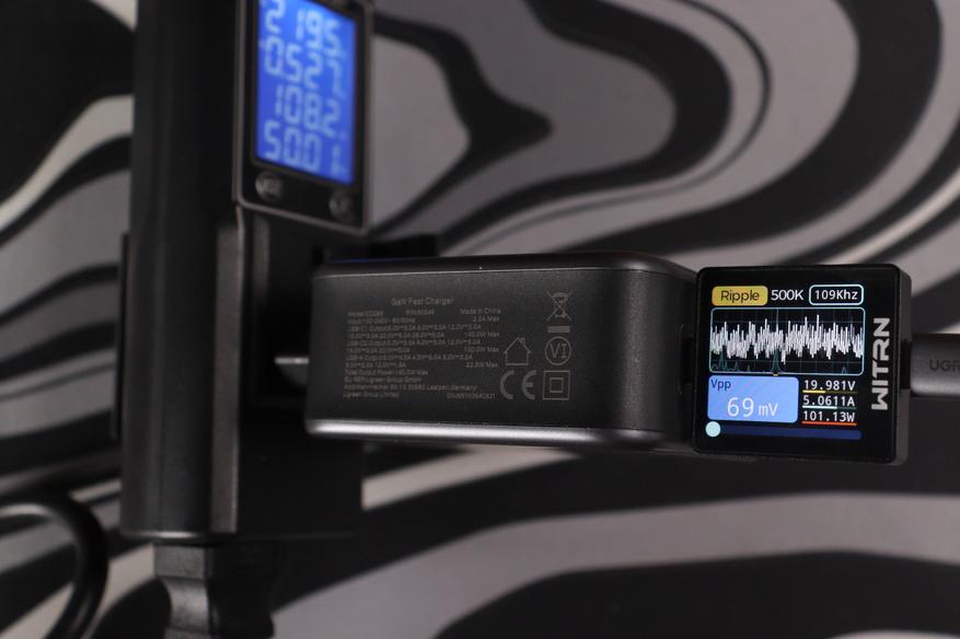Самая большая нагрузка — 20 вольт при 5 амперах (100 ватт). Тут пульсации достигли 69-72 милливольт при частоте около 101-109 кГц. Это всё ещё отлично — даже под максимальной нагрузкой зарядка держит пульсации на низком уровне.