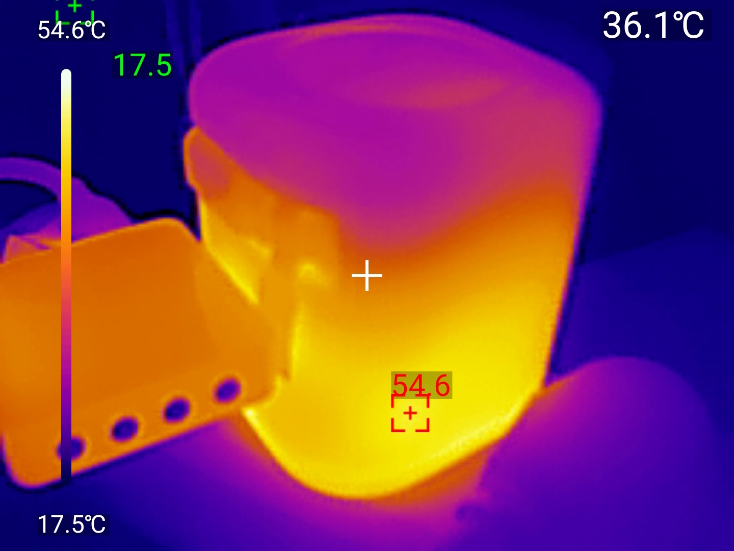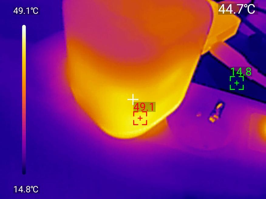 Тест с максимальной нагрузкой зарядное справляется без малейших проблем. После 30 минут работы на максимуме корпус прогрелся до 49-54°C, измеренного тепловизором UNI-T UTI261M, в самой горячей точке (возле катушки кабеля), что вполне нормально для GaN-зарядок. Обжечься невозможно, тепло рассеивается равномерно. Кабель и разъёмы остаются чуть тёплыми, не более 36-40°C.