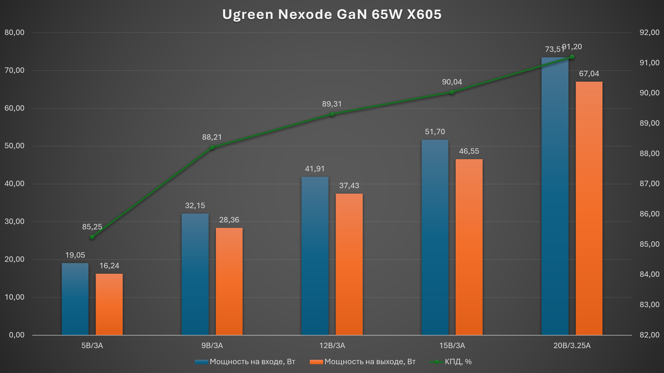 КПД Ugreen Nexode GaN 65W X605 растёт по мере увеличения напряжения: на 5В он держится около 85%, на 9В поднимается к 88%, при 12В почти дотягивает до 89 %, на 15В выходит на уровень примерно 90%, а максимум показывает на 20В — около 91 %. Для компактного GaN-зарядника это отличный результат: потерь мало, энергия почти полностью уходит в устройство, а не рассеивается впустую.