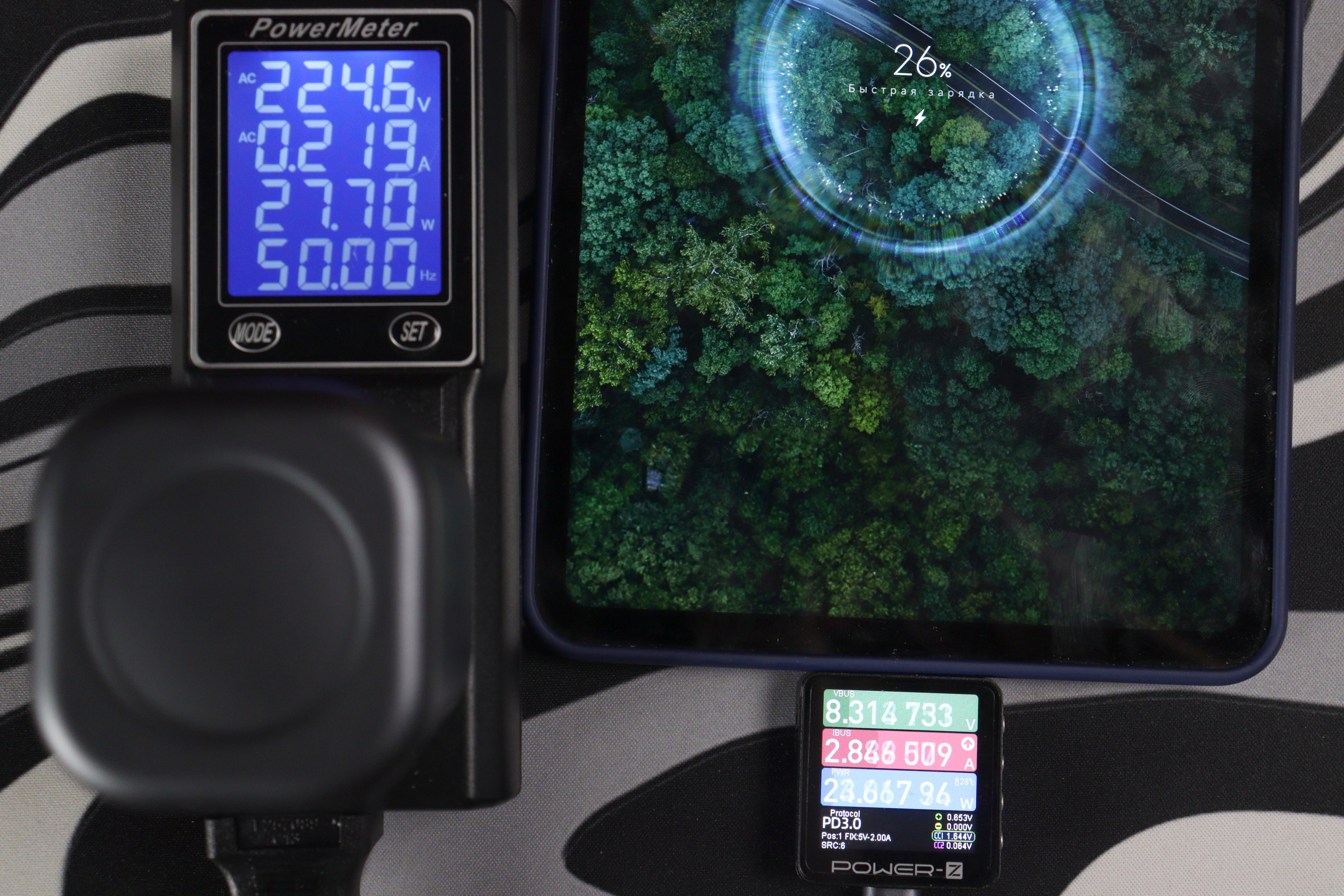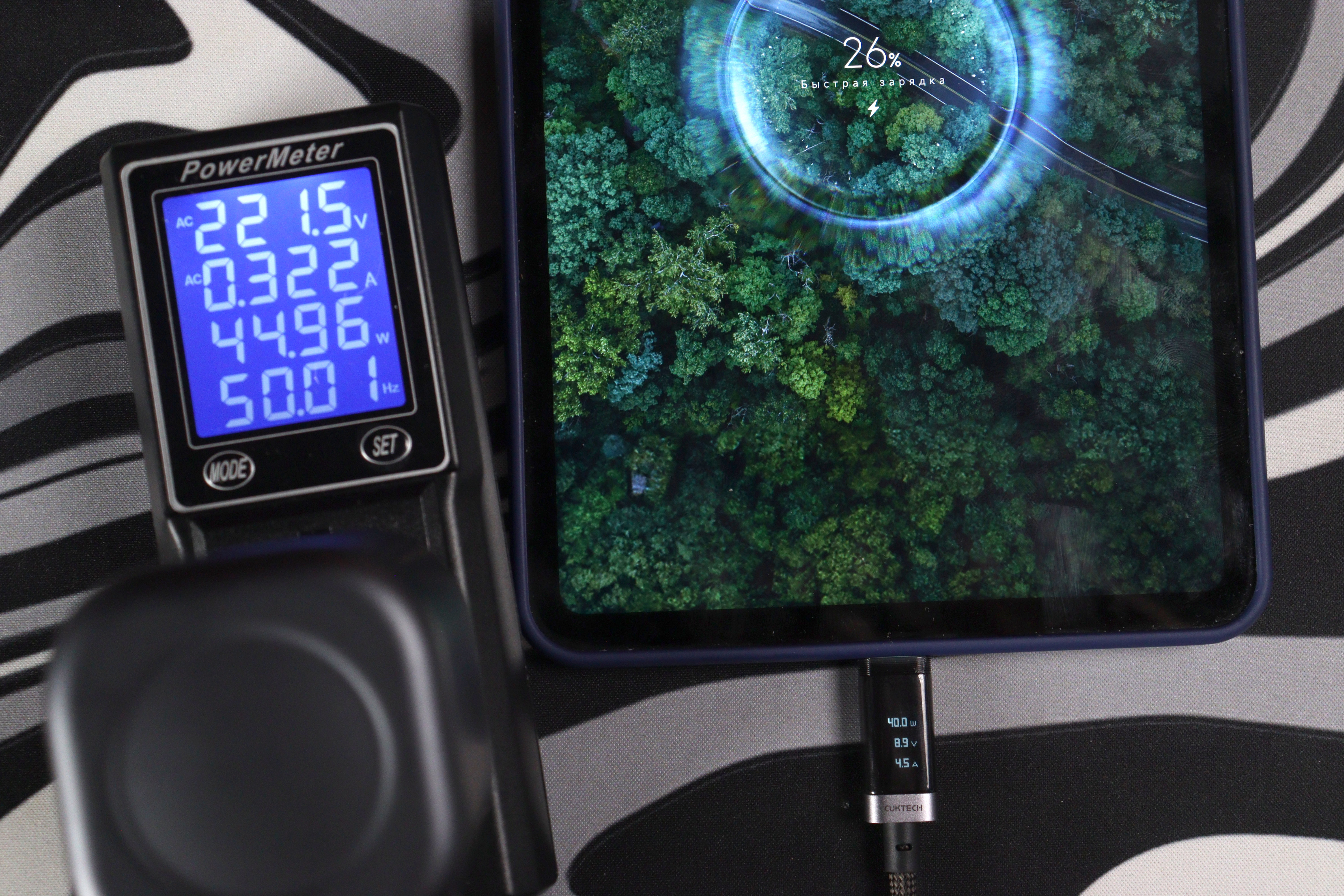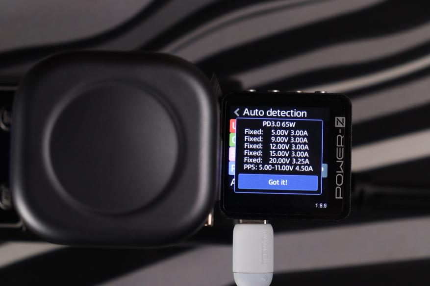 Протестировал все режимы быстрой зарядки. PD 3.0 работает безупречно, что соответствует заявлениям производителя. Планшет Xiaomi Pad Mini через встроенный кабель получил около 25 Вт (из-за ограничения тока в режиме PPS на уровне 3А, на 45Вт версии было ограничение в 2.75А), а через второй порт и кабель Cuktech No.6 — до 45 Вт. Смартфоны с поддержкой быстрой зарядки распознаются корректно, протоколы QC 3.0+, AFC, FCP срабатывают без проблем.