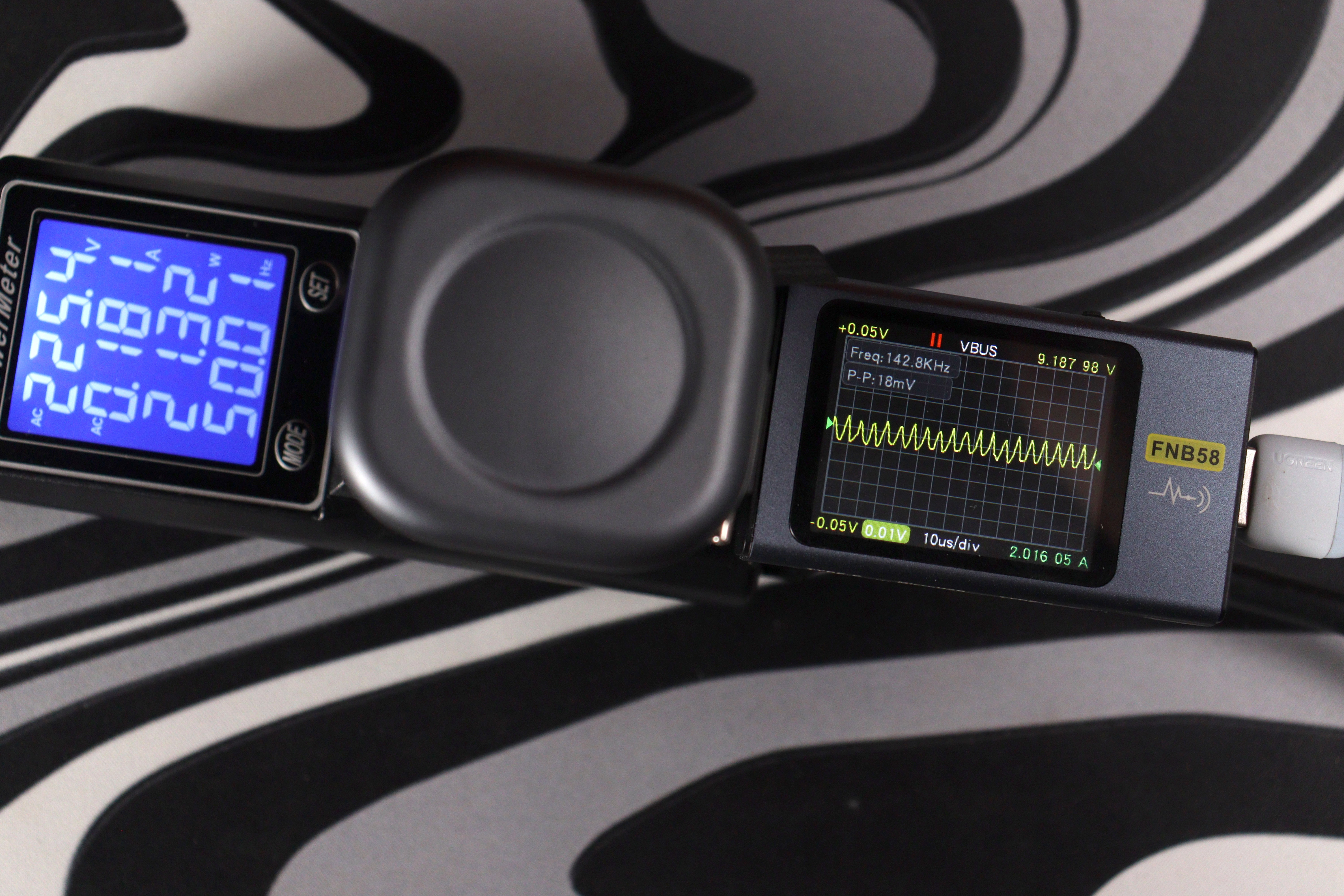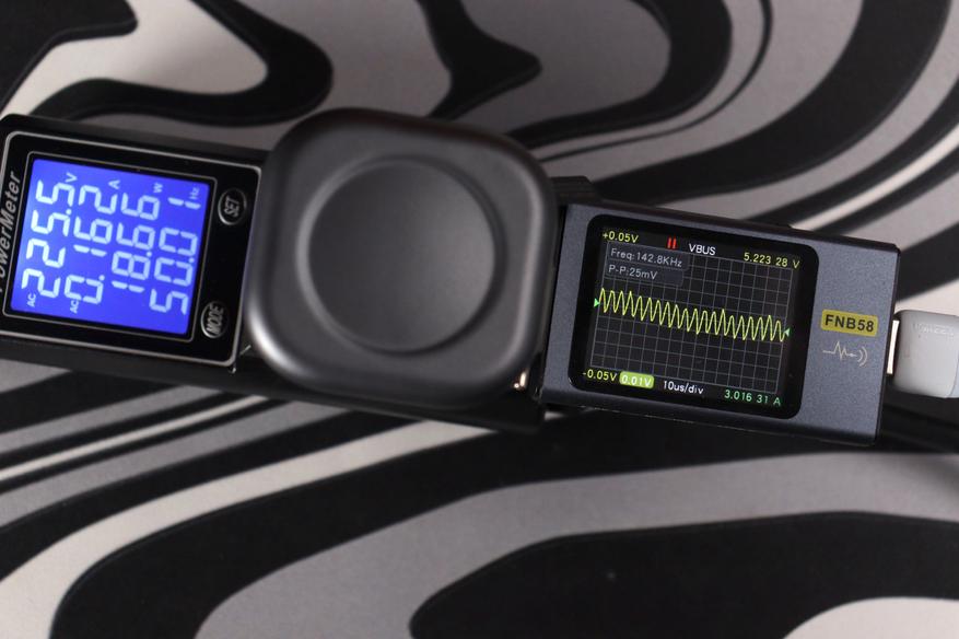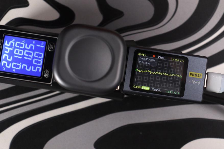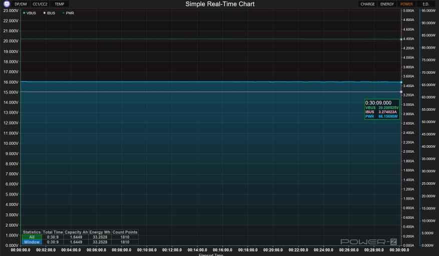 Заявленные 65 Вт — это не маркетинговая фантазия. Измерения показали реальную выходную мощность до 67 Вт через встроенный кабель при напряжении 20 В и токе около 3,3 А. При зарядке через порт USB-C результаты практически идентичные — 66-67 Вт стабильно. Просадок под нагрузкой не наблюдается, мощность держится чётко. Напряжение на выходе стабильное: 5.2-5.3 В для стандартной зарядки, 9.2 В, 12.2 В, 15.2 В, 20.2 В для профилей Power Delivery — всё в пределах допустимых отклонений. Пульсации были минимальные — размах около 10-25 мВ в зависимости от режима, что отличный результат и свидетельствует об использовании качественных сглаживающих фильтров на выходе.