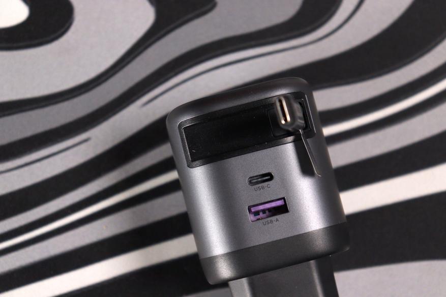 Главная фишка — выдвижной кабель USB-C, спрятанный в катушке сбоку. Механизм работает плавно, без рывков. Длины в 70 см хватает для большинства ситуаций, хотя для зарядки за столом иногда не хватает буквально 20 сантиметров. На торце расположены два дополнительных порта: USB-C с поддержкой Power Delivery и классический USB-A. Индикации работы нет. Сборка качественная, люфтов нет. Даже катушка с кабелем не дребезжит при встряхивании, вся компоновка плотная.