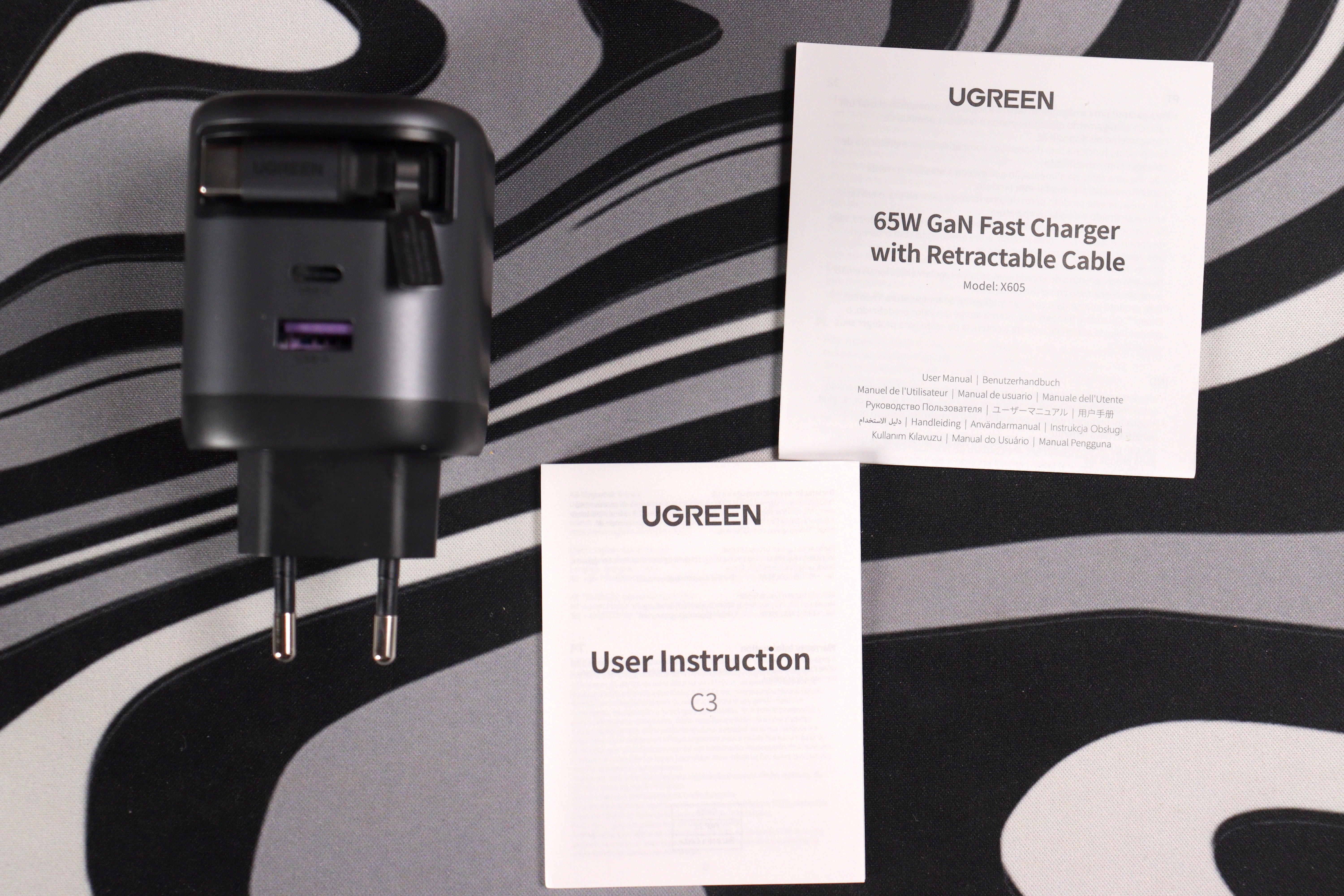 Внутри коробки всё скромно и по делу. Само зарядное устройство с уже встроенным кабелем-рулеткой, небольшая многоязычная инструкция — и всё. Никаких дополнительных проводов, чехлов или наклеек.