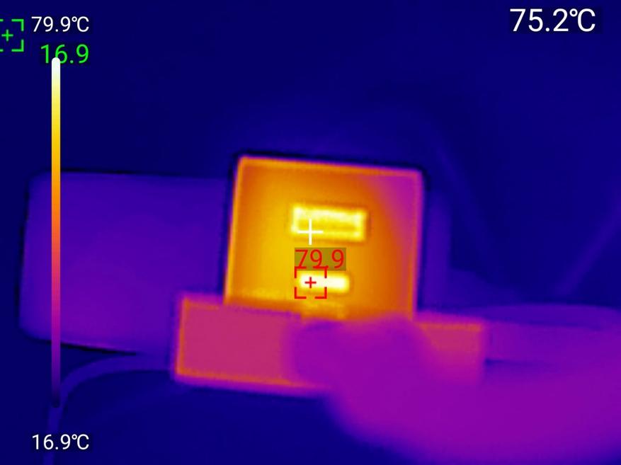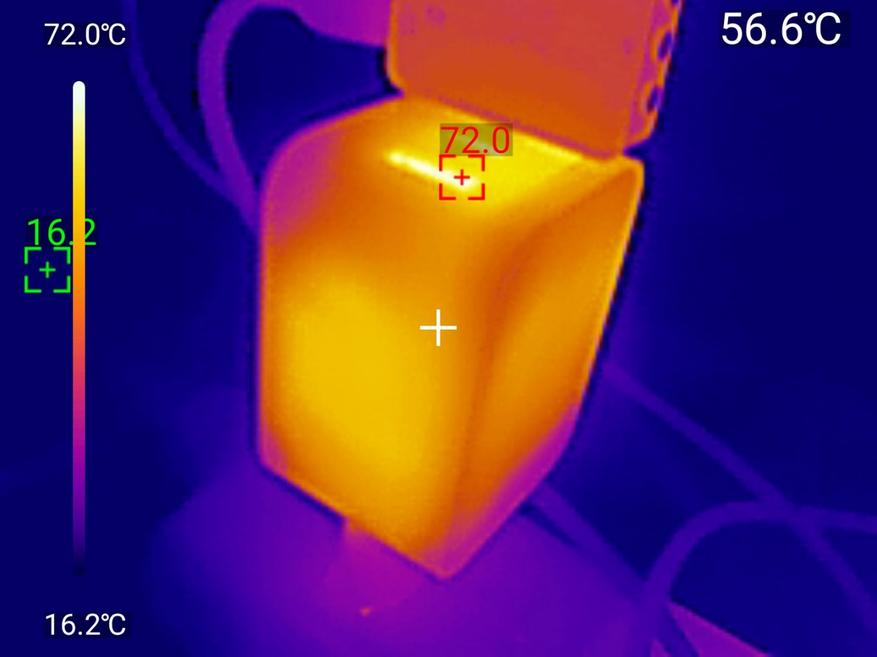Стабильность напряжения под нагрузкой отличная — график показывает ровную линию без провалов и скачков. За 30 минут теста напряжение держалось на уровне 19,5В с минимальными колебаниями, что говорит о качественной обратной связи в схеме преобразователя. Температурные замеры провёл с помощью тепловизора под продолжительной нагрузкой в 65 ватт — это реалистичный сценарий зарядки ноутбука. Через 30 минут непрерывной работы температура корпуса составила около 69,7°C в самой горячей точке.