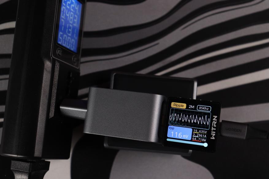 По части тестов, устройство демонстрирует, в целом, хорошие характеристики стабильности и мощности, подтверждая заявленный запас, поскольку легко отдаёт 64.7Вт при низких пульсациях 116 мВ на пределе. Однако, анализ выявил специфические недостатки: на порту USB-А в режиме 5В/3А были зафиксированы высокие пульсации в 222мВ, что превышает 4.4% от номинала 5В является самым слабым показателем. В то же время, на порту USB-С в режиме 5В/3А пульсации составили 84мВ, что также несколько великовато (более 1.6% от номинала), хотя и значительно лучше, чем у USB-C. В остальных, более высоковольтных режимах (9В, 12В, 15В, 20В), устройство показывает себя превосходно, удерживая пульсации в узком диапазоне 74 — 105 мВ, что свидетельствует о качественной стабилизации напряжения под более высокой нагрузкой.