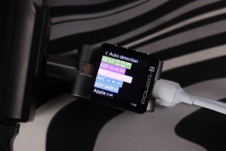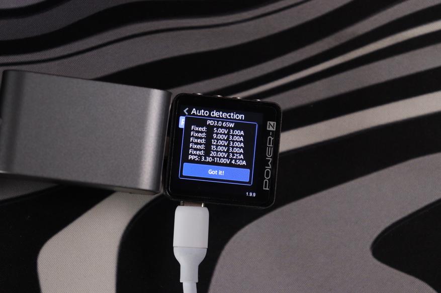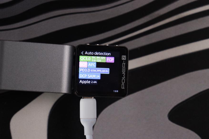 Зарядка поддерживает все современные протоколы быстрой зарядки: PD 3.0 с полным набором профилей (5В/3А, 9В/3А, 12В/3А, 15В/3А, 20В/3,25А), PPS (3,3-20В при 3,25А), а также QC3.0, FCP, AFC, DCP и Apple 2.4A для совместимости со старыми устройствами. При подключении нового устройства зарядка прекращается на секунду, после чего возобновляется.