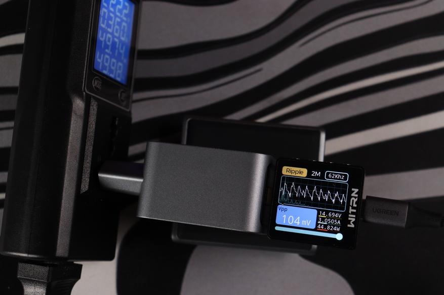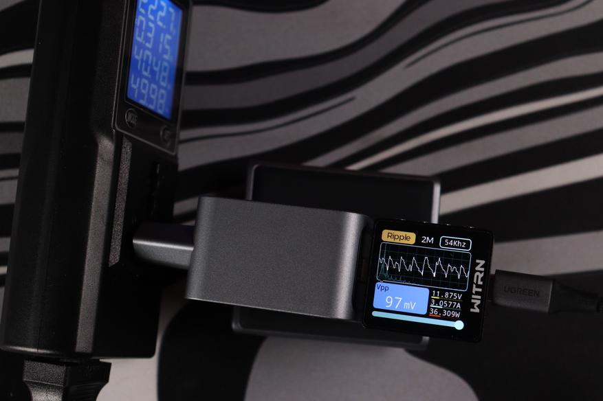 Однако есть и недостатки, которые нельзя игнорировать. Главная проблема — высокие пульсации в низковольтных режимах, особенно на порту USB-A: 222 мВ при 5В/3А это больше 4% от номинала, что выходит за пределы нормы. Порт USB-C на 5В показывает лучше (84 мВ), но тоже не идеально. Для быстрой зарядки смартфонов через высоковольтные режимы это не проблема, но если планируете заряжать старые гаджеты на 5 вольтах через USB-A, стоит учитывать этот момент. Ещё один нюанс — прерывание зарядки при подключении нового устройства может быть неудобным в некоторых ситуациях. В остальном зарядное показало себя с лучшей стороны.