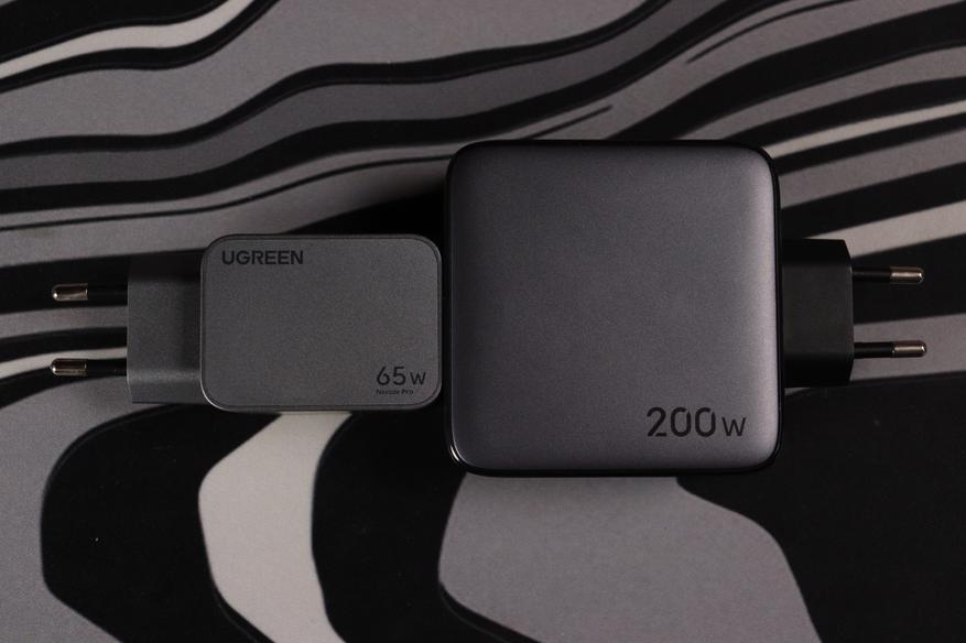 Первое впечатление — это же не 65 ватт, правда? Габариты Nexode Pro настолько скромные, что устройство спокойно теряется в ладони. Для сравнения положил рядом с 200-ваттной зарядкой — разница просто колоссальная, а ведь речь не о каком-то бюджетнике, а о полноценном GaN-адаптере с тремя портами с возможностью заряжать полноценно все современные портативные устройства, включая ноутбуки.