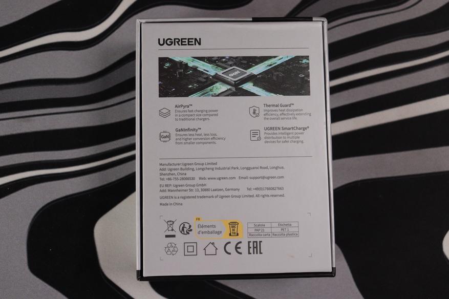 Всё строго по делу, без лишней мишуры. В коробке лежит само зарядное устройство и многоязычная инструкция. Кабеля в комплекте нет. Упаковка качественная, с матовым покрытием и информативным дизайном — сразу видны основные характеристики и преимущества устройства.