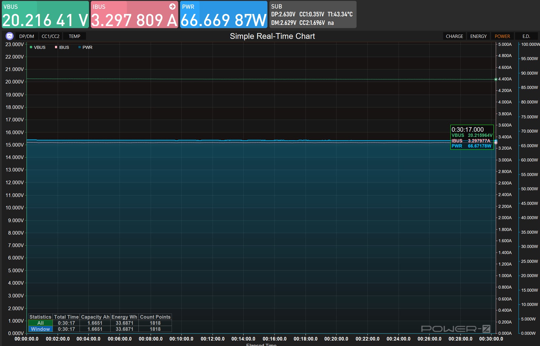 Тестировал все заявленные режимы по очереди. На 5V устройство держало стабильные 3.07A (около 16W), на 9V — 3.06A (28W), на 12V — 3.05A (37.5W), на 15V — 3.05A (46.5W) и на 20V — полные 3.3A (66W). Просадка напряжения минимальная — в пределах 0.1V, что нормально для любой зарядки под нагрузкой.