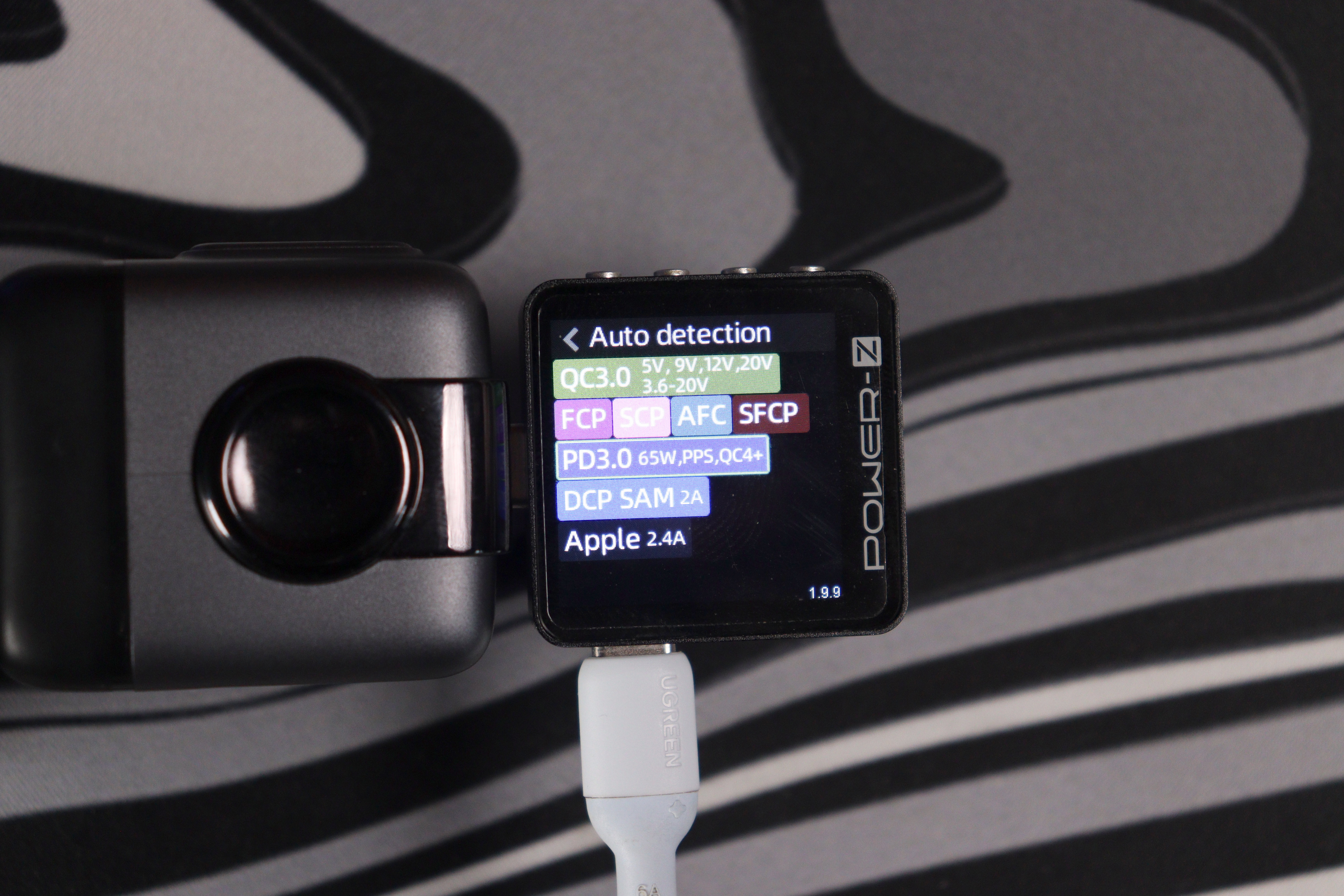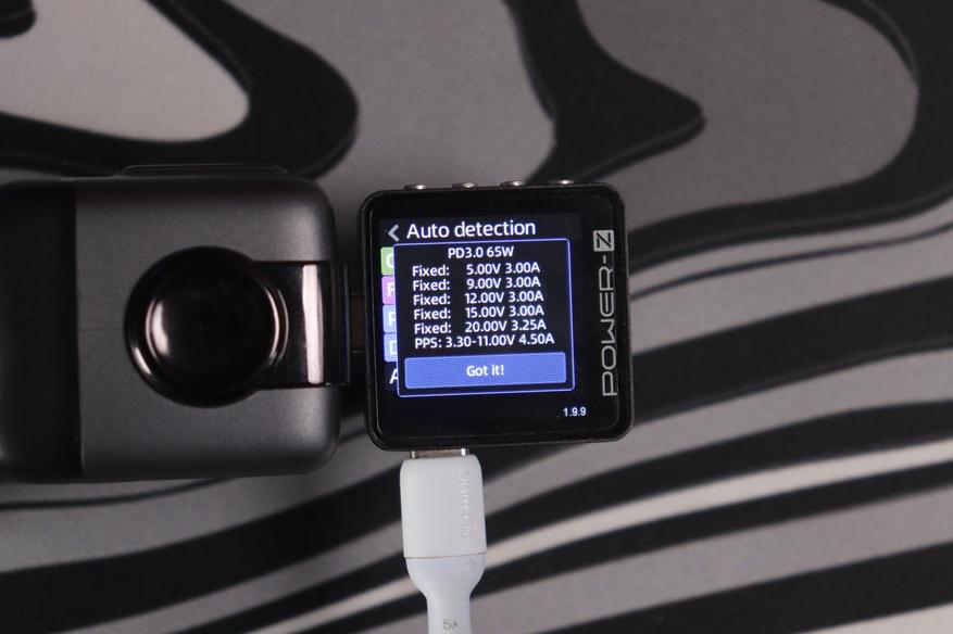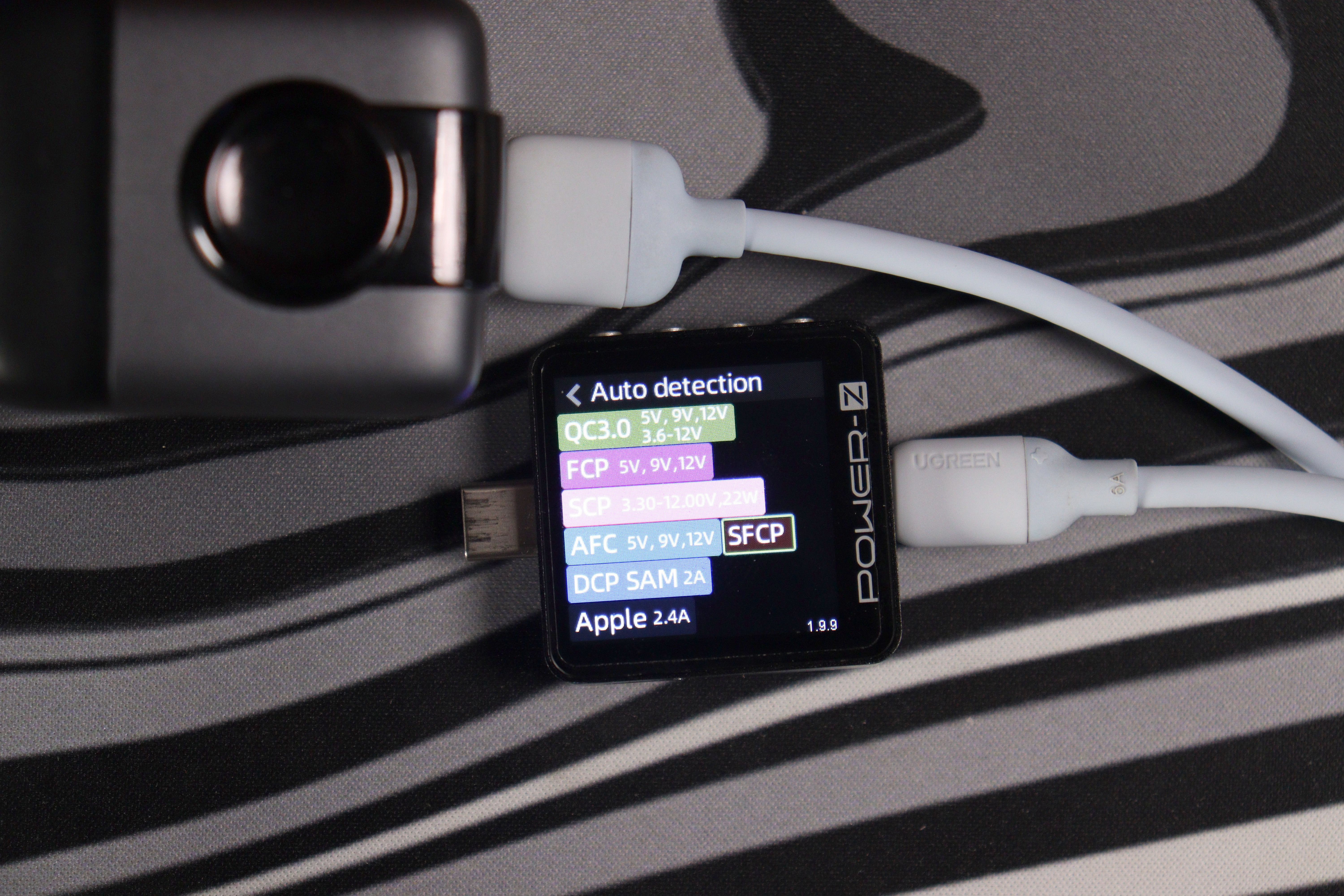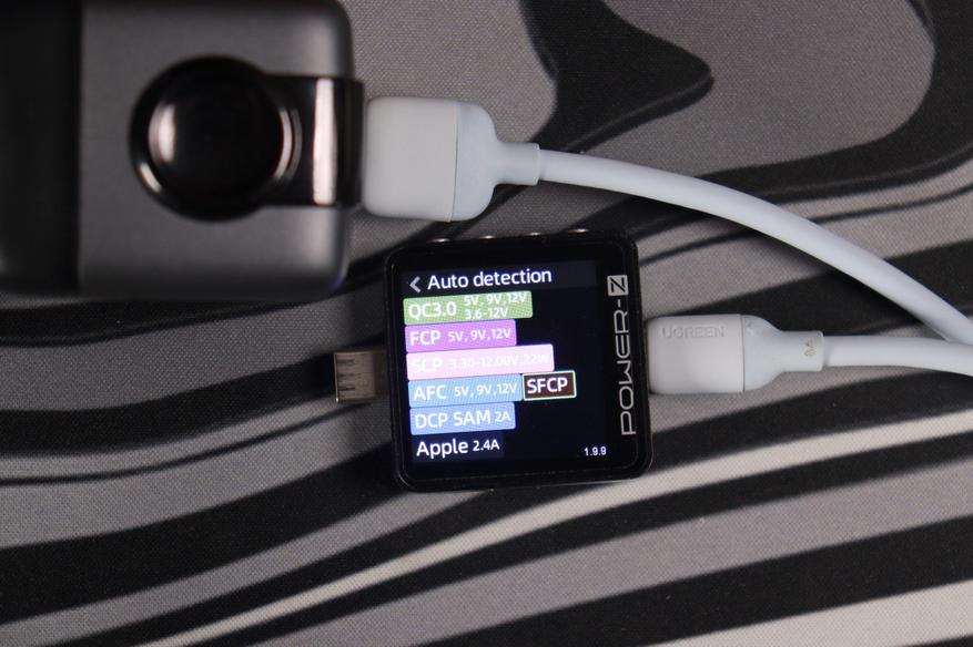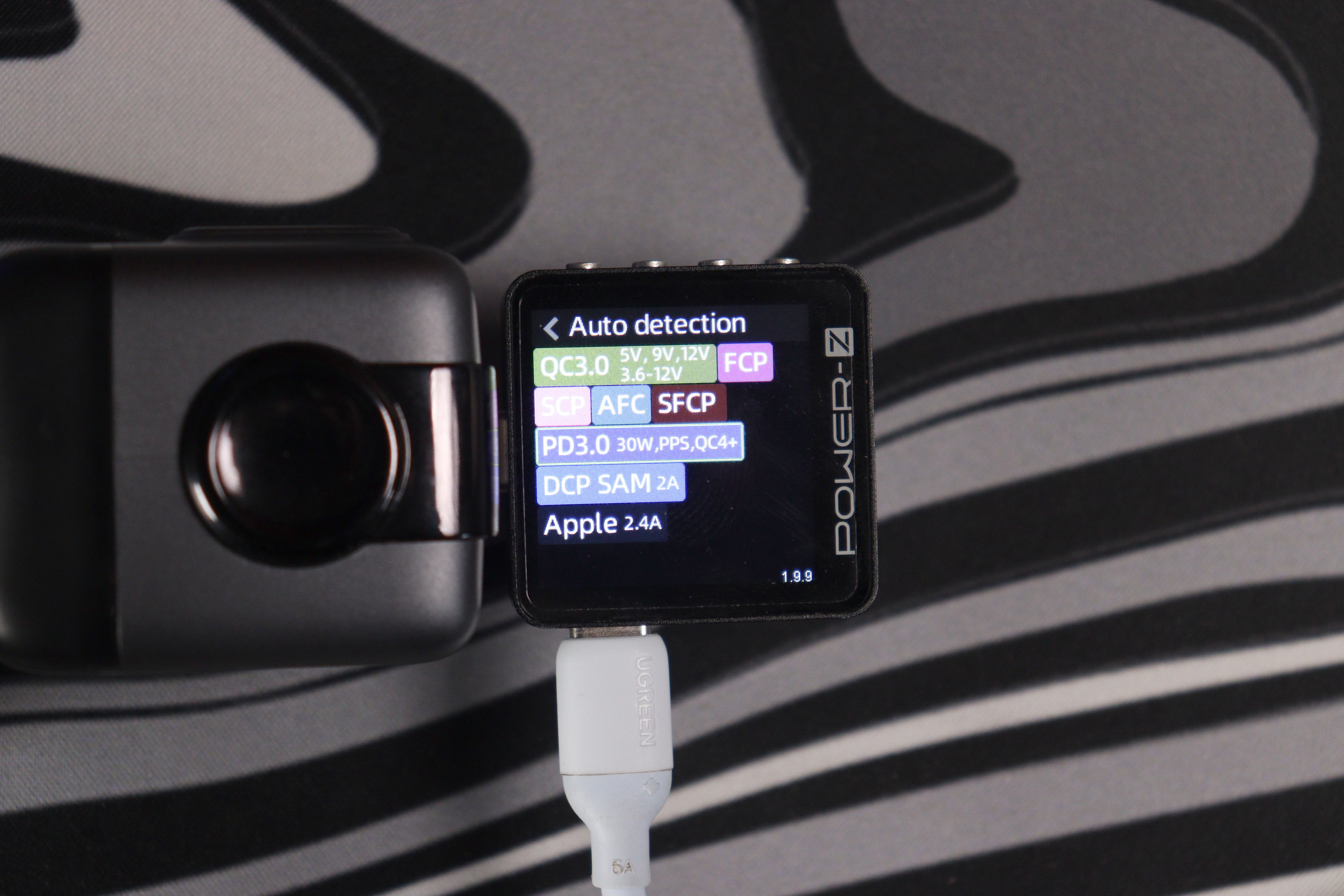 Проверял зарядку с помощью USB-тестера Power-Z и осциллографа FNB58. Начнём с протоколов: оба USB-C порта поддерживают PD 3.0 с профилями 5V/3A, 9V/3A, 12V/3A, 15V/3A и 20V/3.25A (максимум 65W). USB-A тянет QuickCharge 3.0, AFC, FCP, Apple 2.4A — типичный набор для совместимости со старыми устройствами. В тестере все протоколы определились корректно.