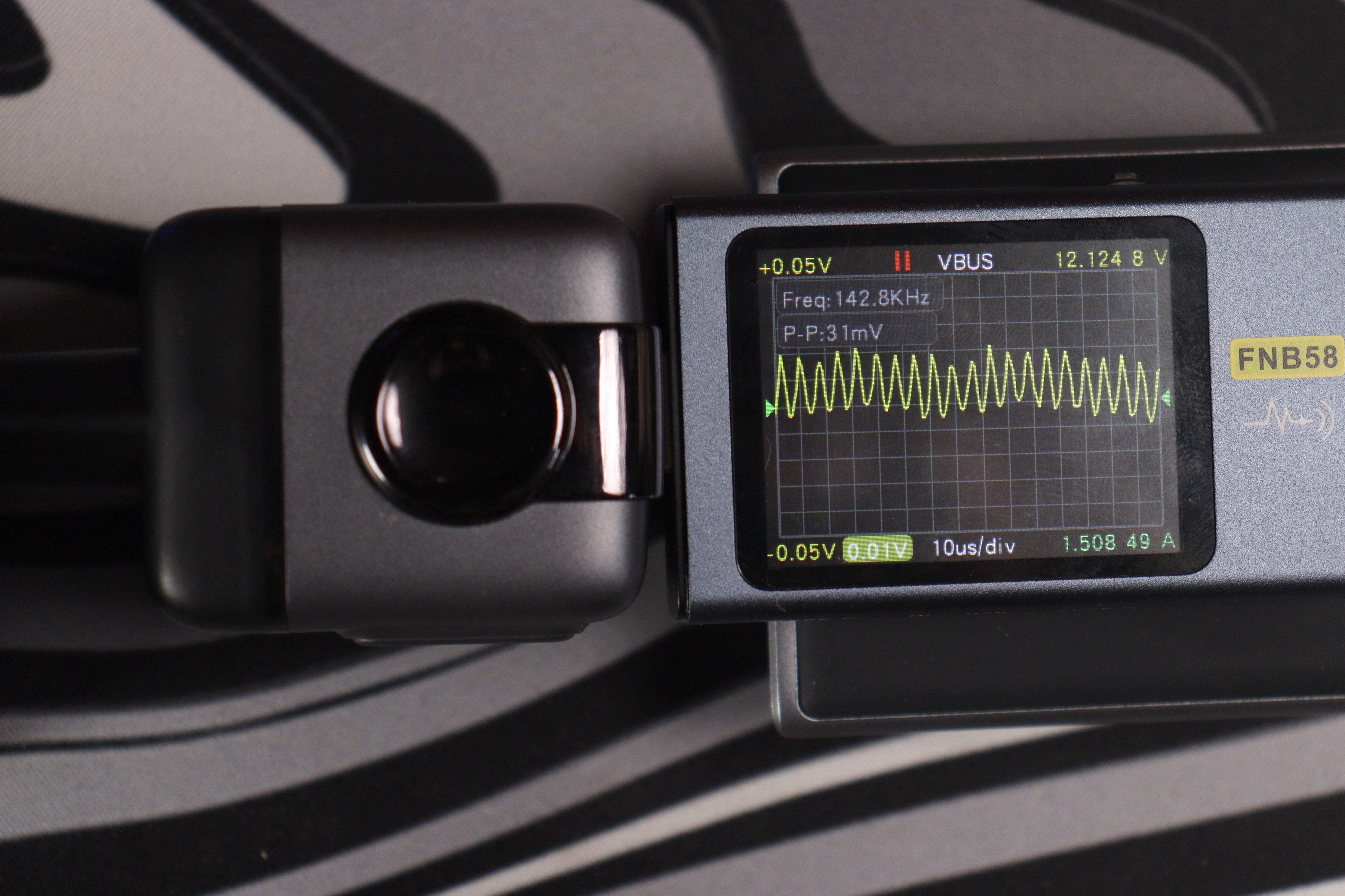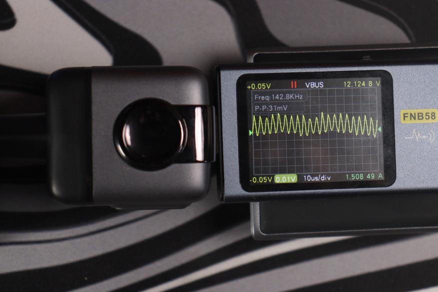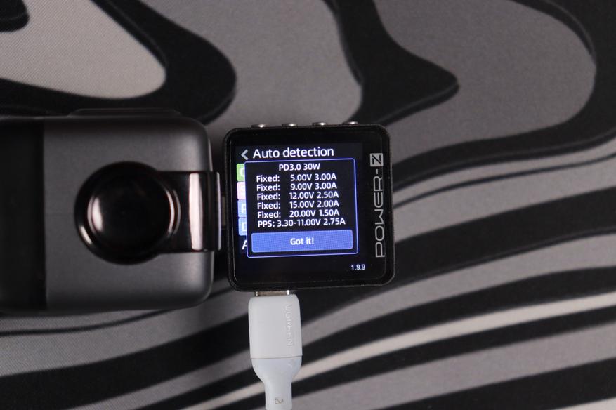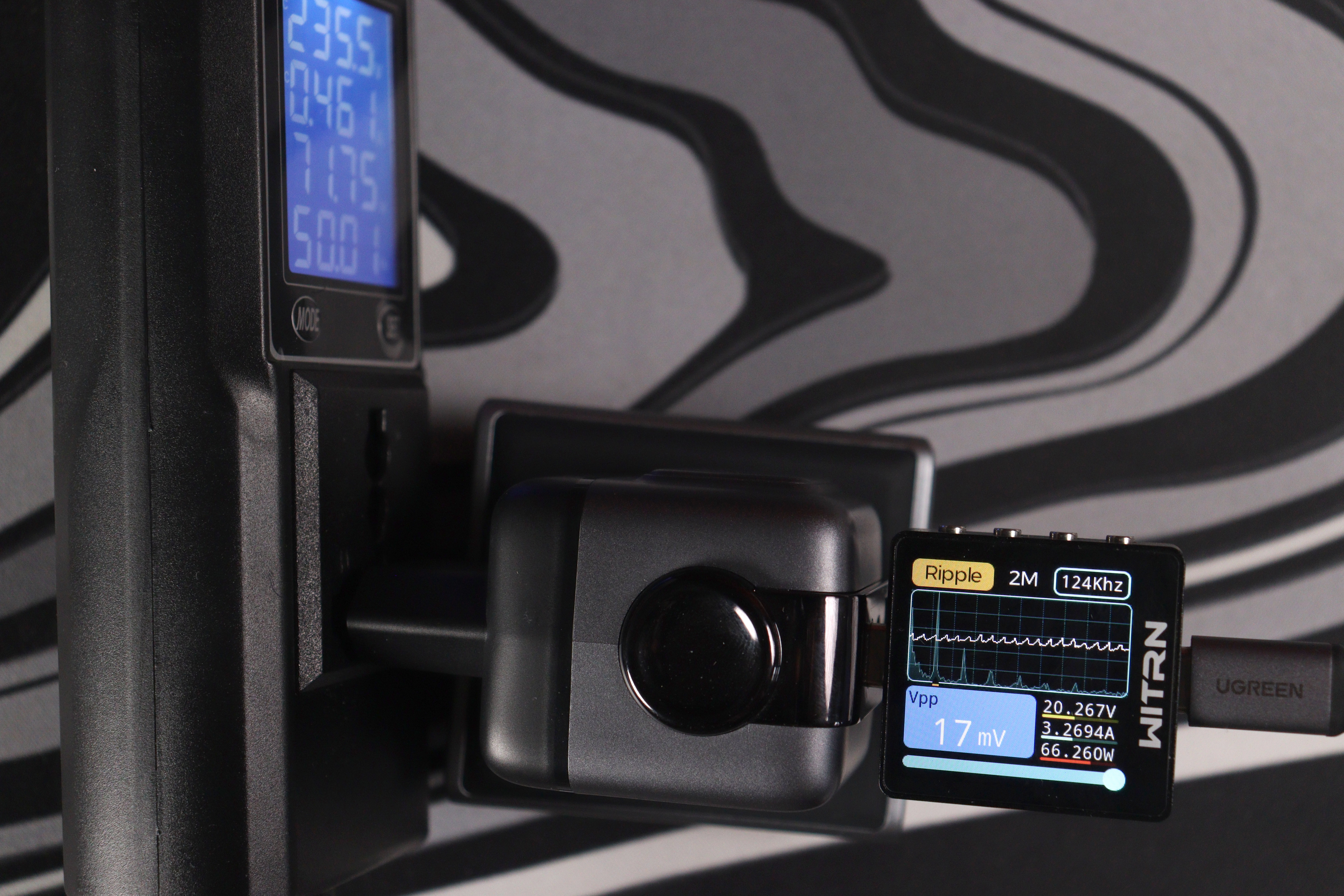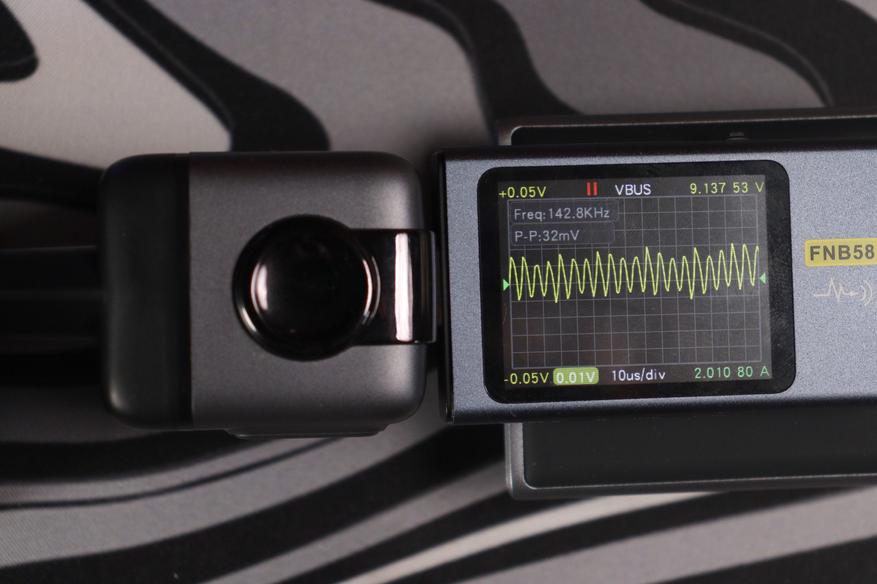 Проверял зарядку с помощью USB-тестера Power-Z и осциллографа FNB58. Начнём с протоколов: оба USB-C порта поддерживают PD 3.0 с профилями 5V/3A, 9V/3A, 12V/3A, 15V/3A и 20V/3.25A (максимум 65W). USB-A тянет QuickCharge 3.0, AFC, FCP, Apple 2.4A — типичный набор для совместимости со старыми устройствами. В тестере все протоколы определились корректно.