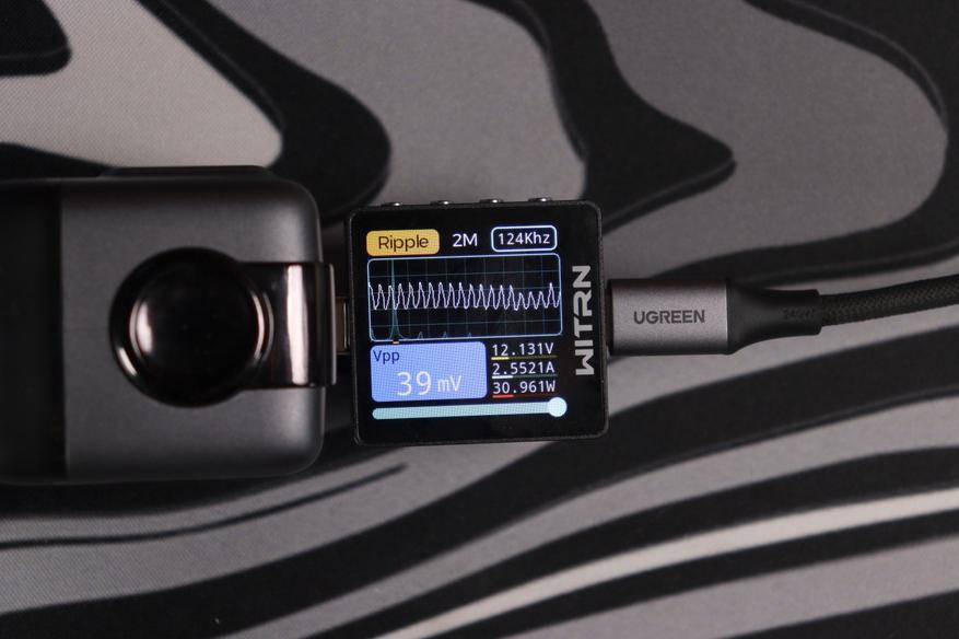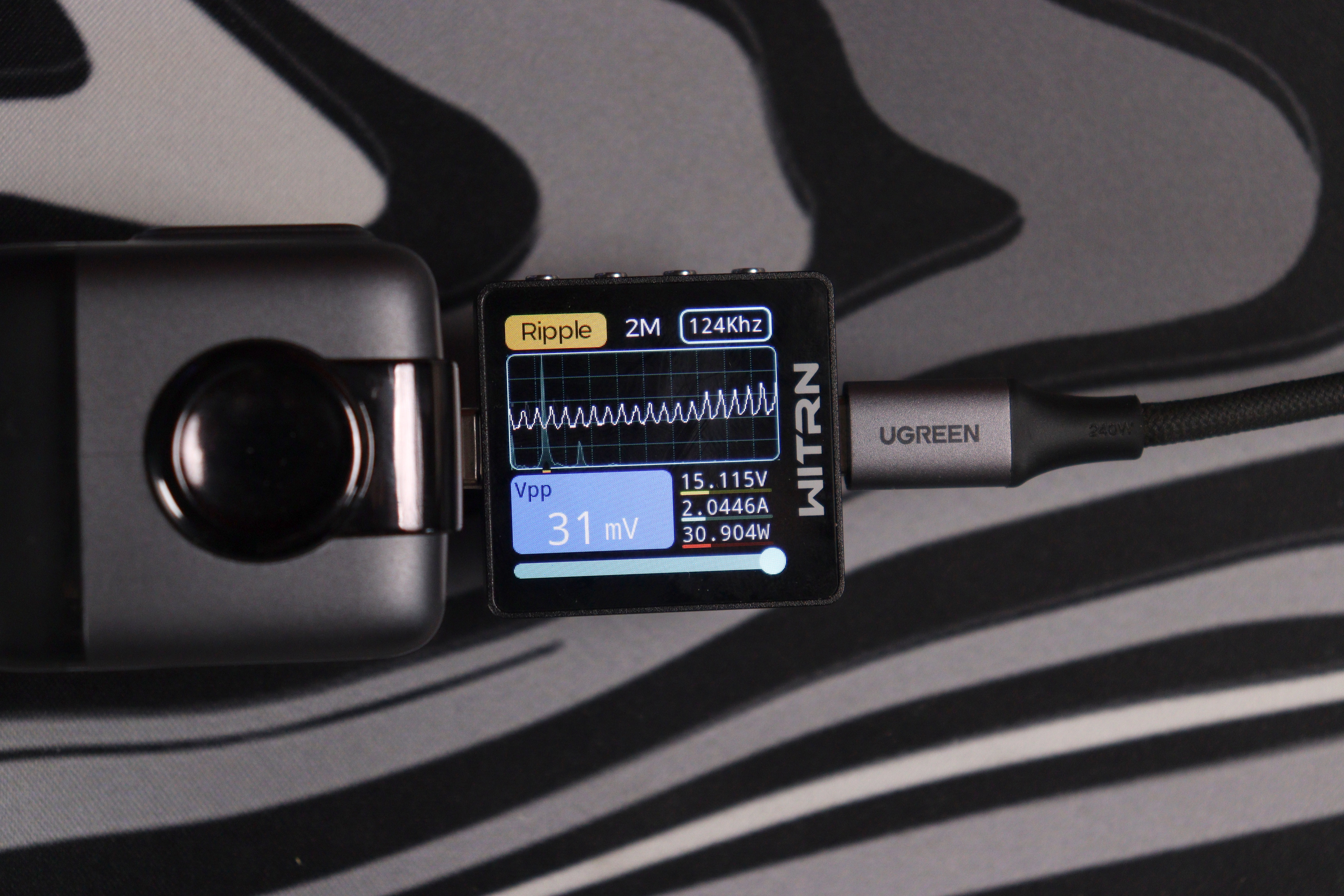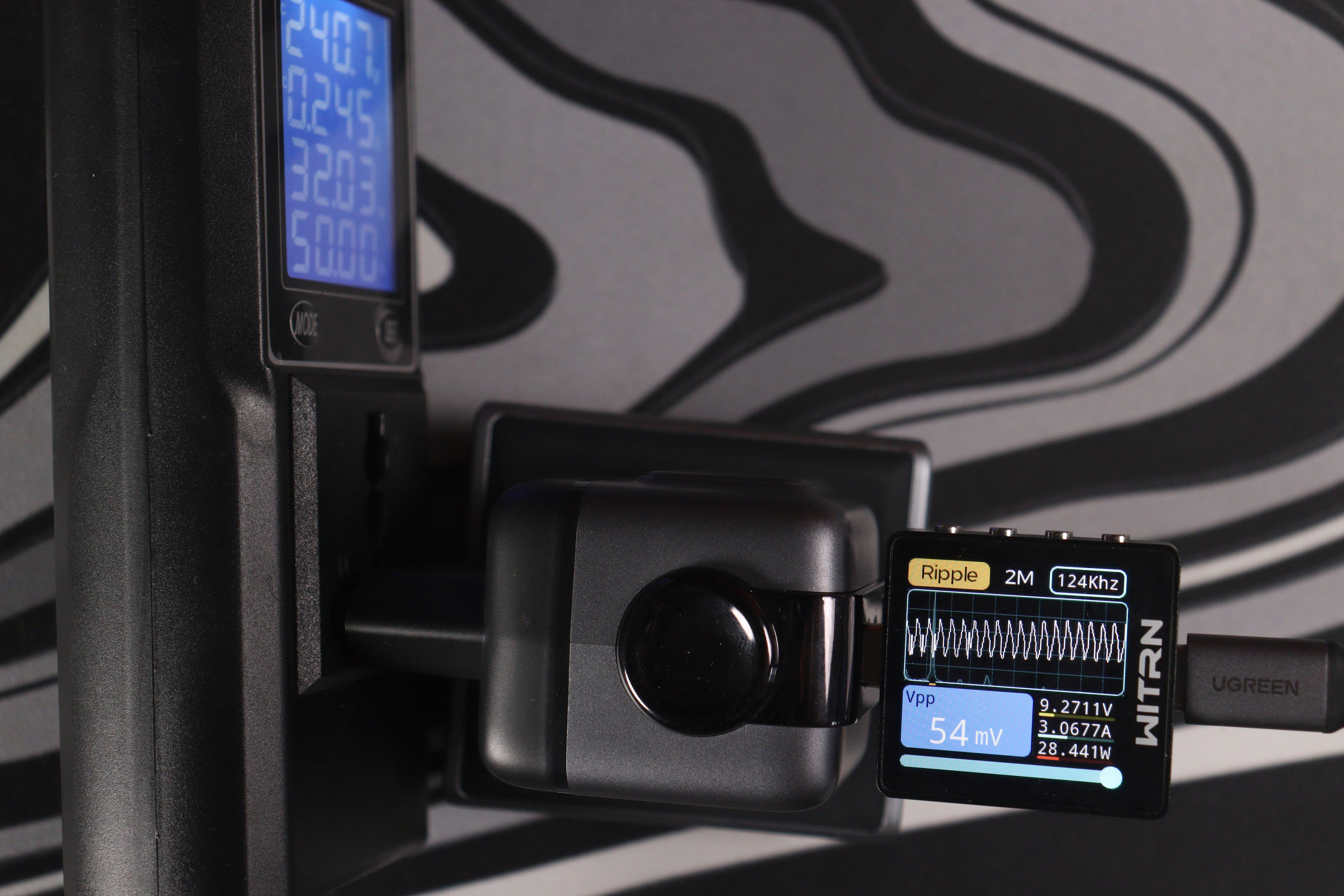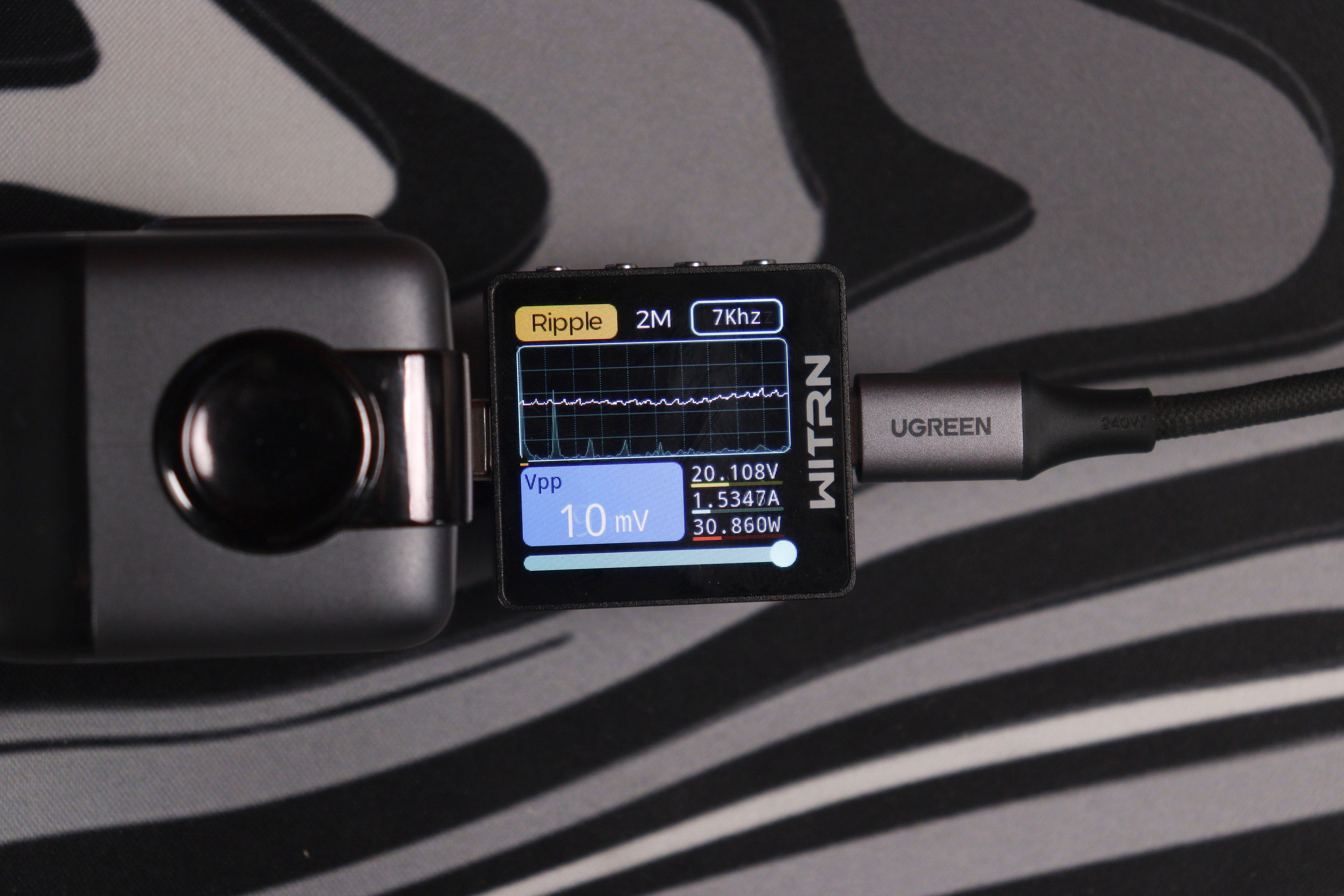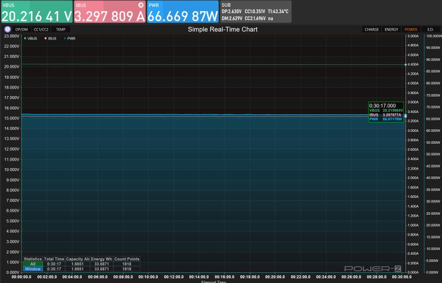 Проверял зарядку с помощью USB-тестера Power-Z и осциллографа FNB58. Начнём с протоколов: оба USB-C порта поддерживают PD 3.0 с профилями 5V/3A, 9V/3A, 12V/3A, 15V/3A и 20V/3.25A (максимум 65W). USB-A тянет QuickCharge 3.0, AFC, FCP, Apple 2.4A — типичный набор для совместимости со старыми устройствами. В тестере все протоколы определились корректно.
