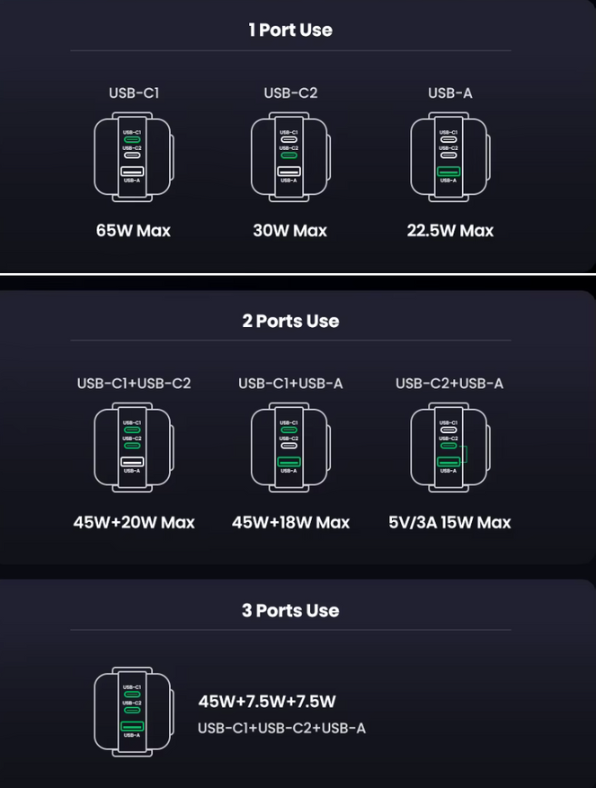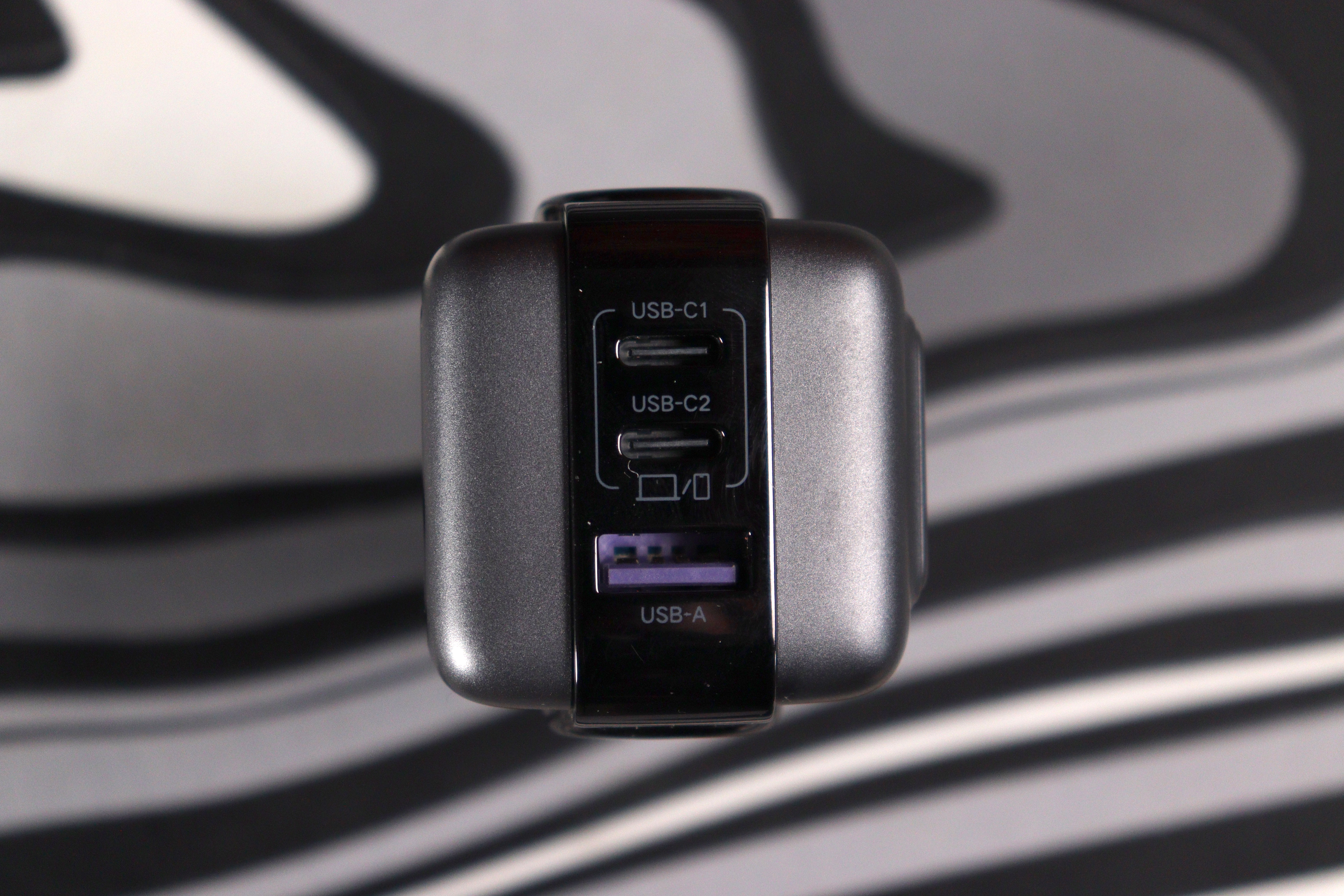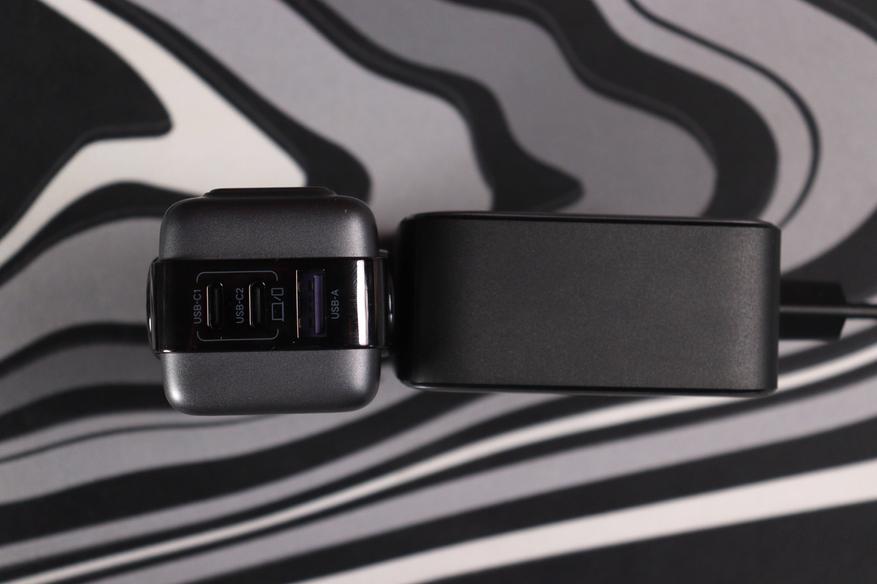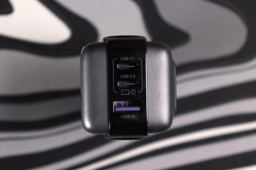 Проверил одновременную работу портов. При подключении второго устройства к USB-C2 первый порт не отключается, а затем оба порта перераспределяют мощность. USB-C1 получает до 45W, USB-C2 — до 20W. Если задействовать все три порта, то USB-C1 остаётся на 45W, а USB-C2 и USB-A делят оставшиеся 15W (обычно 7.5W на каждый). Это типичное поведение для многопортовых зарядок — полную мощность 65W можно получить только через один порт.