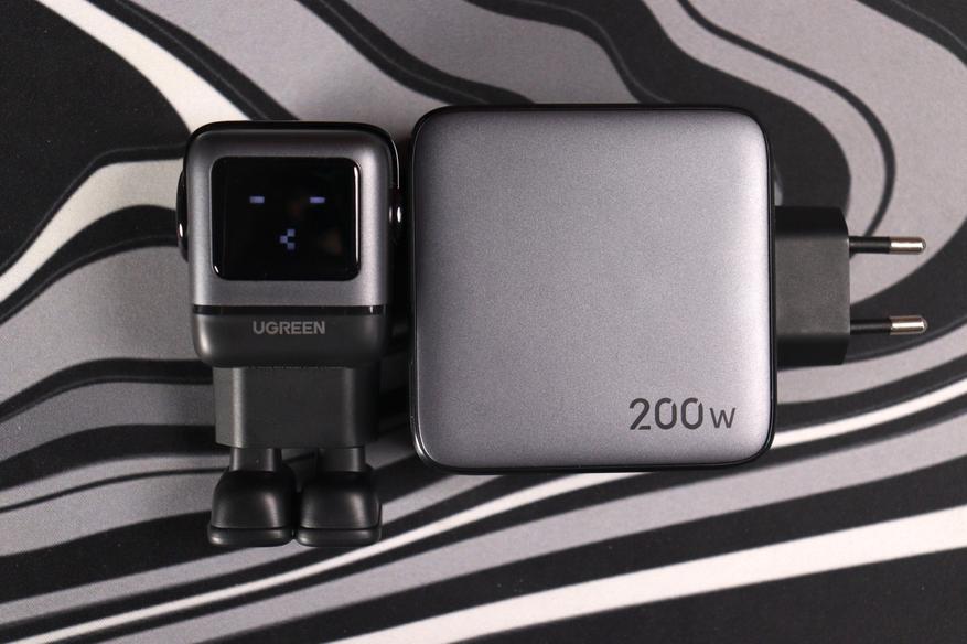 По размерам зарядка заметно меньше флагманской Ugreen Nexode 200W, но всё равно занимает прилично места в розетке. Вес около 150 грамм — не самая лёгкая для своего класса, но и не кирпич. Дополнительно сравнил также с другими моделями серии — на 30Вт и 100Вт