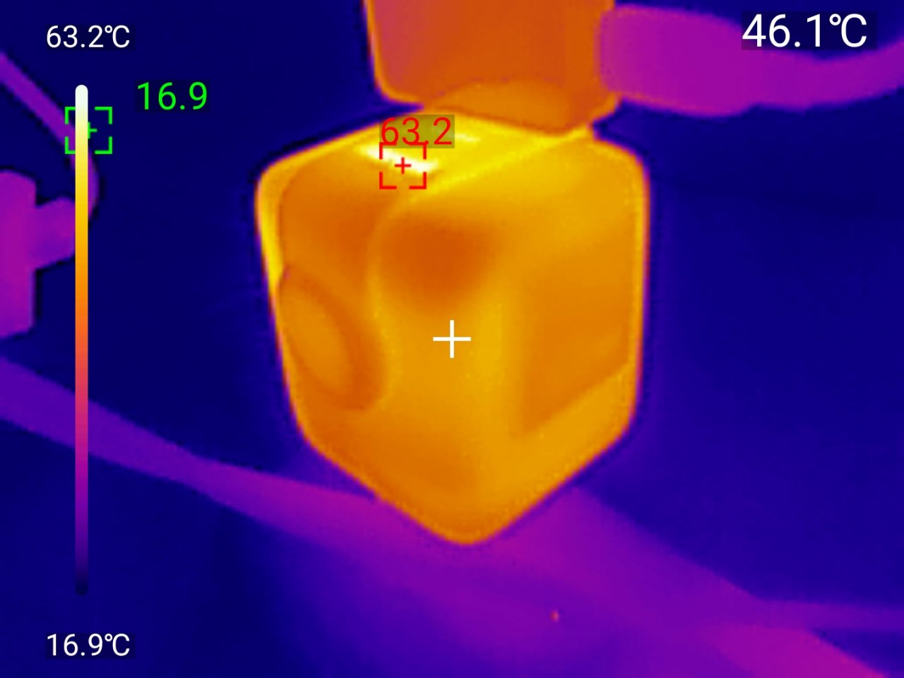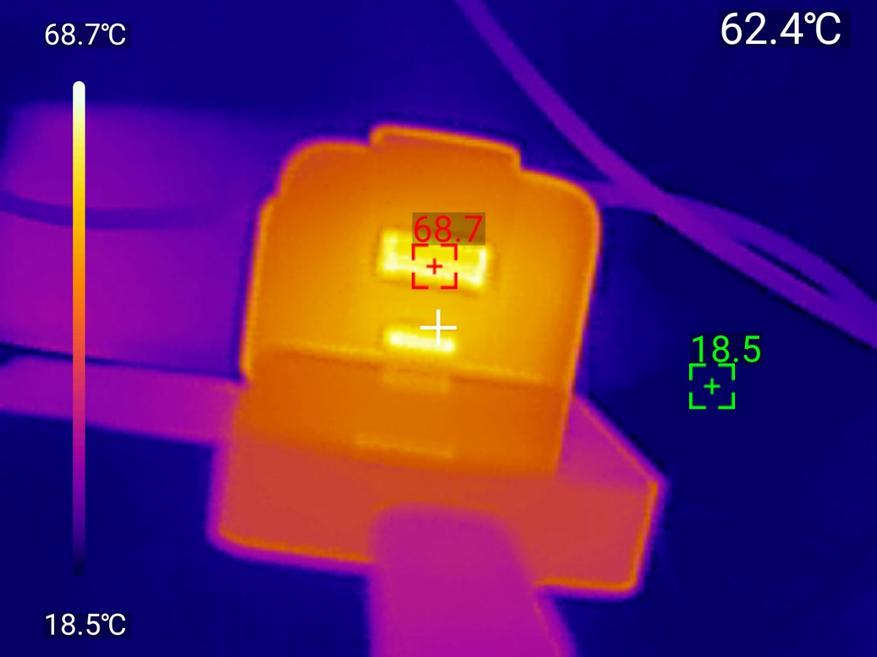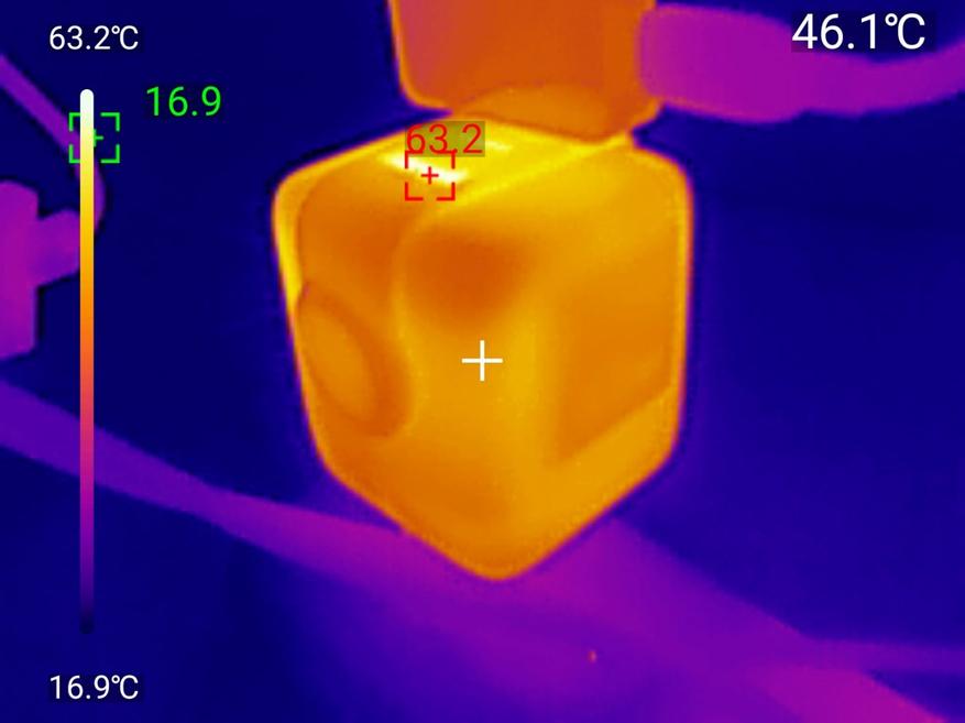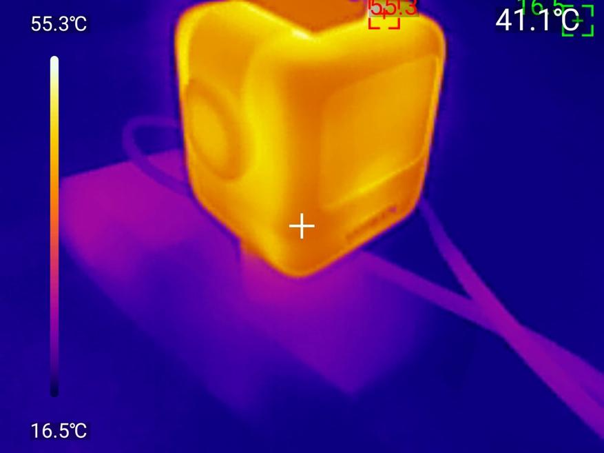 Теперь о нагреве и стабильности работы. Прогнал зарядку полчаса на максимальной мощности (65W через USB-C1). Тепловизор показал пик 50°C в центре корпуса и около 63°C на верхней крышке, рядом с портами для зарядки. Корпус тёплый, но не обжигающий — можно взять в руку без дискомфорта. Для GaN-зарядки это нормальная рабочая температура. Ну и понятное дело стресс тест был пройден на отлично.
