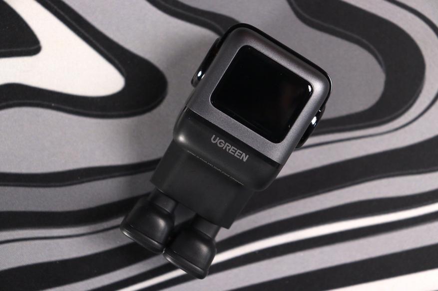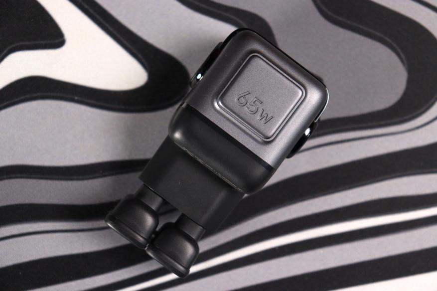 Nexode RG компактнее многих 65-ваттных зарядок благодаря нитриду галлия. Корпус выполнен из чёрного матового пластика с глянцевыми вставками — выглядит аккуратно, но на глянце быстро появляются отпечатки. Главная фишка — квадратный экран с пиксельной рожицей робота, который оживает при подключении устройств. Три порта расположены на передней панели: два USB-C и один USB-A с фиолетовым язычком (маркер QuickCharge).