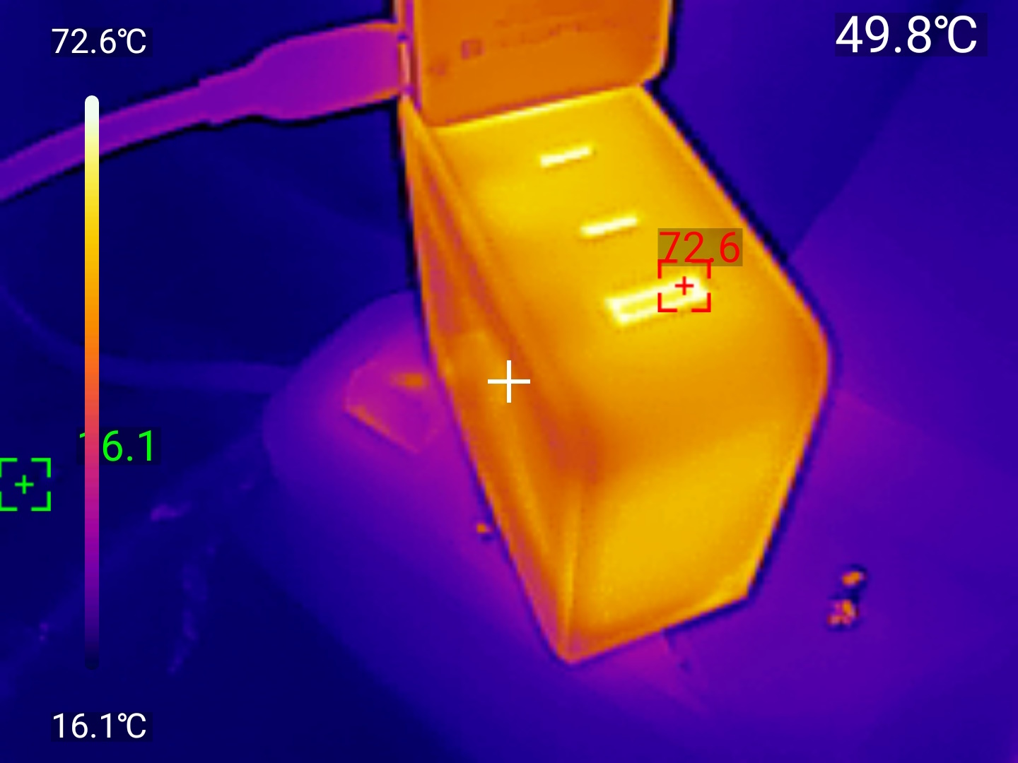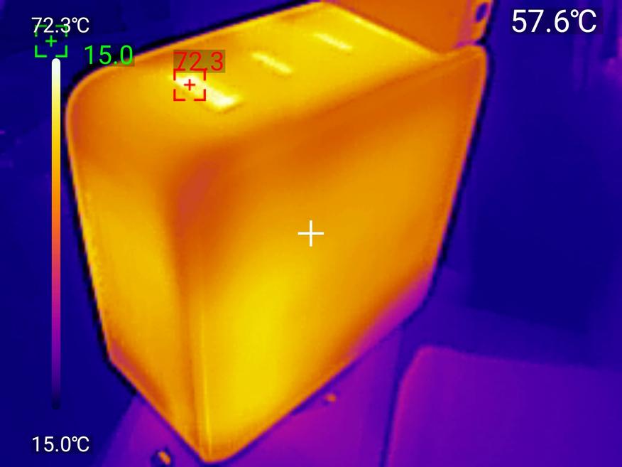 После 30 минут работы на максимальной мощности (160Вт) температура корпуса достигла 57,6°C, по показаниям тепловизора на наиболее горячей точке. Это в пределах нормы для GaN-зарядок такой мощности (скорее отмечу качественное охлаждение элементов), но старший вариант серии на 200Вт при подобной нагрузке оставался ощутимо холоднее.