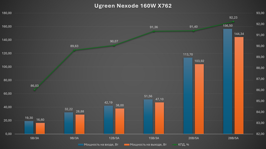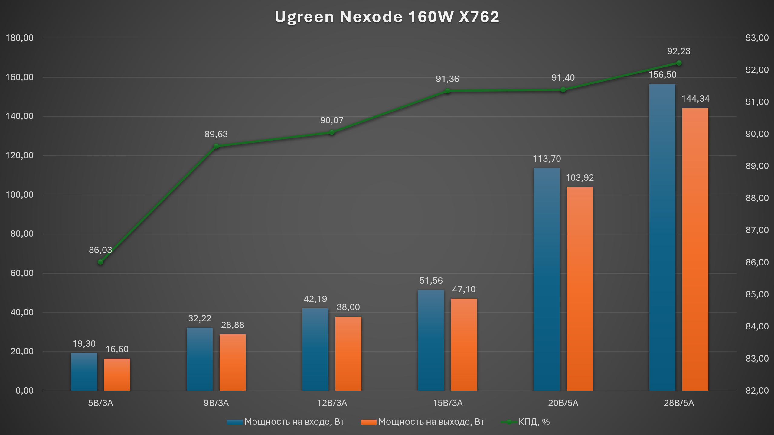 Устройство показывает отличную энергоэффективность во всем диапазоне рабочих мощностей. Минимальное значение КПД (86.03%) зафиксировано при самой низкой нагрузке (5В/3А), что является нормой, так как эффективность обычно возрастает с увеличением мощности. Пиковые значения КПД достигают 92.23% (на максимальной мощности 28В/5A, где на выходе получено 144.34Вт при входной мощности 156.50Вт.