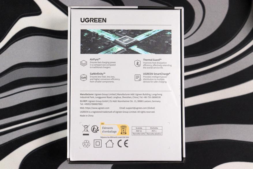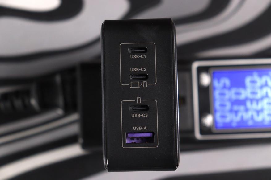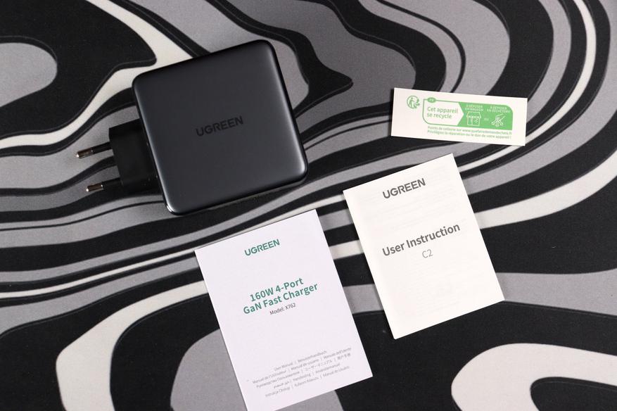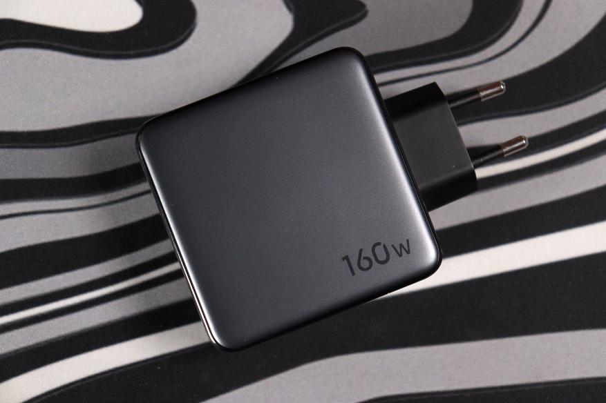 Устройство выполнено в cthjv матовом пластике с характерной квадратной формой и скруглёнными углами. Выполнено в едином стиле с другими зарядными устройствами Ugreen Nexode. Размеры компактные, особенно учитывая мощность 160 Вт. На лицевой панели расположены четыре порта: три USB-C и один USB-A. Маркировка портов нанесена рядом с разъёмами — USB-C1, USB-C2, USB-C3 и USB-A. На корпусе выбита надпись «160W», что сразу даёт понять максимальную мощность устройства.