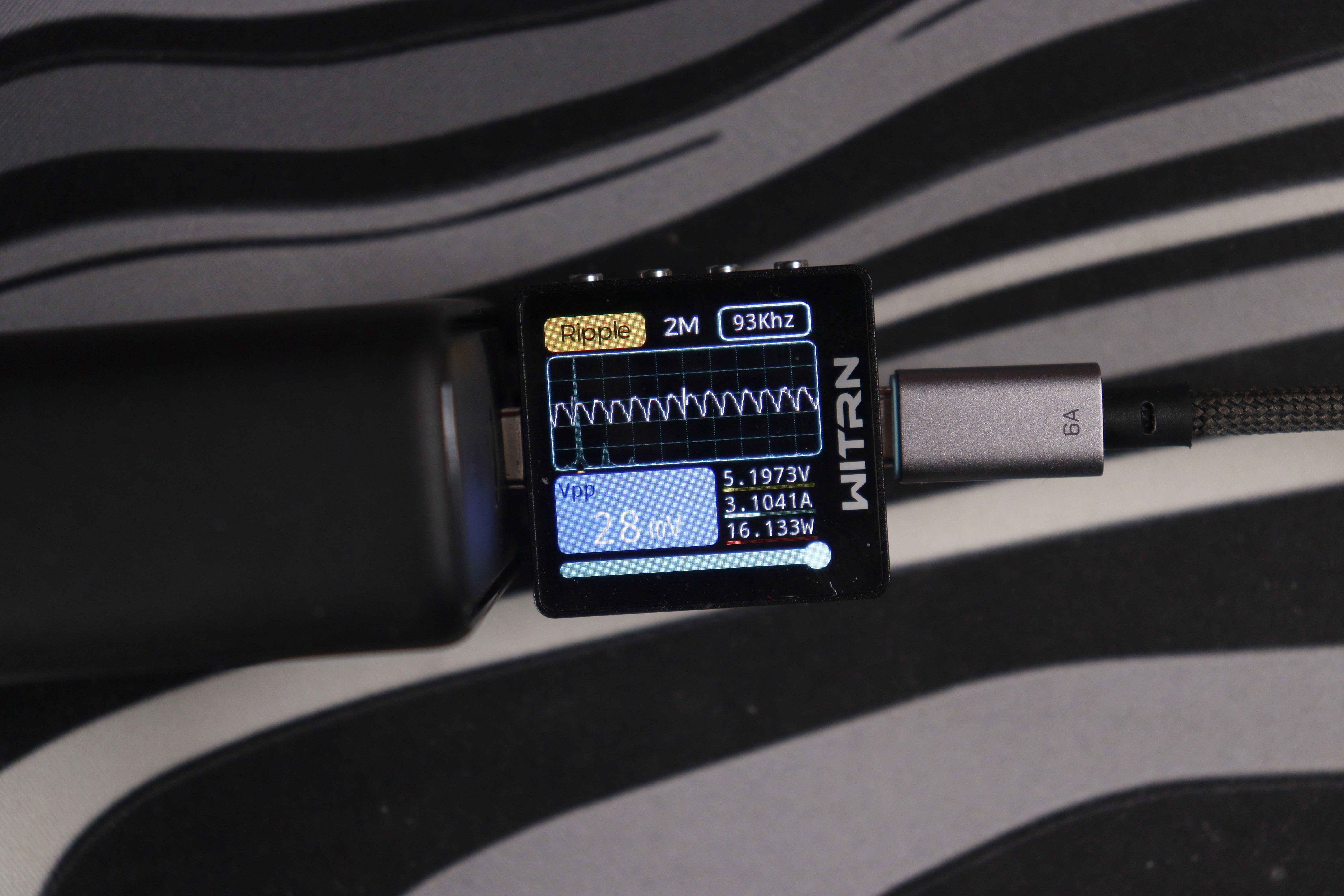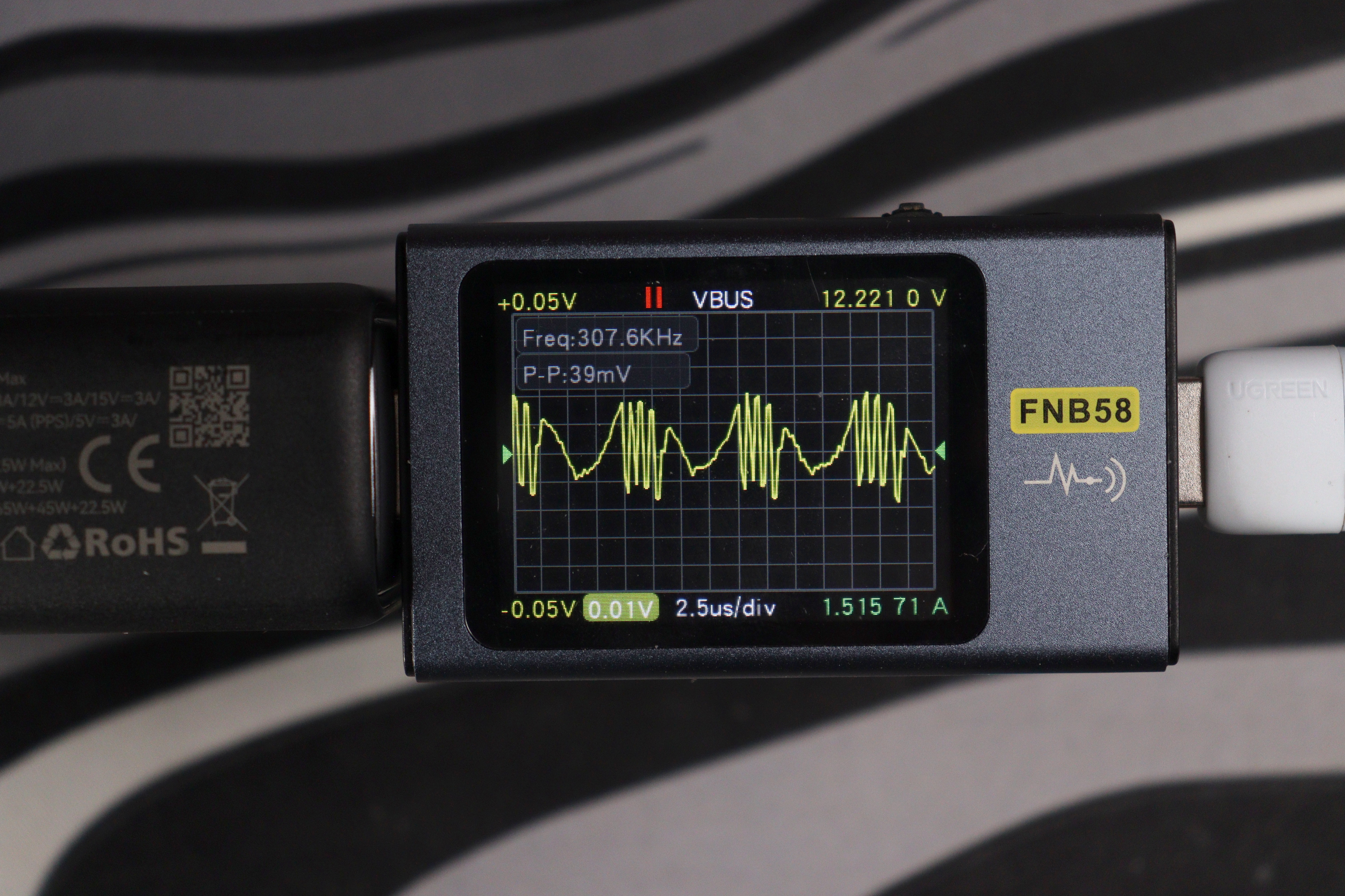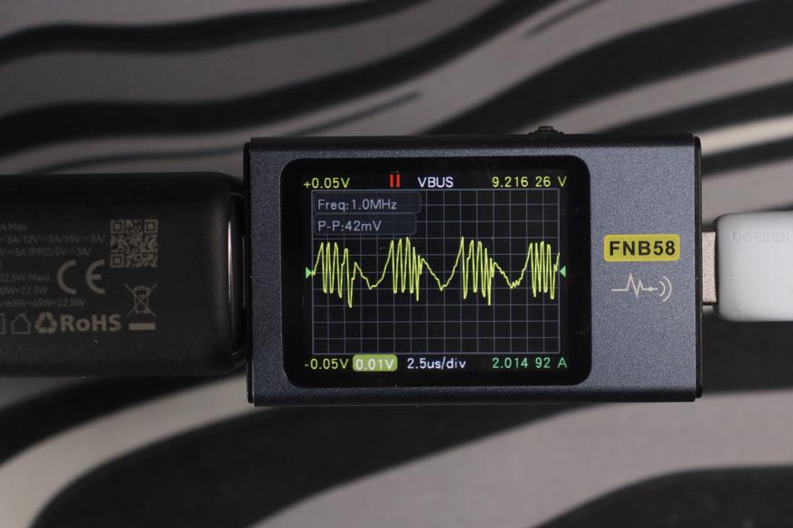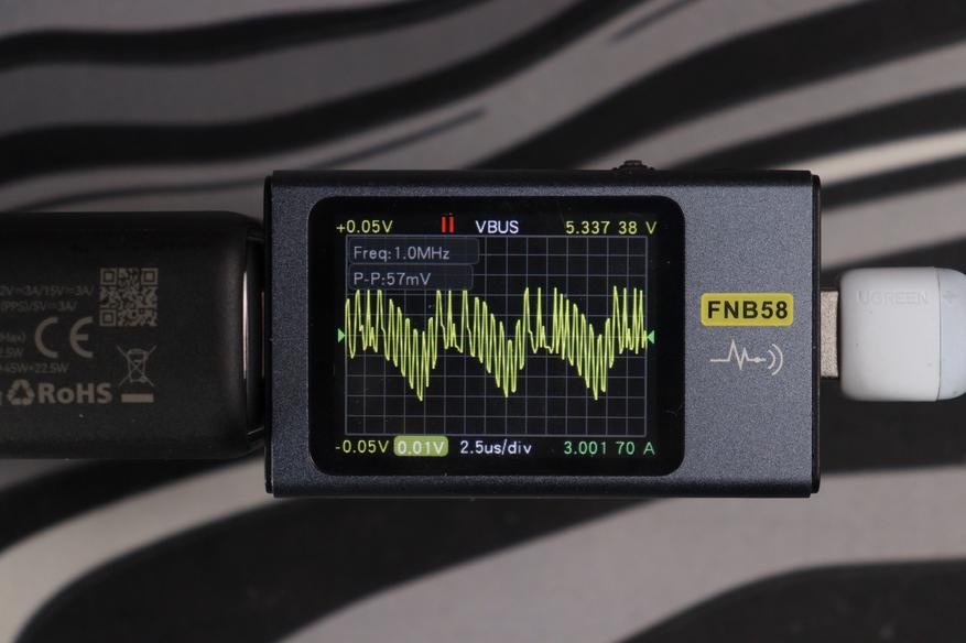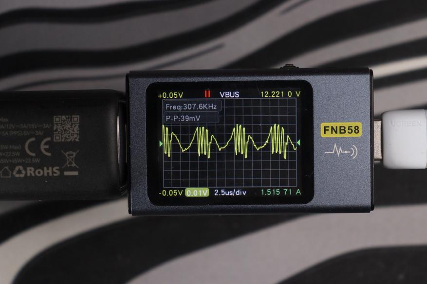 Картина по КПД типичная для GaN-преобразователей: чем выше нагрузка, тем эффективнее работает зарядник. На минимальном режиме 5V/3A КПД составляет всего 78.09% — преобразователь потребляет 20.36W из сети, отдавая на выход лишь 15.90W, остальное уходит в тепло. По мере роста напряжения и тока картина улучшается: на 9V/3A уже 84.85%, на 12V/3A — 87.30%, на 15V/3A — 88.91%. На 20V/5A зарядник выходит на 91.96% при реальных 102.63W на выходе. И наконец, в режиме EPR 28V/5A достигается пиковый КПД 93.07% — зарядник потребляет 153.30W из сети и отдаёт 142.67W устройству. Это хороший результат для компактного корпуса: потери на максимальной мощности составляют около 10.6W, что и объясняет умеренный нагрев корпуса до 57-58°C.