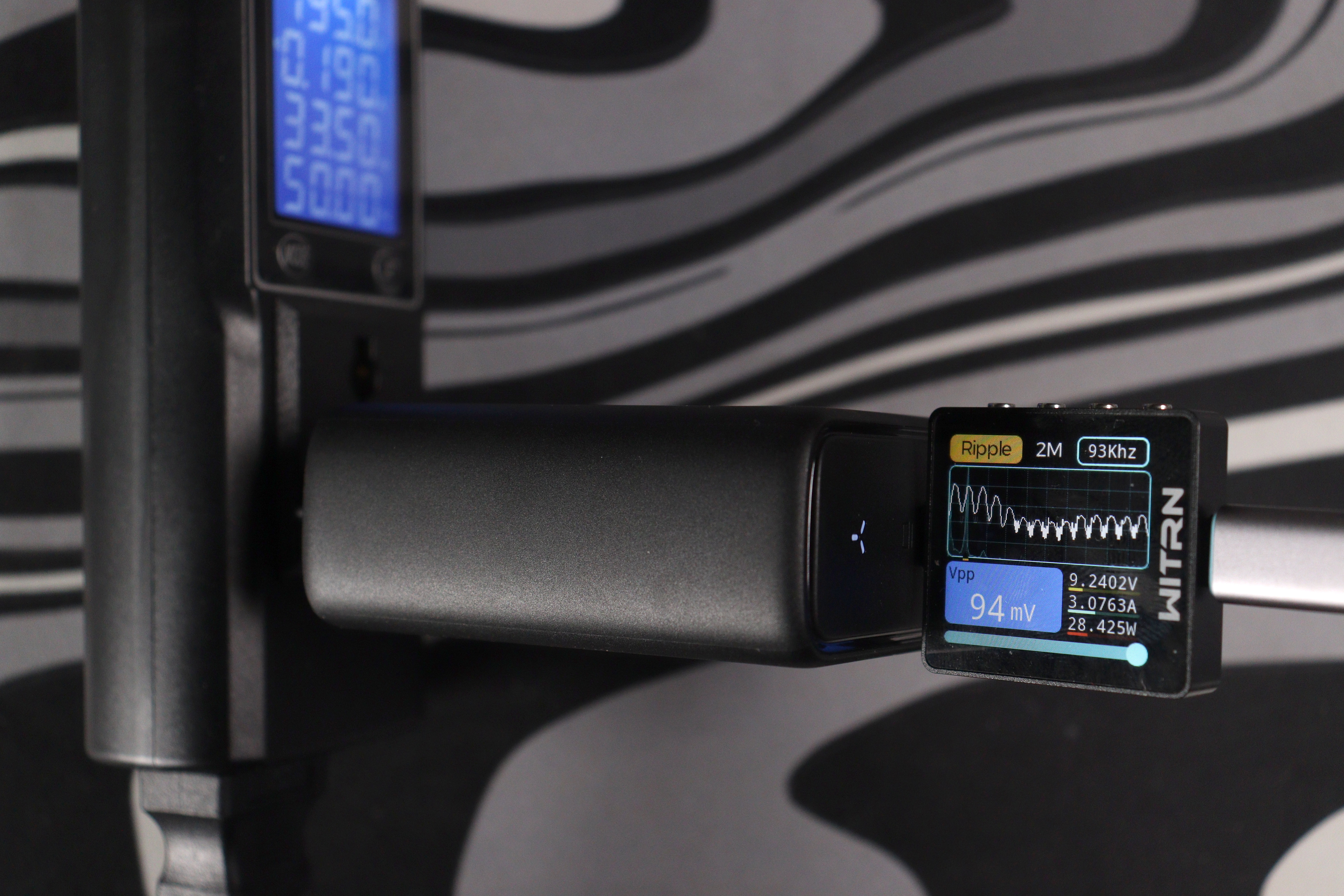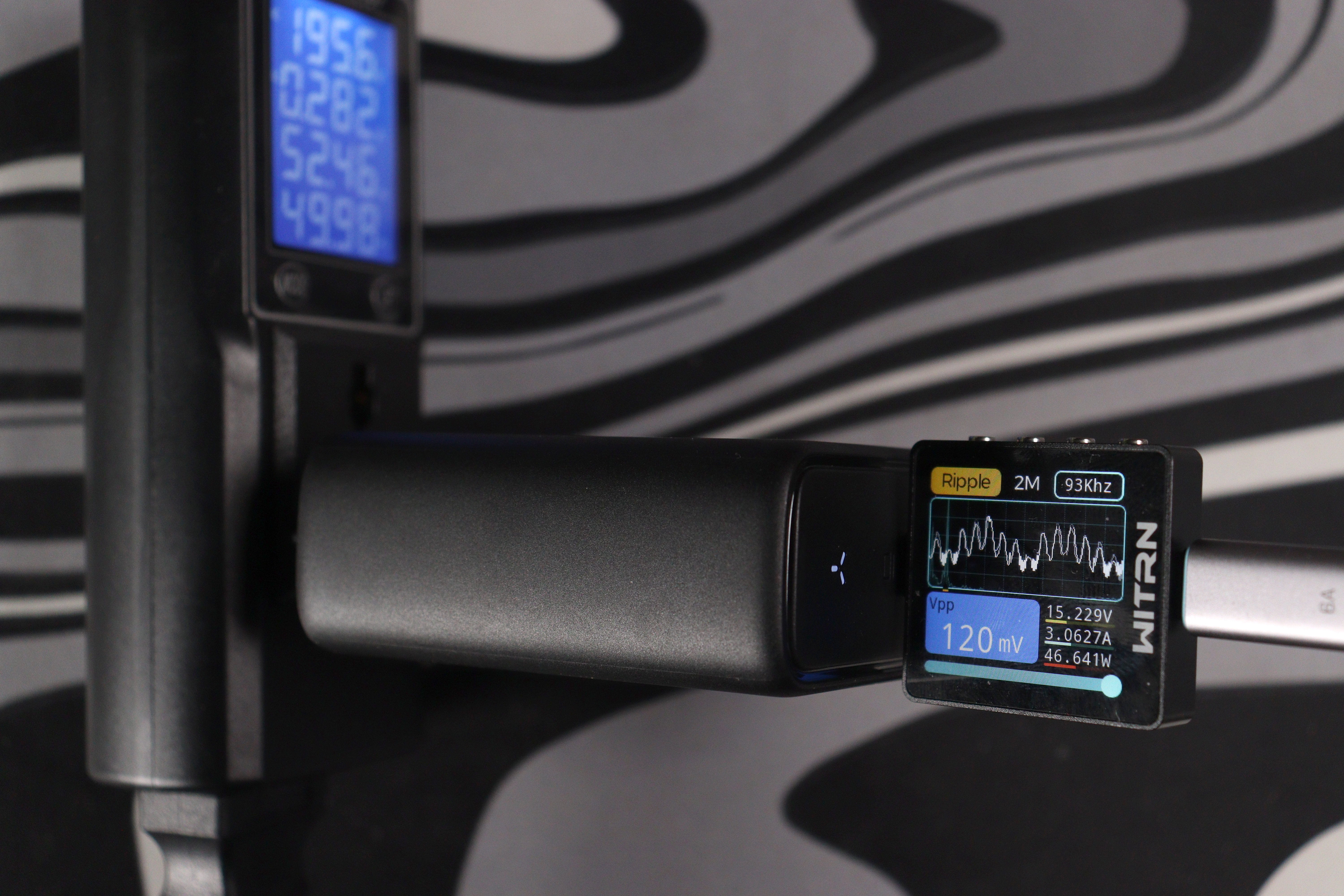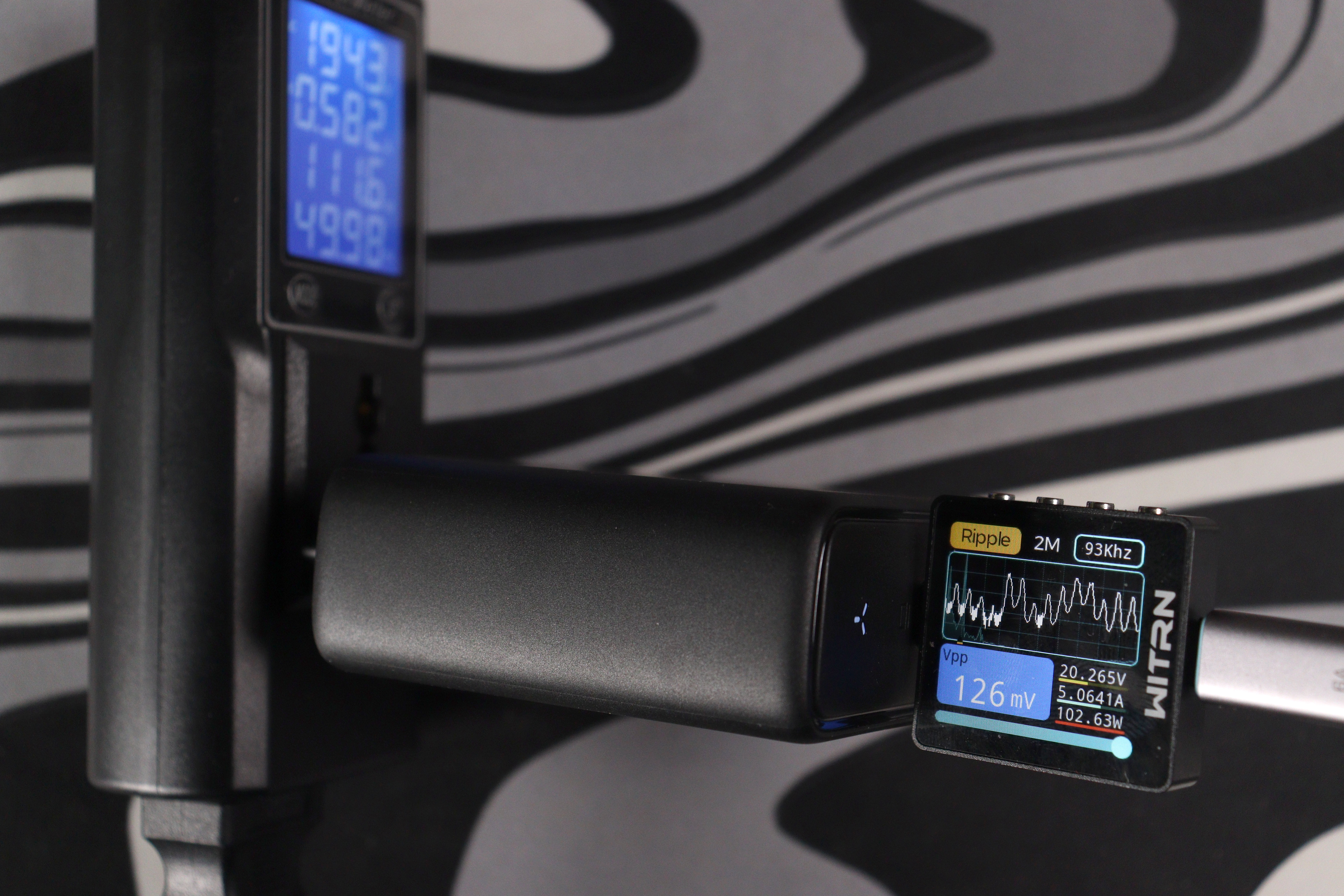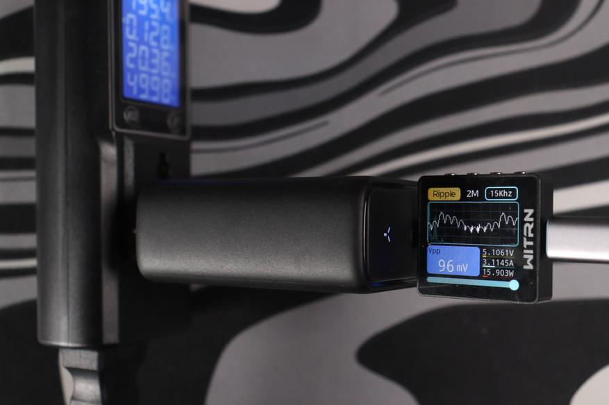 Измерения проводились на всех ступенях напряжения. На 5V при мощности около 16W пульсации составили 96 mV при частоте ШИМ 15 kHz — следствие другого режима работы преобразователя на минимальных напряжениях. На 9V картина улучшается: 94 mV при мощности 28W. Дальше идут 12V/37.7W — 123 mV, 15V/46.6W — 120 mV, 20V/102.6W — 126 mV.