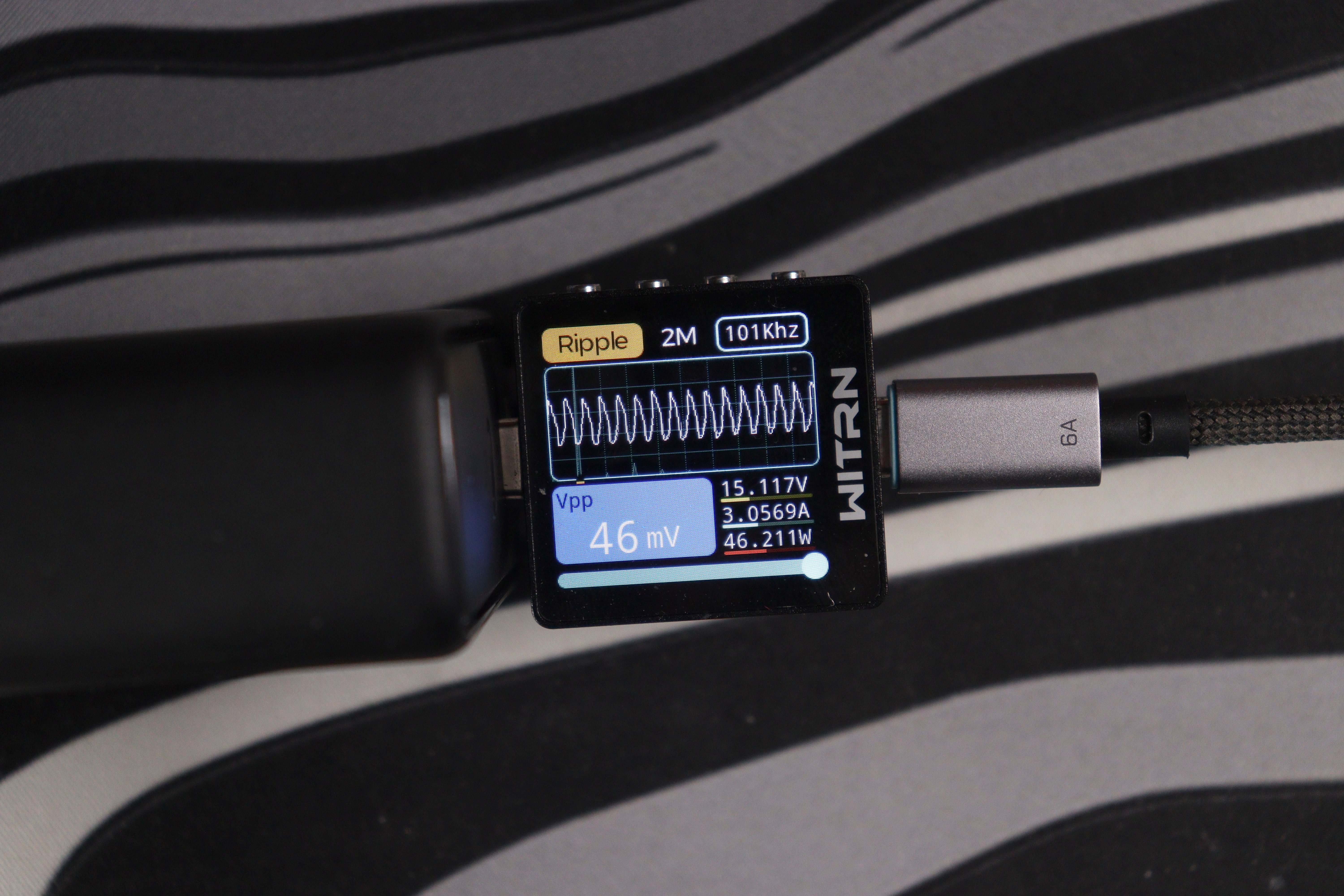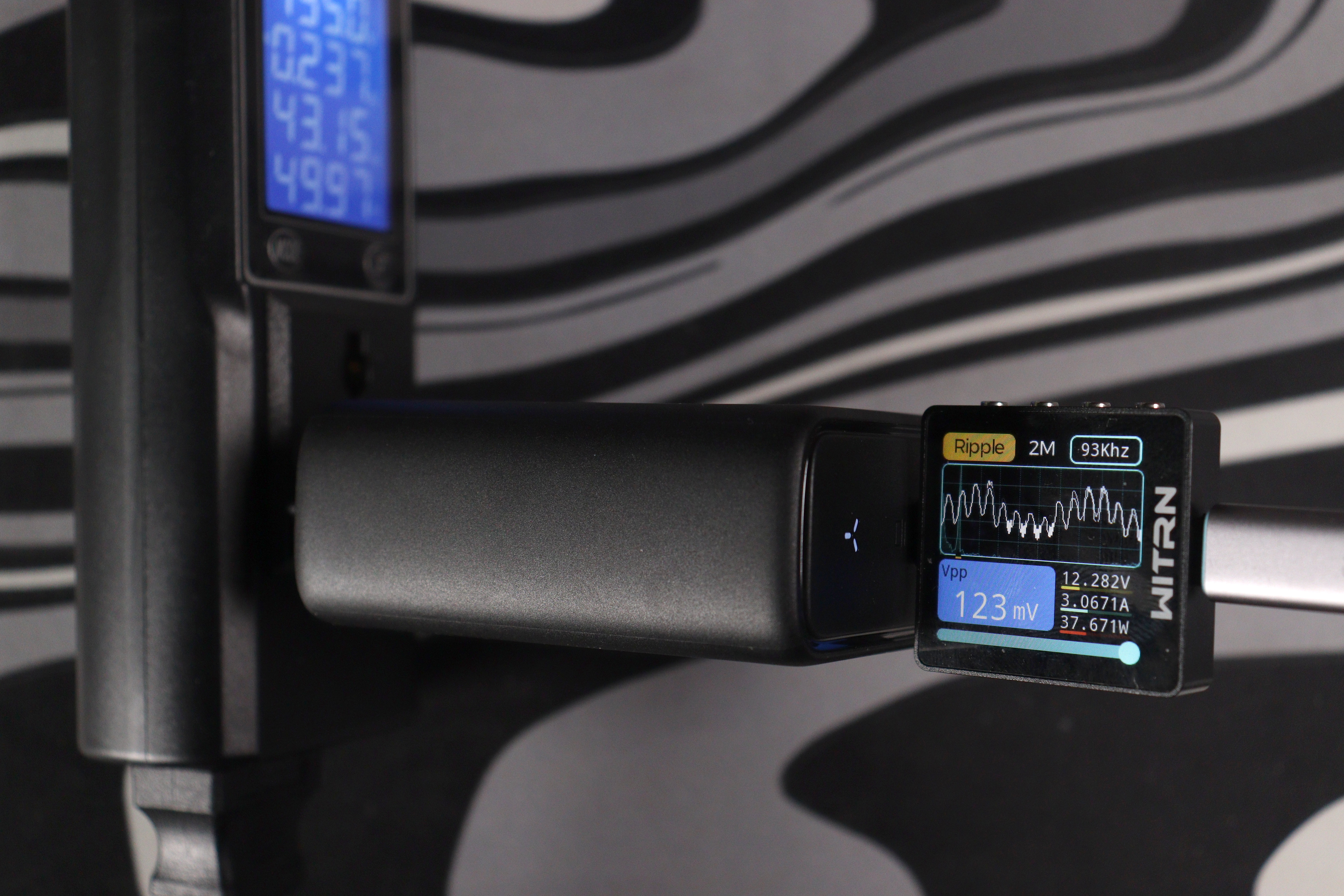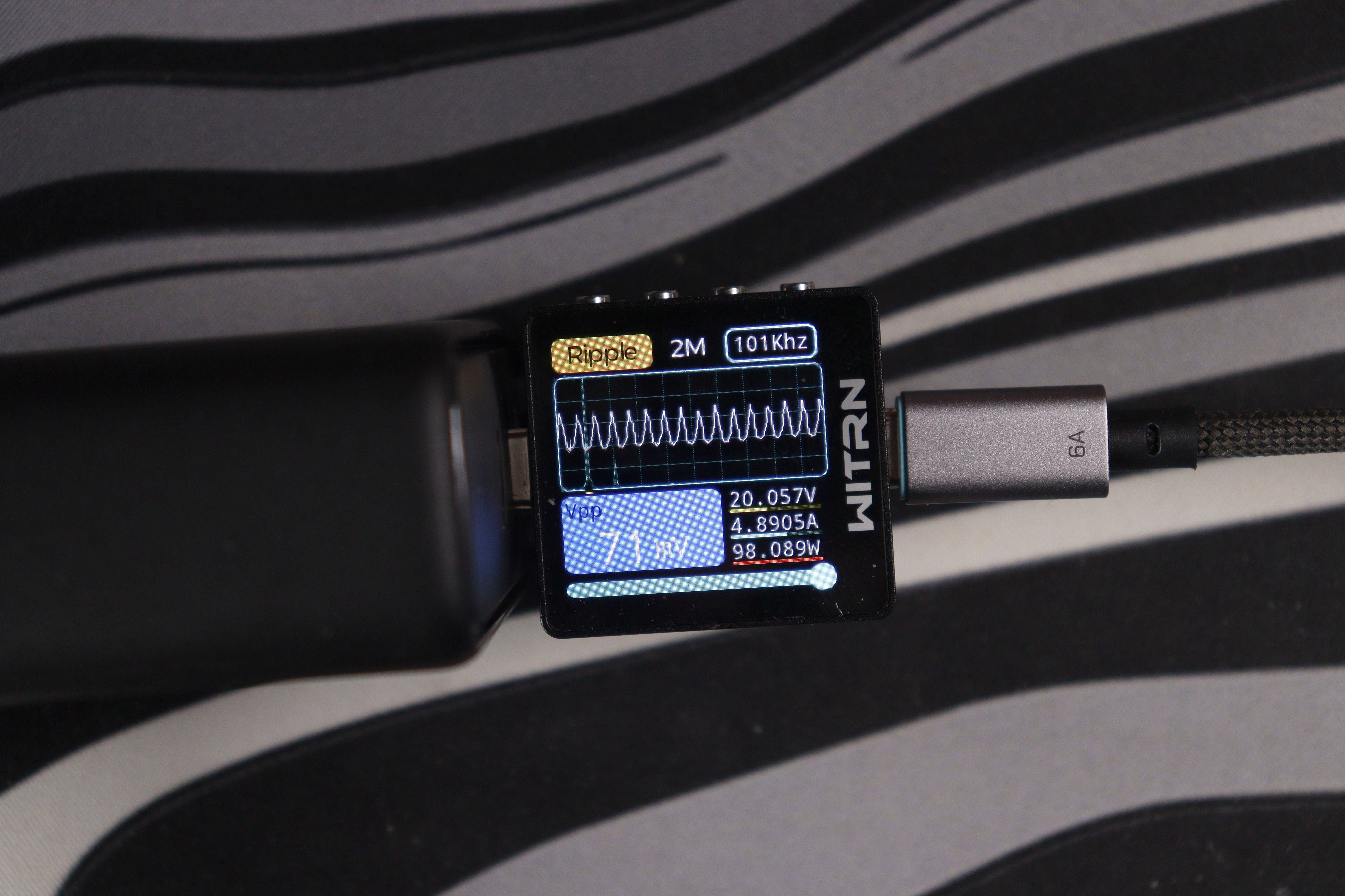 Измерения проводились на всех ступенях напряжения. На 5V при мощности около 16W пульсации составили 96 mV при частоте ШИМ 15 kHz — следствие другого режима работы преобразователя на минимальных напряжениях. На 9V картина улучшается: 94 mV при мощности 28W. Дальше идут 12V/37.7W — 123 mV, 15V/46.6W — 120 mV, 20V/102.6W — 126 mV.