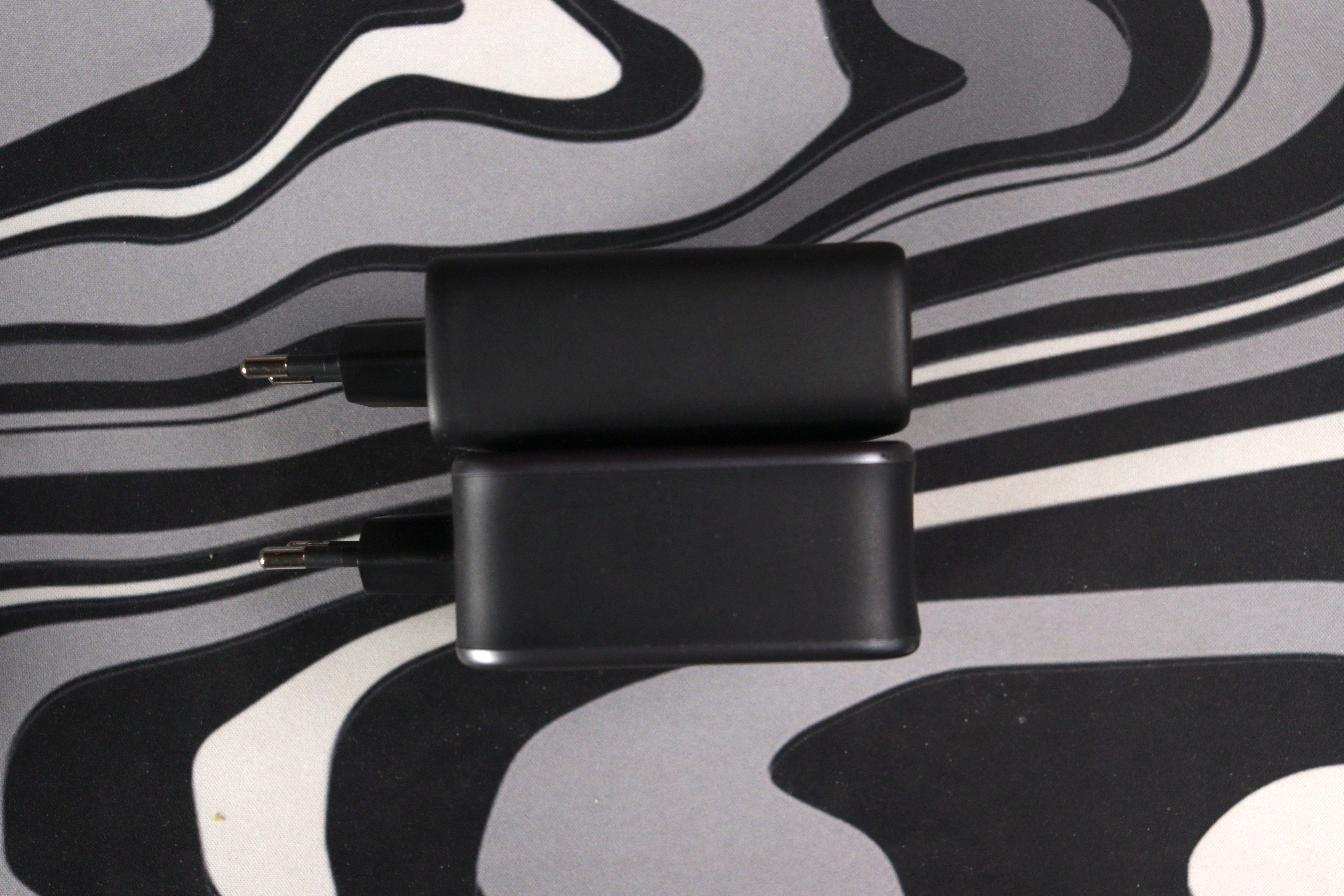 Корпус полностью матово-чёрный, покрытие приятное на ощупь — не скользит, не собирает отпечатки. Форм-фактор квадратный, почти кубический. Вилка европейского стандарта, штыри фиксированные, не складываются — минус для тех, кто часто путешествует.