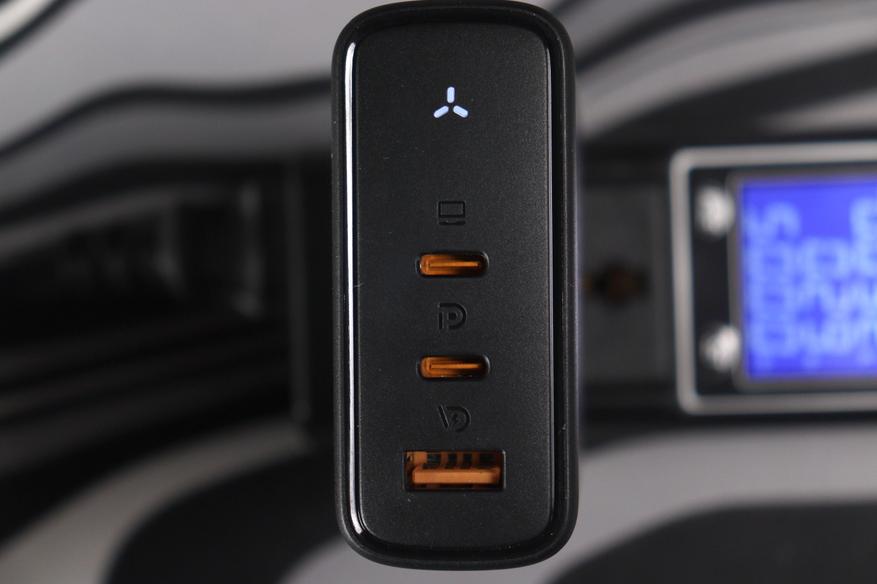 При всех трёх активных портах одновременно расклад такой: C1 получает 65W, C2 — 45W, USB-A — 22.5W, суммарно 132.5W. Это важный момент для тех, кто планирует заряжать мощный ноутбук через C1 параллельно с другими устройствами — в этом сценарии 140W уже не будет, только 65W на основной порт. Стоит отметить, что порты перезагружаются при подключении нового устройства.