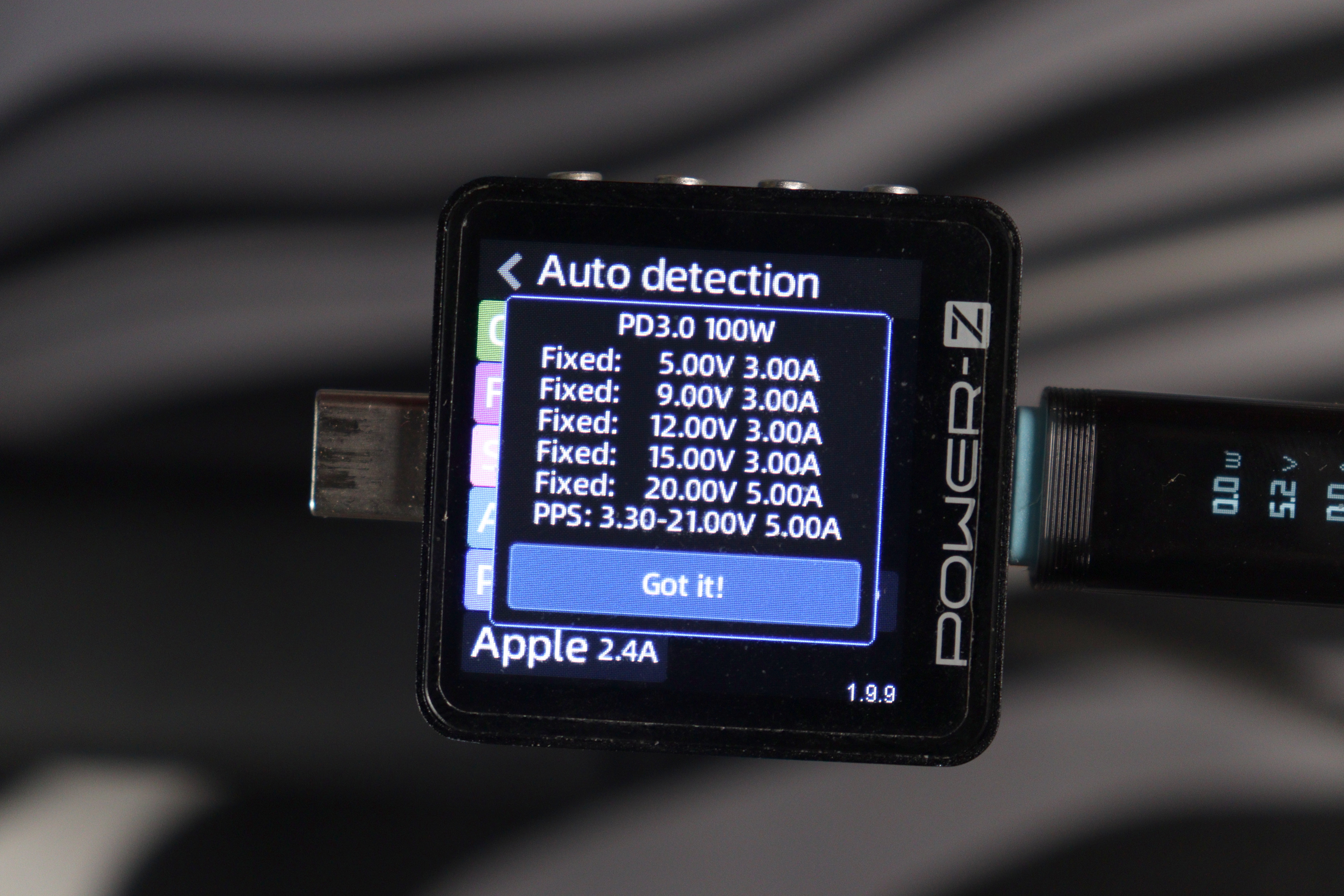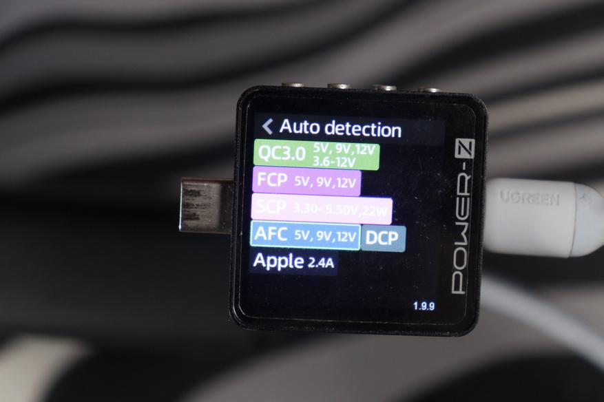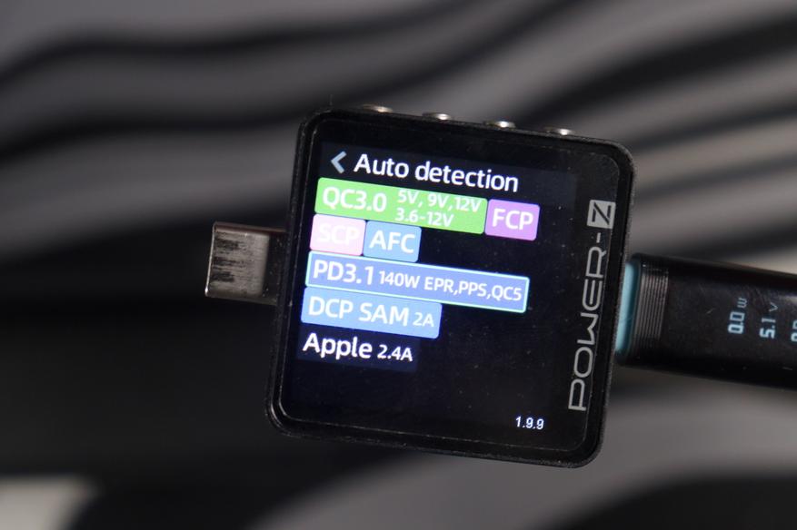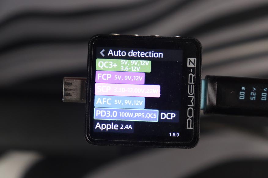Тестирование проводилось анализатором Power-Z в режиме Auto Detection — прибор сам опрашивает зарядник и выводит все поддерживаемые протоколы.