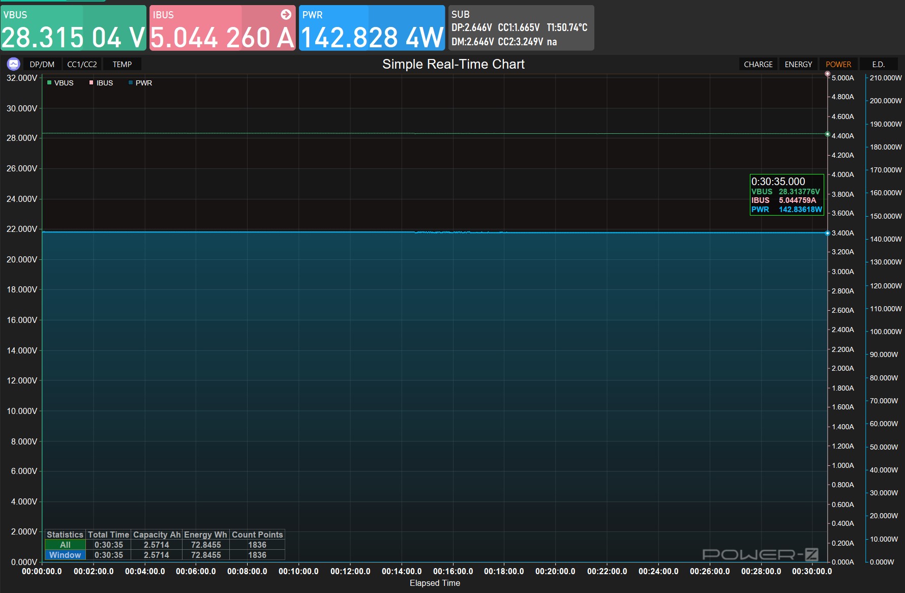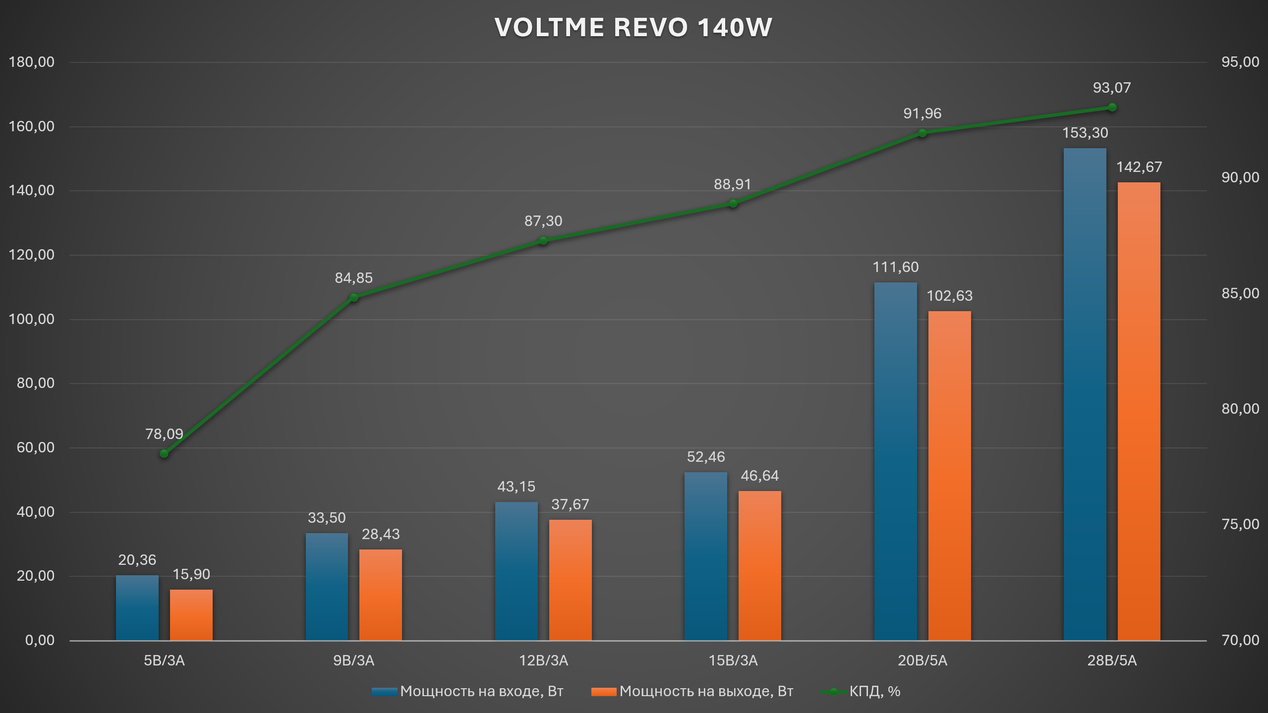 VOLTME Revo 140 прошёл все тесты без единого замечания по стабильности — и это, пожалуй, главное, что нужно знать об этом зарядном устройстве. Далеко не каждый зарядник с заявленными 140W реально держит эту мощность полчаса подряд без троттлинга и перезагрузок портов. Здесь держит: 28.315V и 5.044A на протяжении всего стресс-теста, график — горизонтальная прямая, 72.84 Wh за 30 минут без единого сбоя. КПД в EPR-режиме достигает 93.07%, пульсации на той же нагрузке — всего 29 mV, что неожиданно хорошо для максимального режима. Инженерия здесь честная: зарядник ведёт себя именно так, как написано в спецификации, а не «в идеальных условиях лаборатории производителя».