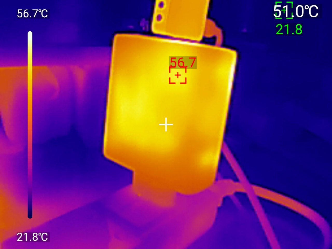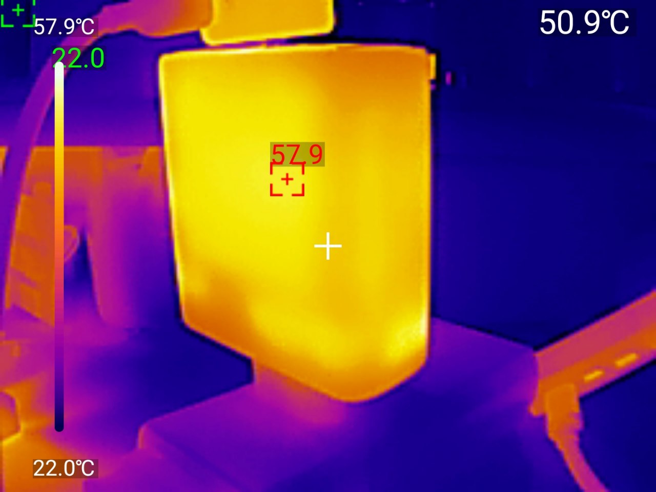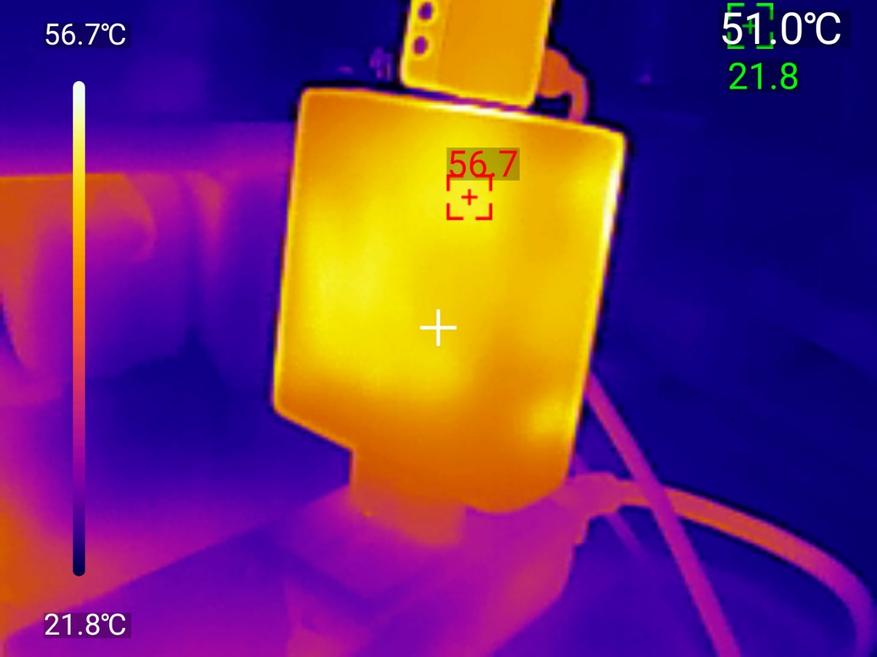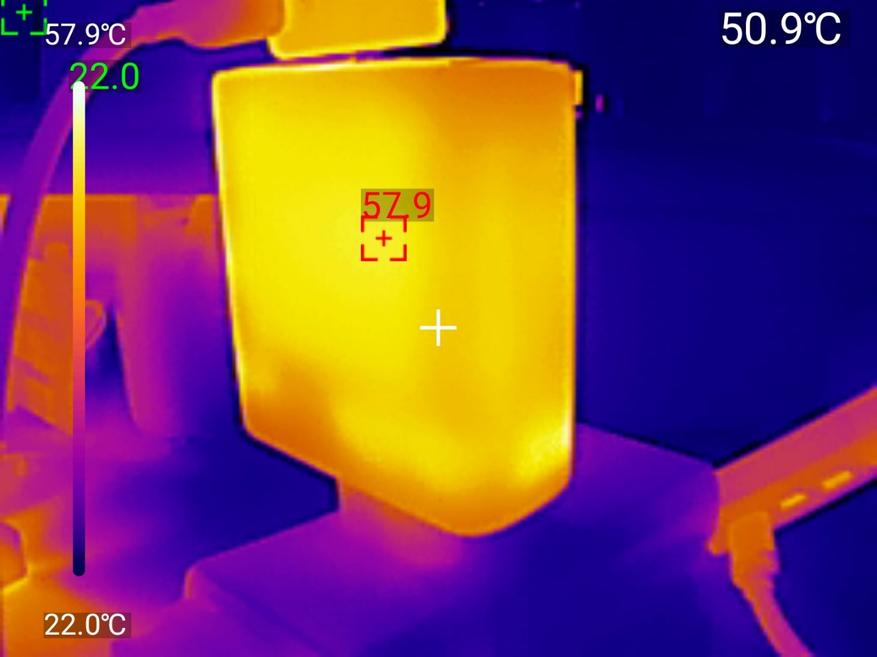 Тепловизор фиксирует нагрев при максимальной нагрузке: горячая точка на передней стороне корпуса — 57.9°C, средняя температура поверхности около 51-54°C, при температуре окружающей среды 22°C. Перегрева нет. 57-58°C на поверхности при 140W — нормальный рабочий диапазон для GaN. Корпус горячий, но не обжигает руку.