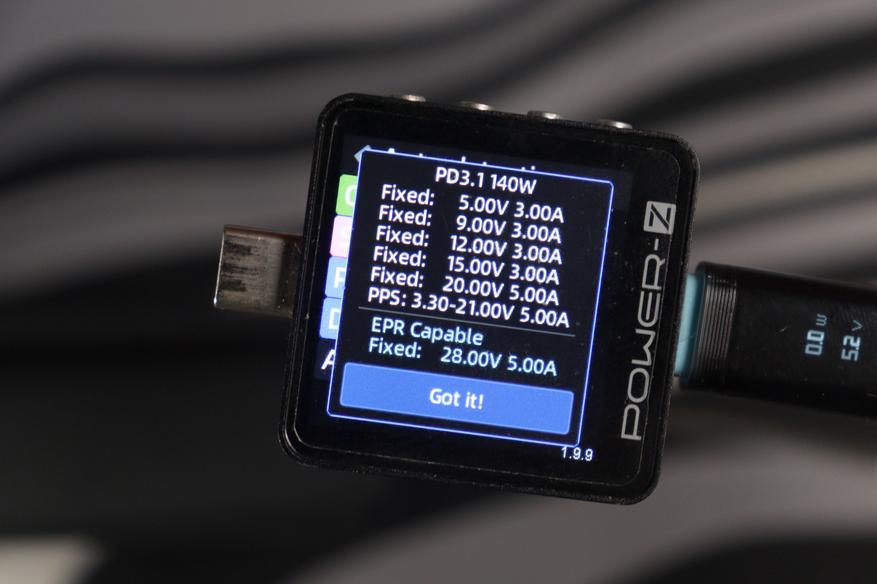 Порт USB-C1 оказался настоящим универсалом. Из протоколов здесь есть всё: QC3.0 с фиксированными ступенями 5V, 9V, 12V и непрерывным диапазоном 3.6-12V, FCP и SCP от Huawei, AFC от Samsung, Apple 2.4A и DCP. И главное — полноценный PD 3.1 140W EPR с PPS и QC5.