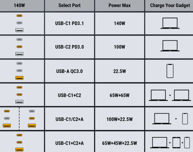В одиночном режиме USB-C1 выдаёт полные 140W через EPR (28V/5A) — это максимум, на который способен зарядник. USB-C2 в одиночку даёт 100W по PD 3.0, USB-A — 22.5W через QC3.0.