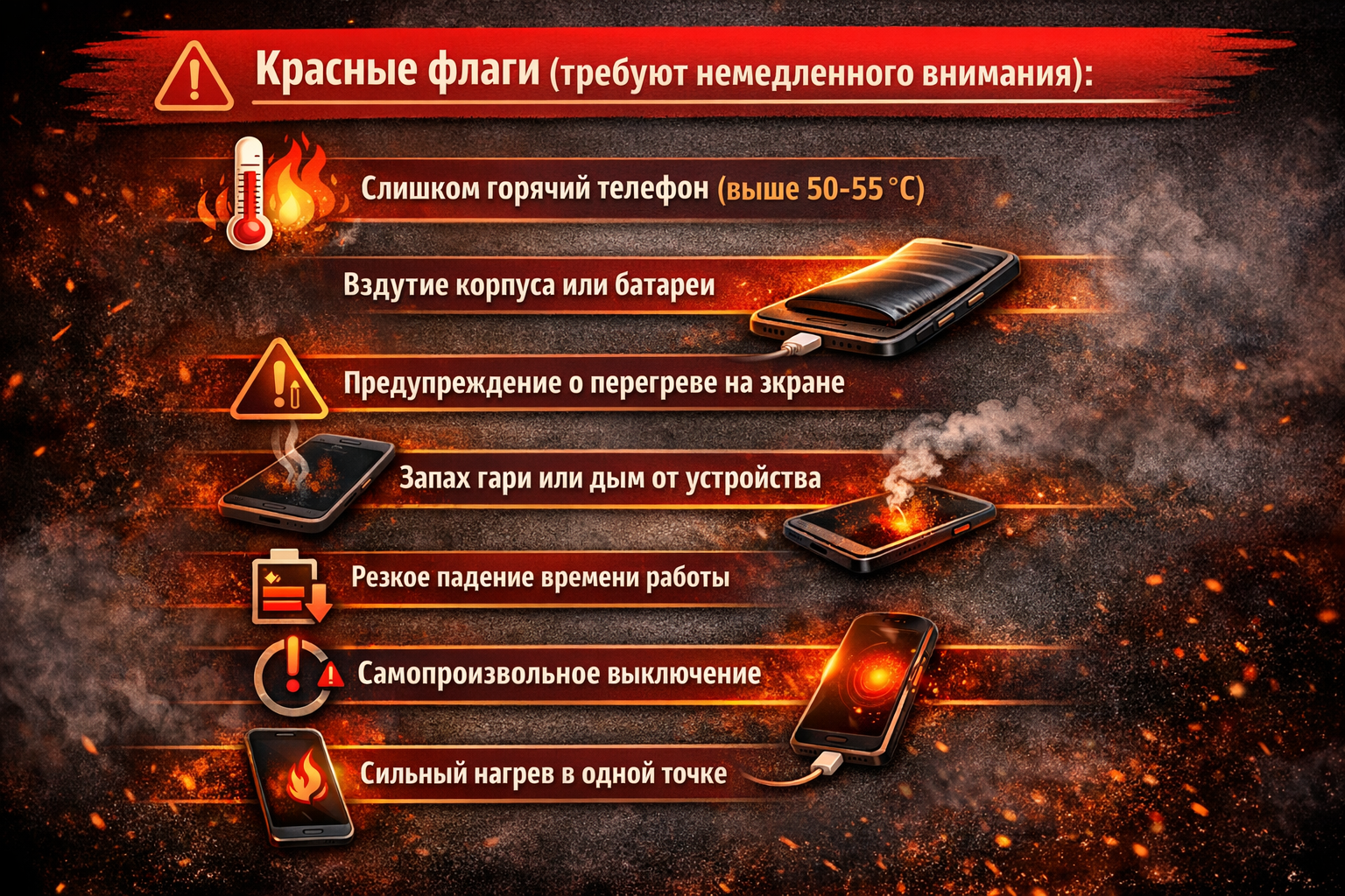 — Вздутие корпуса. Если задняя крышка телефона приподнялась или экран начал отходить от рамки — это критический признак. Внутри батареи происходят химические реакции с выделением газа.