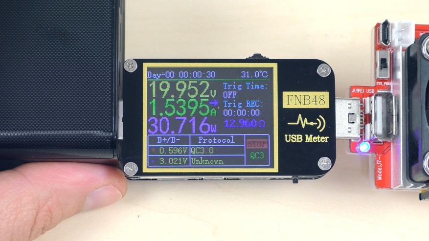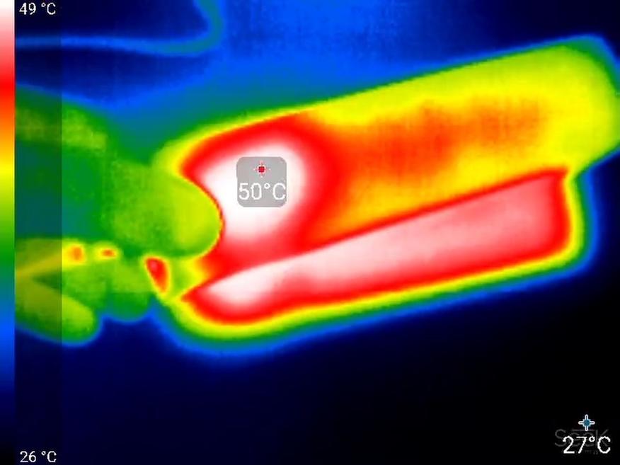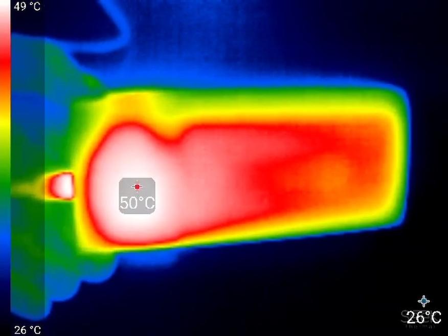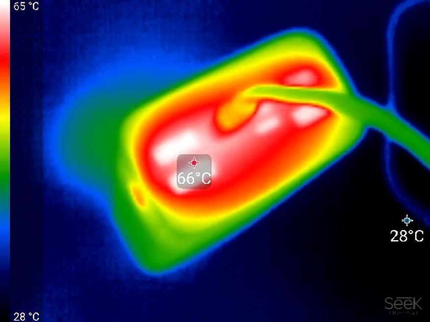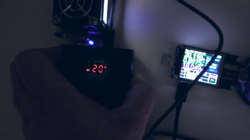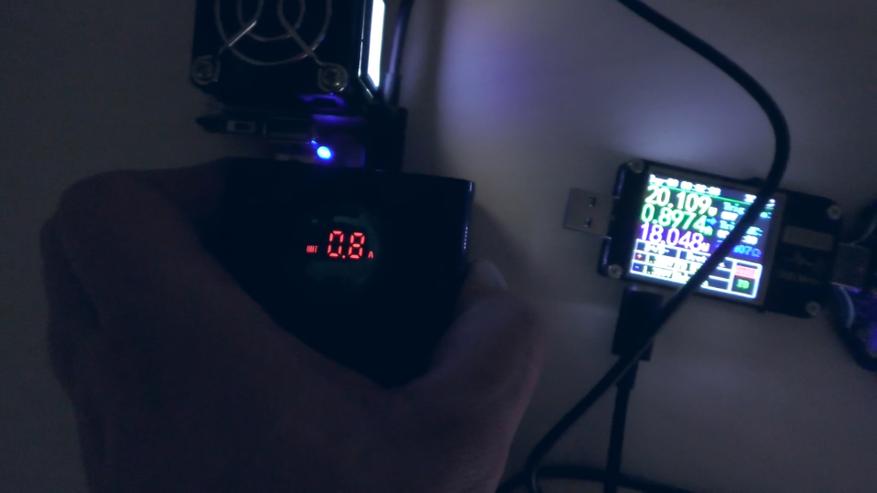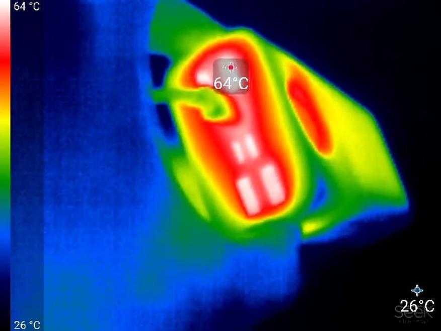 При разрядке на мощности 65 Вт (20 В при 3,25 А) примерно через полчаса устройство снижает напряжение до 5 В (то есть до 18 Вт). Предположительно, срабатывает защита по температуре (термоконтроль), поскольку в этот момент повербанк сильно нагревается. В области преобразователя напряжения корпус разогревается до 50 °C.