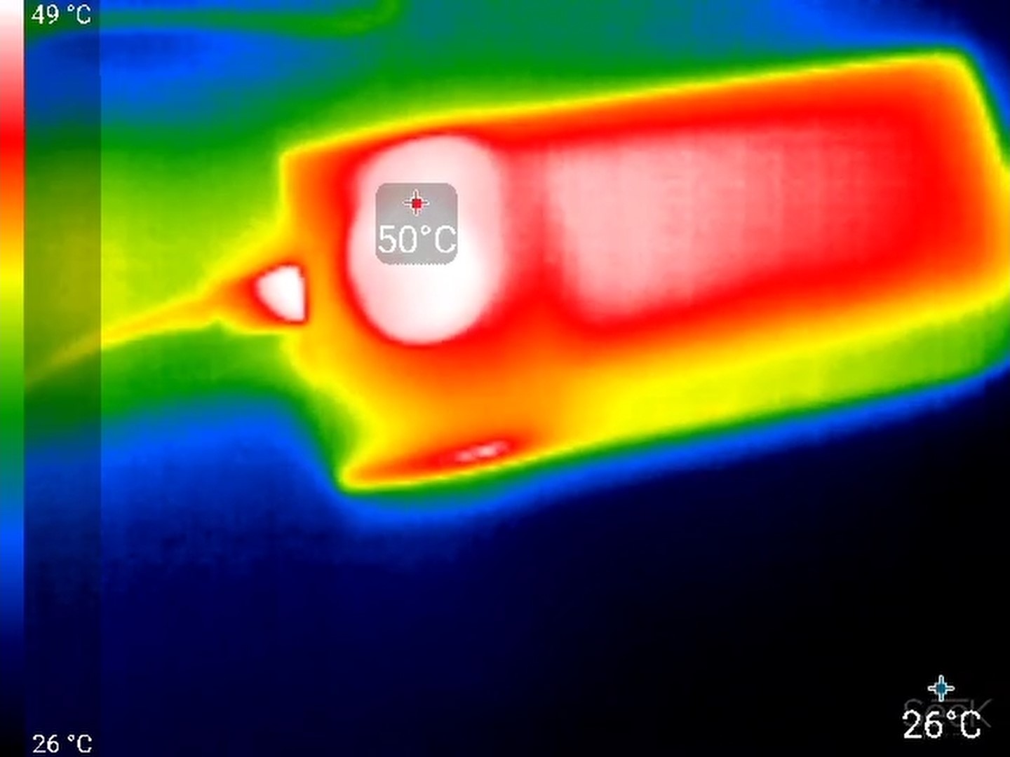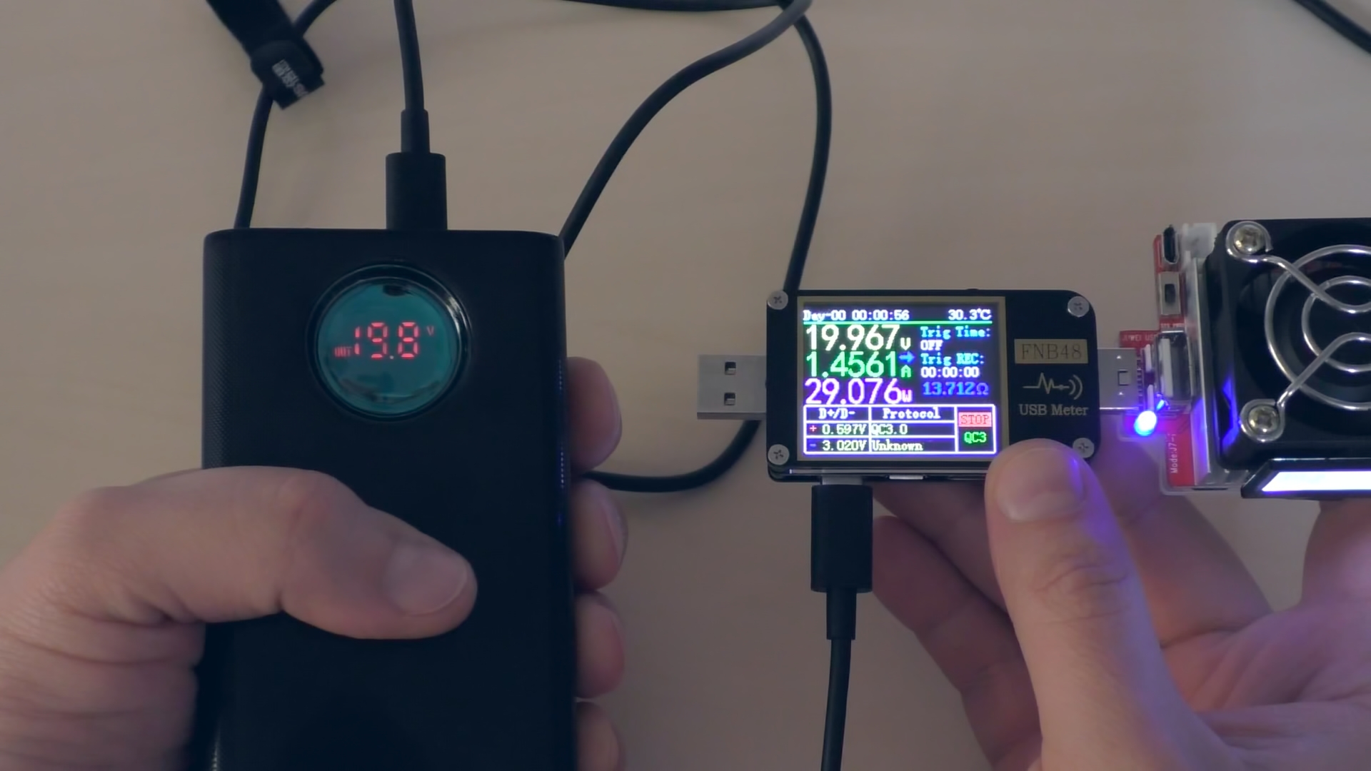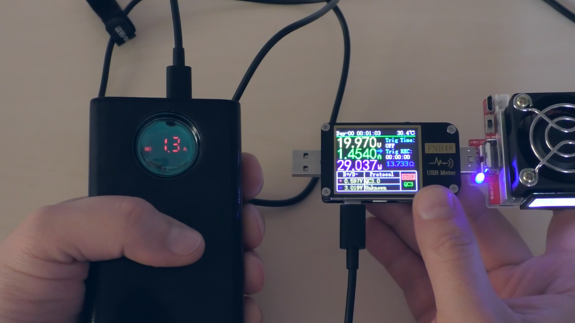 При разрядке на мощности 65 Вт (20 В при 3,25 А) примерно через полчаса устройство снижает напряжение до 5 В (то есть до 18 Вт). Предположительно, срабатывает защита по температуре (термоконтроль), поскольку в этот момент повербанк сильно нагревается. В области преобразователя напряжения корпус разогревается до 50 °C.