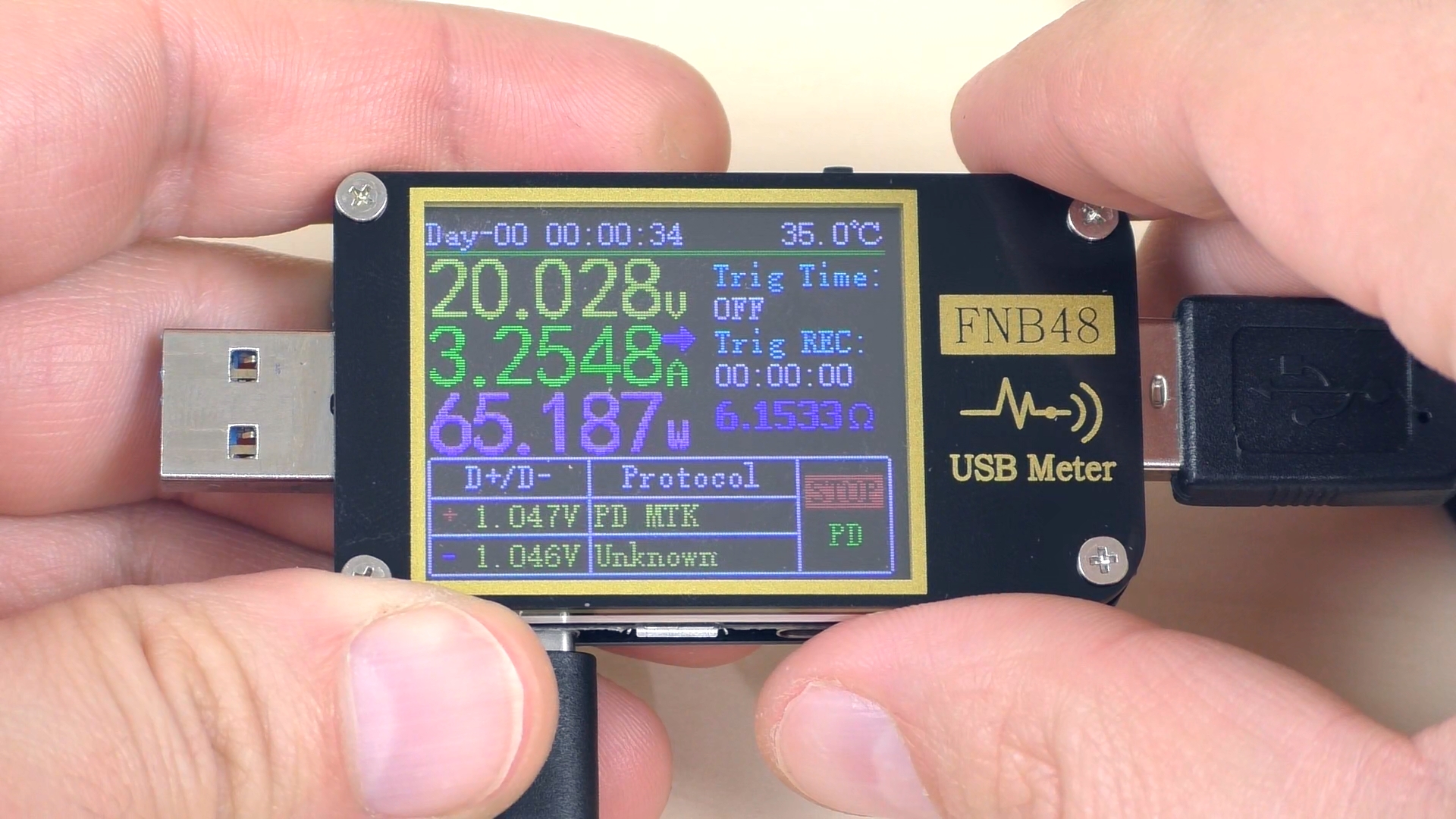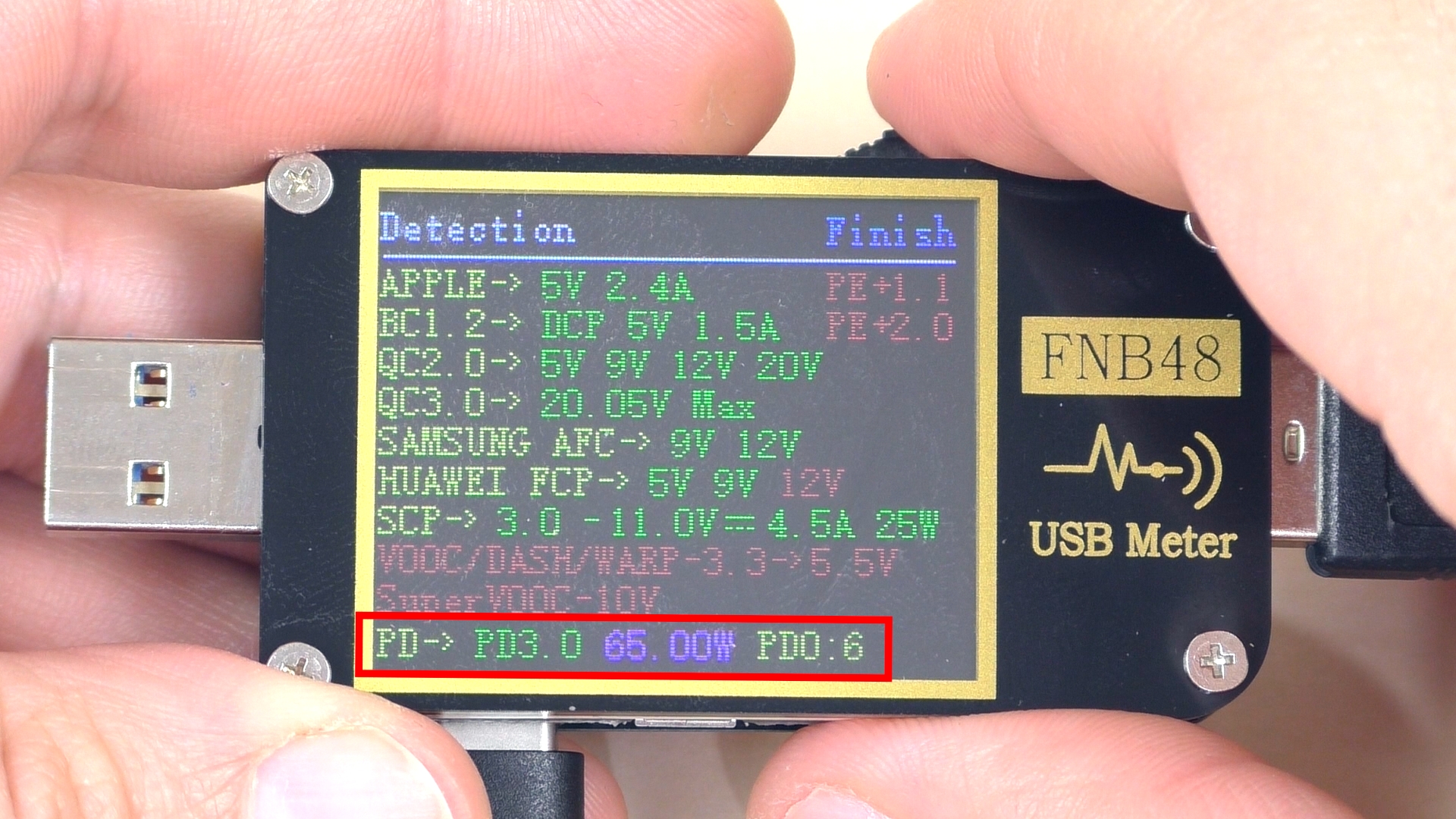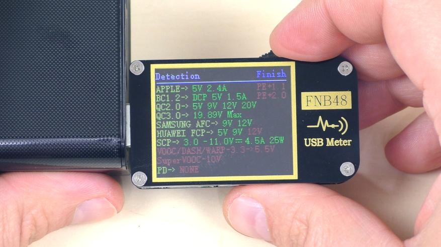 При сканировании последнего (пятого) USB Type‑C‑порта тестер выявил те же протоколы, что и на предыдущем USB‑A‑порту с поддержкой быстрой зарядки. Дополнительно обнаружен протокол Power Delivery 3.0 с мощностью до 65 Вт.