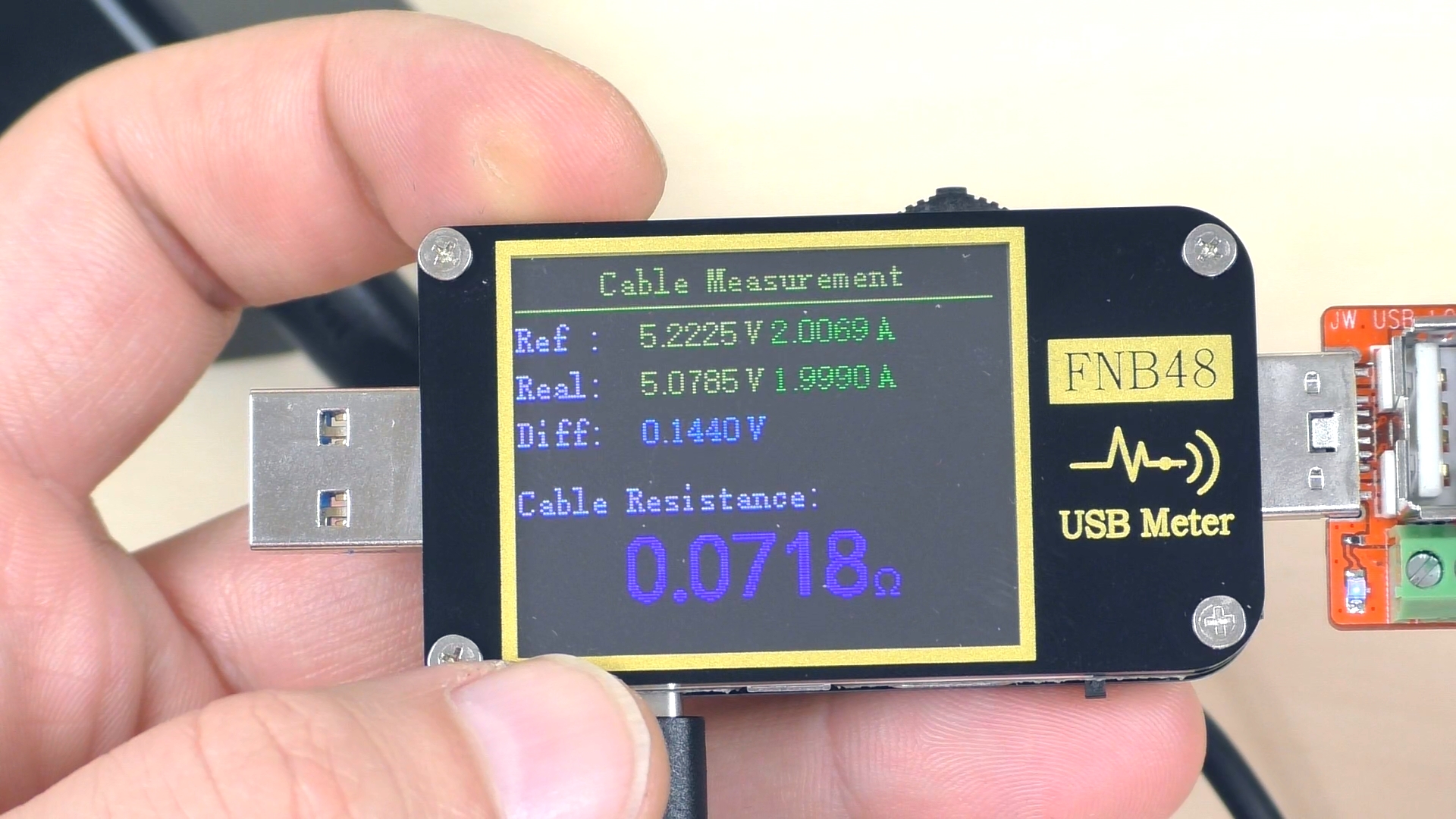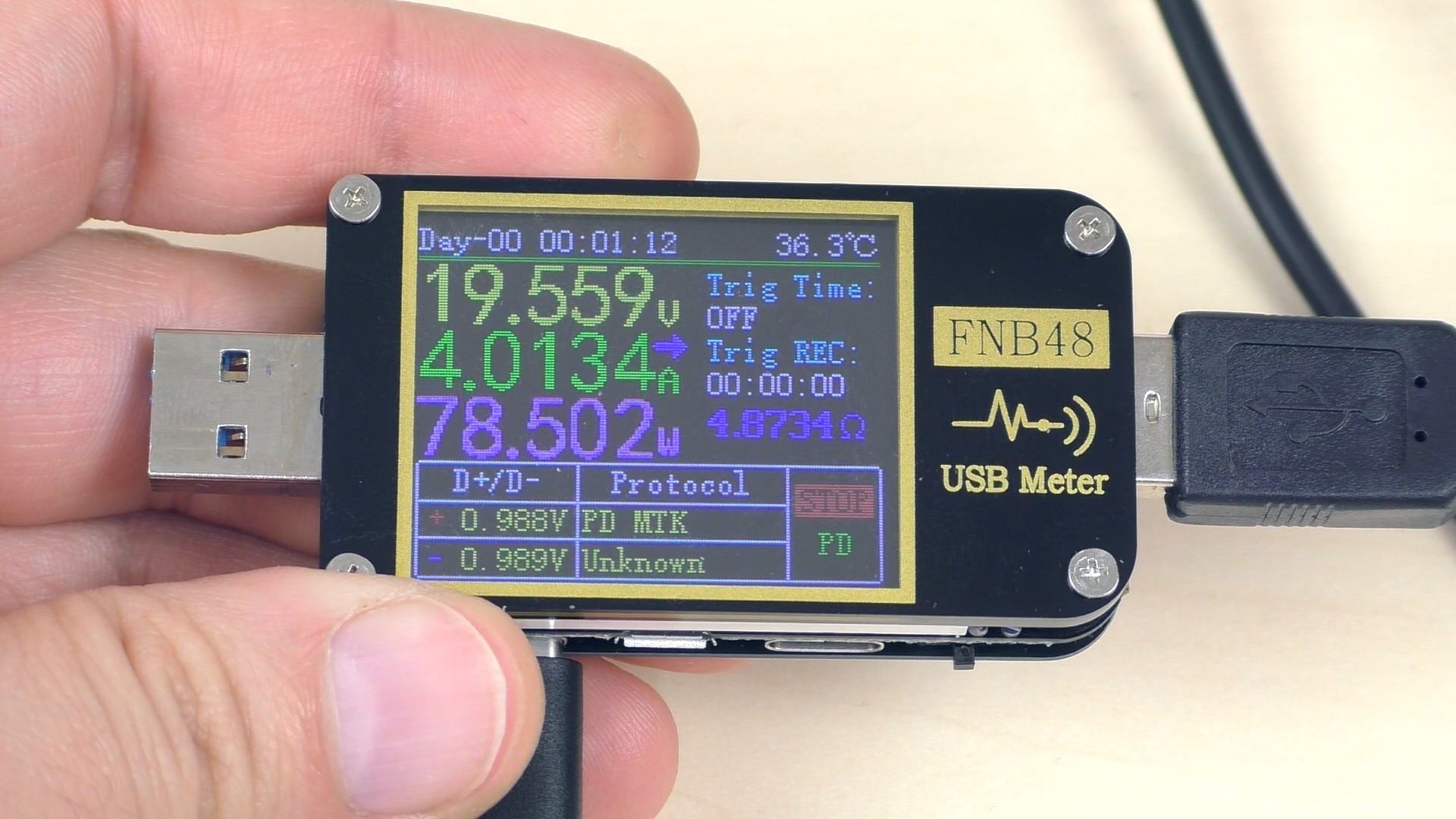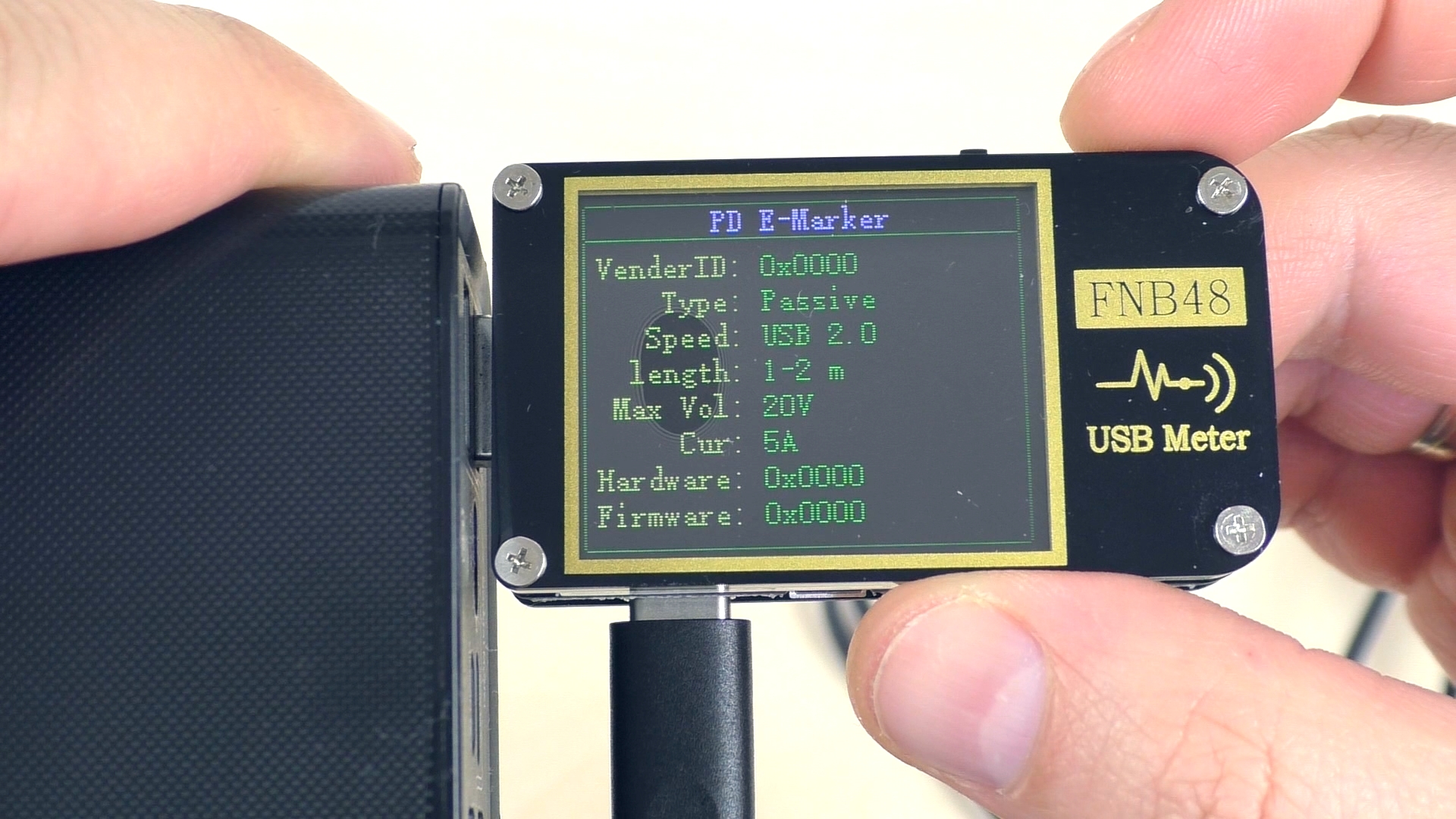 Также тестер обнаружил в кабеле чип e‑маркер. Согласно его данным, кабель способен выдерживать напряжение 20 В и ток 5 А, что соответствует заявленной мощности 100 Вт. Таким образом, кабель полностью соответствует требованиям и идеально подходит для использования с данным повербанком при различных уровнях мощности.