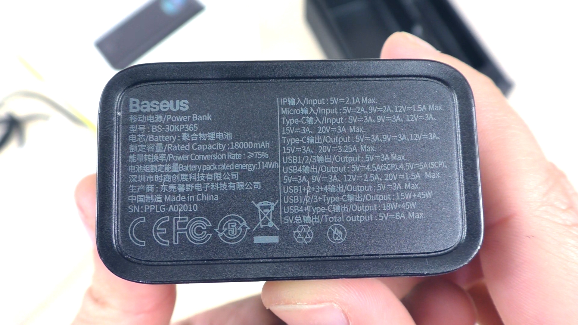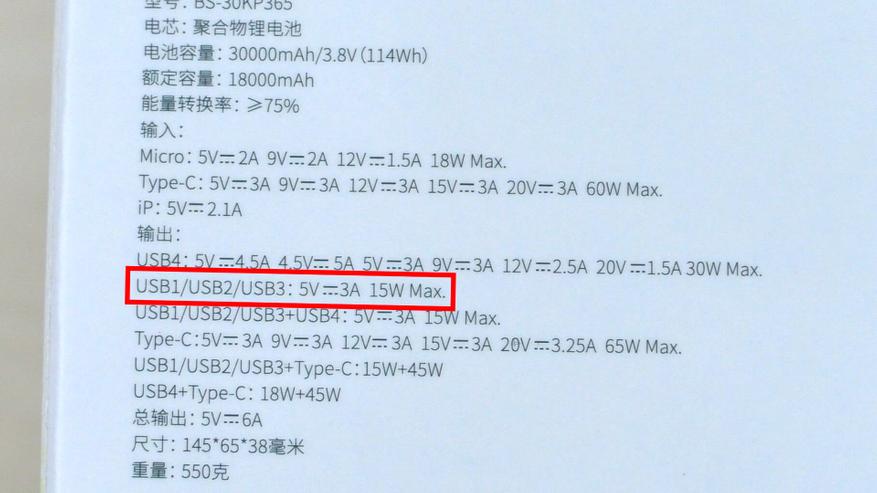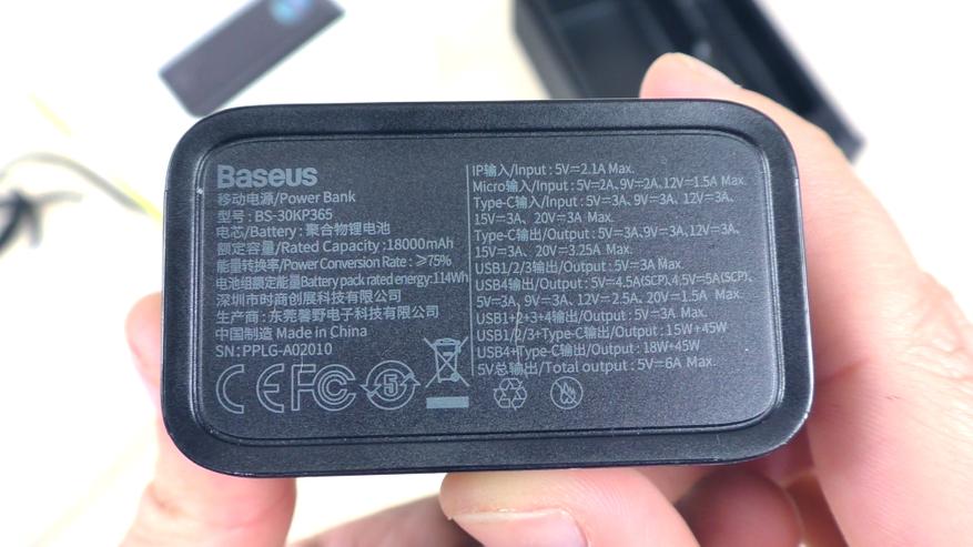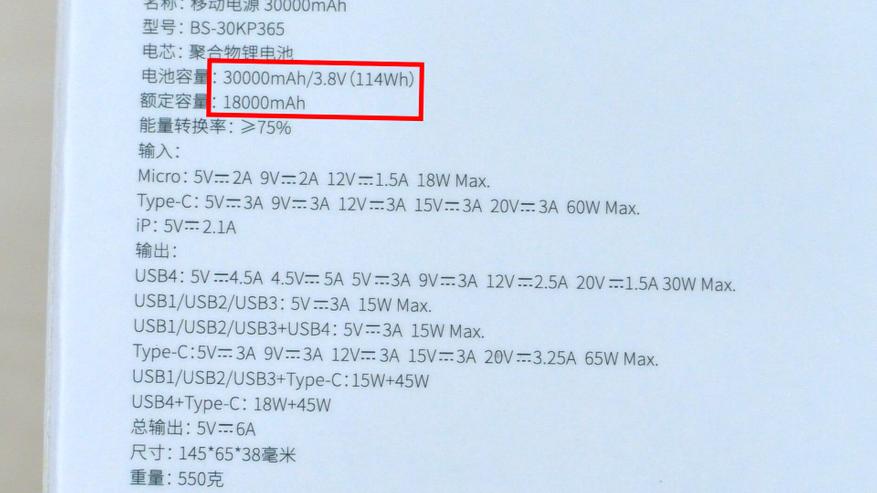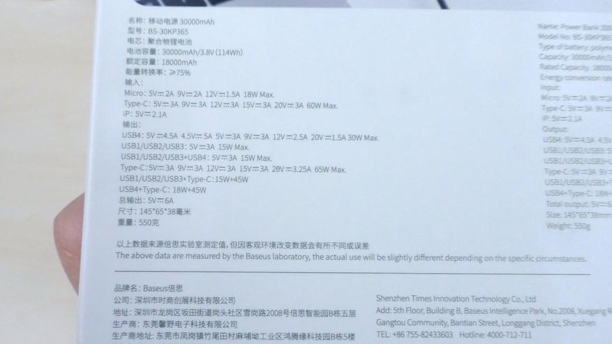 Ёмкость аккумулятора повербанка заявлена как 30 000 мА·ч. Это значение относится непосредственно к аккумулятору с номинальным напряжением 3,8 В. Если измерять ёмкость через 5‑вольтовый USB‑порт, значение составит 18 000 мА·ч — эта информация также указана на упаковке и в инструкции. При разных напряжениях показатели ёмкости в мА·ч будут различаться. Для унификации измерений при различных напряжениях используют величину в ватт‑часах (Вт·ч). В инструкции ёмкость заявлена как 114 Вт·ч.