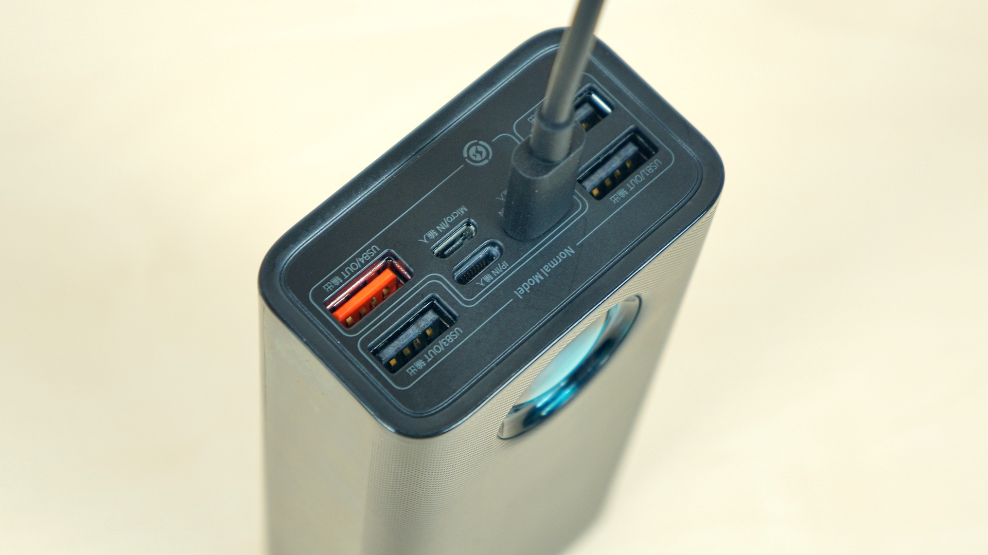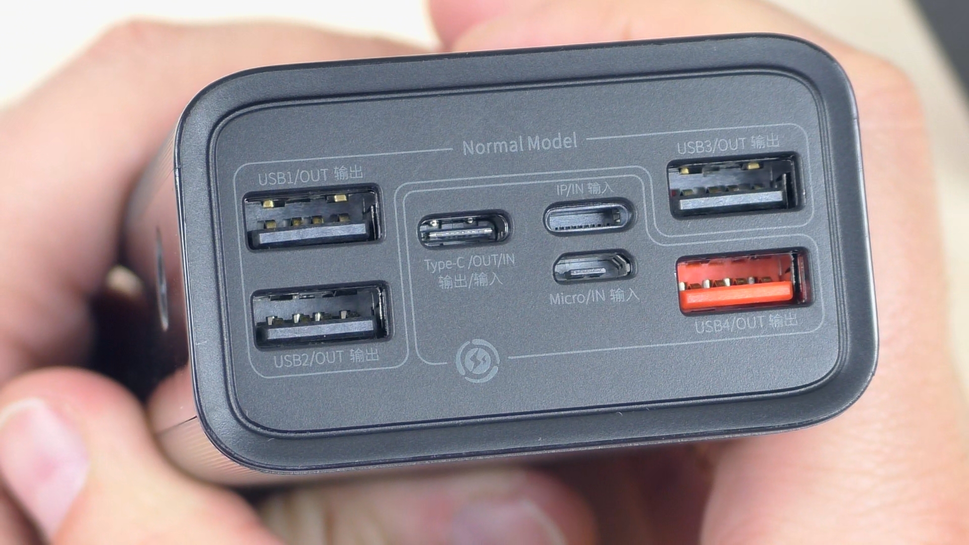 Особого внимания заслуживает порт USB Type‑C: он работает как на вход, так и на выход. Его ключевая особенность — способность передавать и принимать мощность до 65 Вт. Благодаря этому повербанк может заряжаться при напряжении 20 В и токе более 3 А, что сокращает время зарядки его емкого аккумулятора до пары часов. Кроме того, устройство оснащено 4 классическими портами USB A, один из которых поддерживает технологию быстрой зарядки.