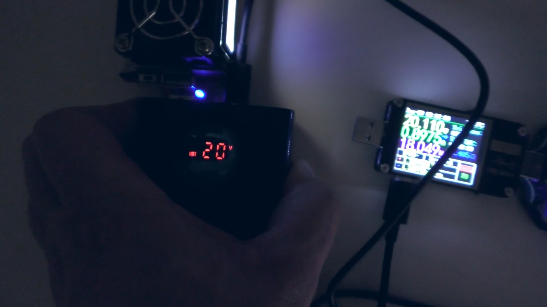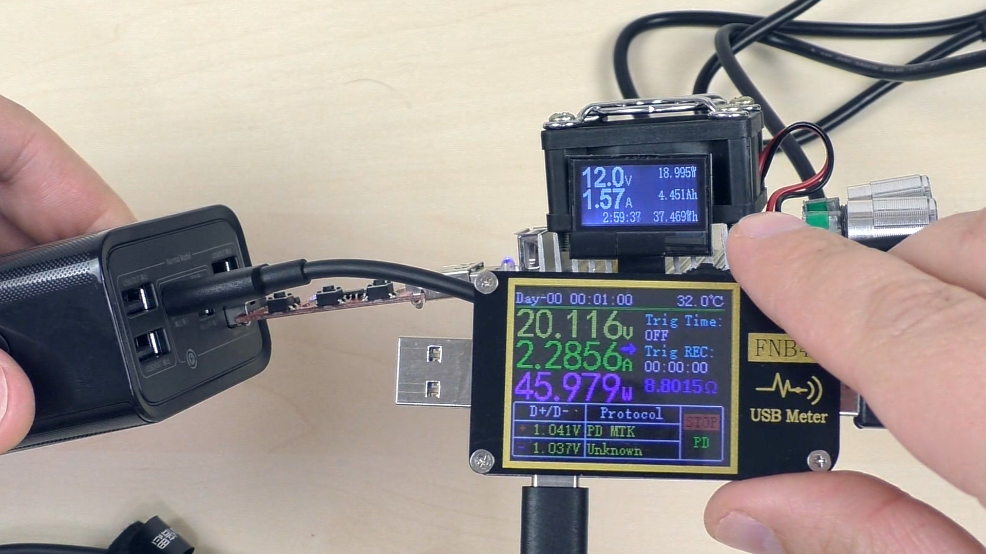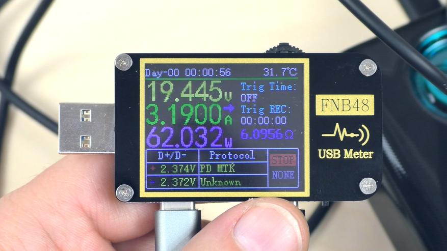 Вот показания в момент зарядки повербанка, снятые с помощью более точного USB‑тестера: напряжение — 19,5 В, ток — почти 3,2 А, суммарная мощность — 62 Вт.