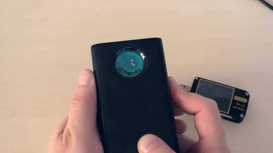 Вернёмся к тесту ёмкости. При критически низком уровне заряда аккумулятора индикатор начинает мигать, предупреждая об этом. Когда устройство полностью разряжается, экран выключается. Если в этом состоянии нажать кнопку, на экране начнёт мигать цифра «0» — это означает, что повербанк полностью разряжен.