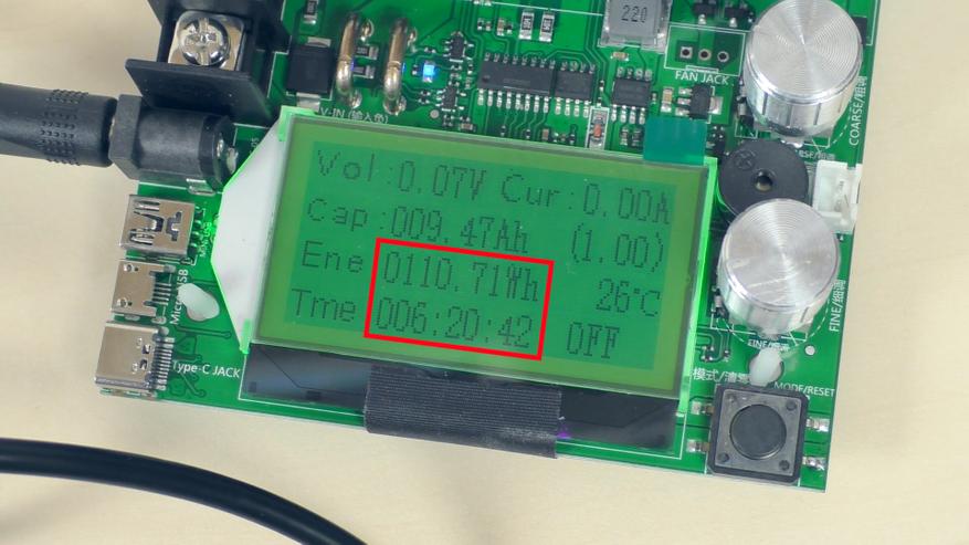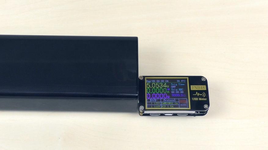 При разрядке повербанка на мощности 18 Вт (от 100 % до 0 %) процесс занял 6 часов 20 минут. За это время было отданно около 111 Вт·ч при заявленной ёмкости 114 Вт·ч. С учётом потерь в кабелях и погрешности измерительной нагрузки можно заключить, что производитель не завысил характеристики. Отклонение от заявленной ёмкости составило около 3 %, что находится в пределах допустимой погрешности.