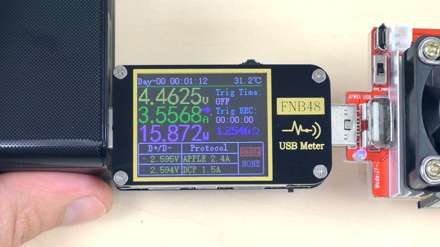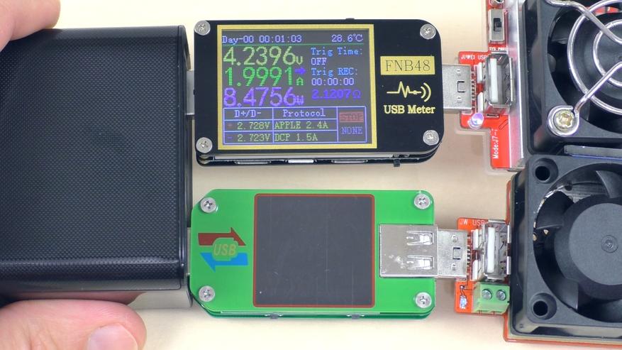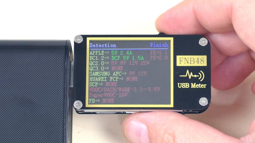 В отличие от трёх предыдущих стандартных USB‑A‑портов, четвёртый USB‑A‑порт поддерживает быструю зарядку. Тестер показал следующее: порт поддерживает стандарты BC 1.2 и Apple, а также протоколы быстрой зарядки: