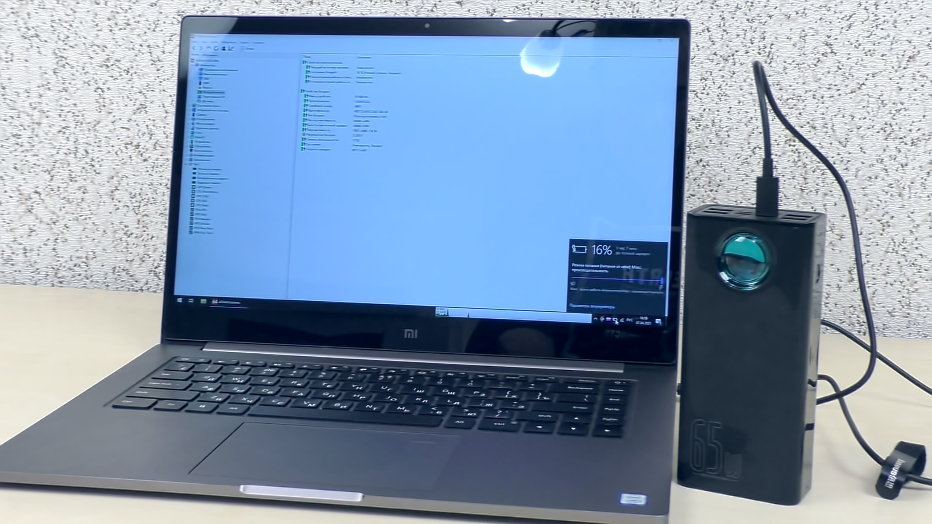 Повербанк нагревается аналогичным образом и в процессе зарядки при мощности 65 Вт. Если использовать зарядное устройство мощностью 10 Вт, корпус практически не нагревается, однако время зарядки становится крайне продолжительным. При работе на максимальной мощности устройство заряжается значительно быстрее, но при этом ощутимо нагревается, но защита не срабатывает и мощность не снижается.